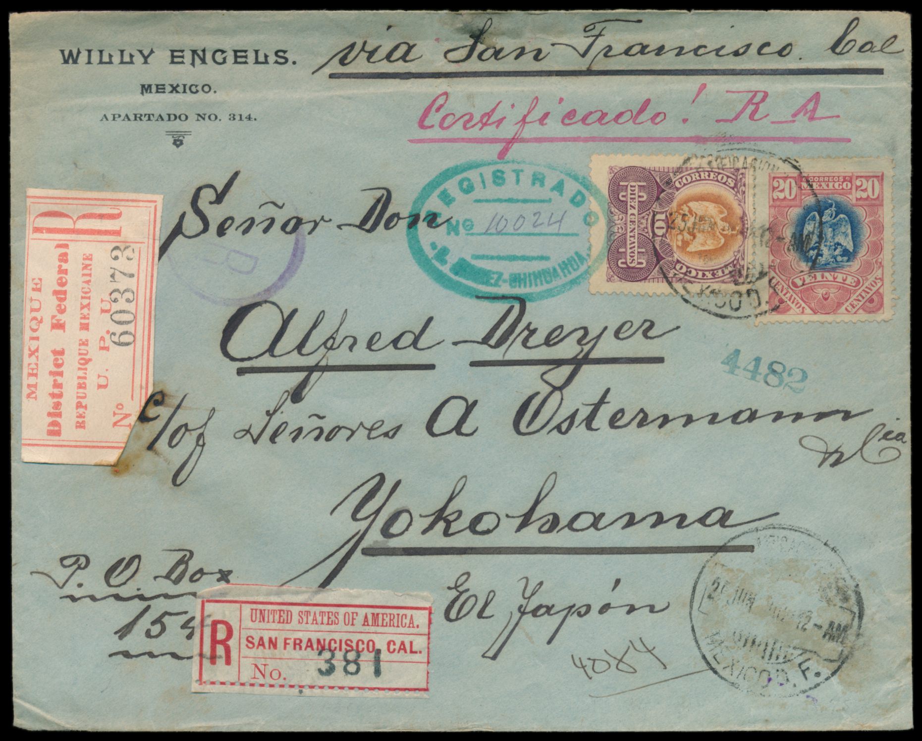 Rückschein-Umschlag von Ciudad Juarez 31.8.97 nach Deutschland, R-Ovalstempel Registrado C. Juarez Chihuahua und Kreisstempel "AR" , mexikanischer U.P.U.-R-Zettel, rückseitig Durchgangsstempel El Paso 4.9.1897 und New York 9.9.1897, Exchange-R-Zettel New York, roter L1 Rückschein und Ankunftsstempel Wiesbaden 19.9.97