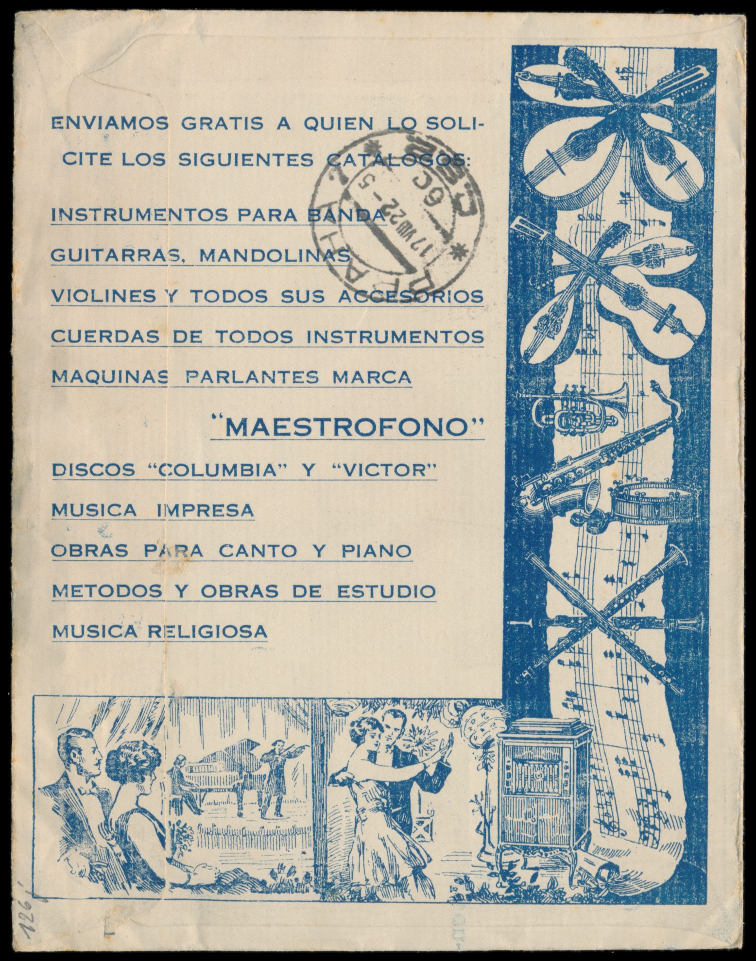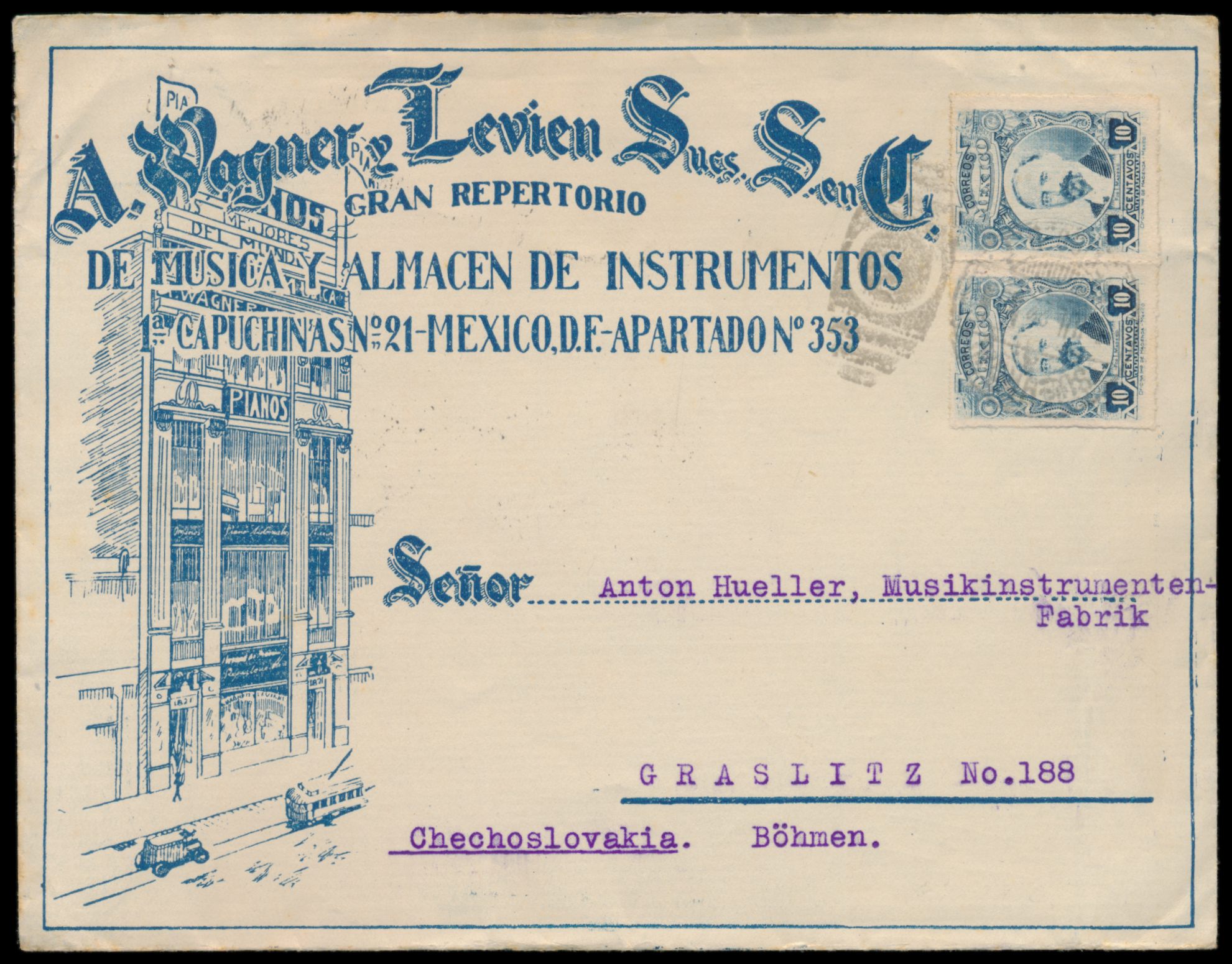 2 x 10 C. auf beidseitig bedrucktem Reklameumschlag "A. Wagner y Levien ... Musica y Almacen de Instrumentos ..." mit Abbildung verschiedener Musikinstrumente und Noten, Stempel Mexico 7.7.1922, nach Prag, Ankunftstempel 17.7.22