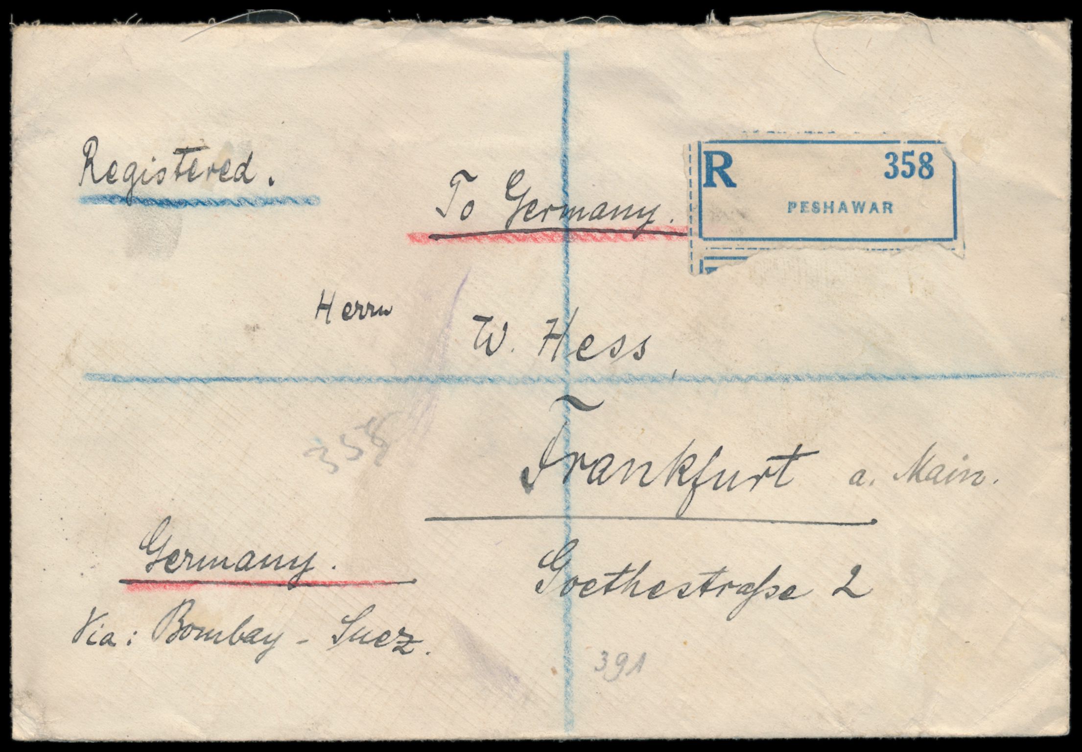 Ausgabe 1927: Viererblock und Paar 15 Pl. und 3 x 30 Pl. mit verschiedenen Entwertungen rückseitig auf Einschreibbrief mit Absenderangabe "... German Legation, Kabul ..." "via Bombay - Suez" nach Deutschland, Indien-Frankatur 3 x 1/2 A., 1 A., 2 A. und 3 A. mit Stempel und R-Zettel Peshawar, Ankunftstempel Frankfurt 31.12.27, Bedarf