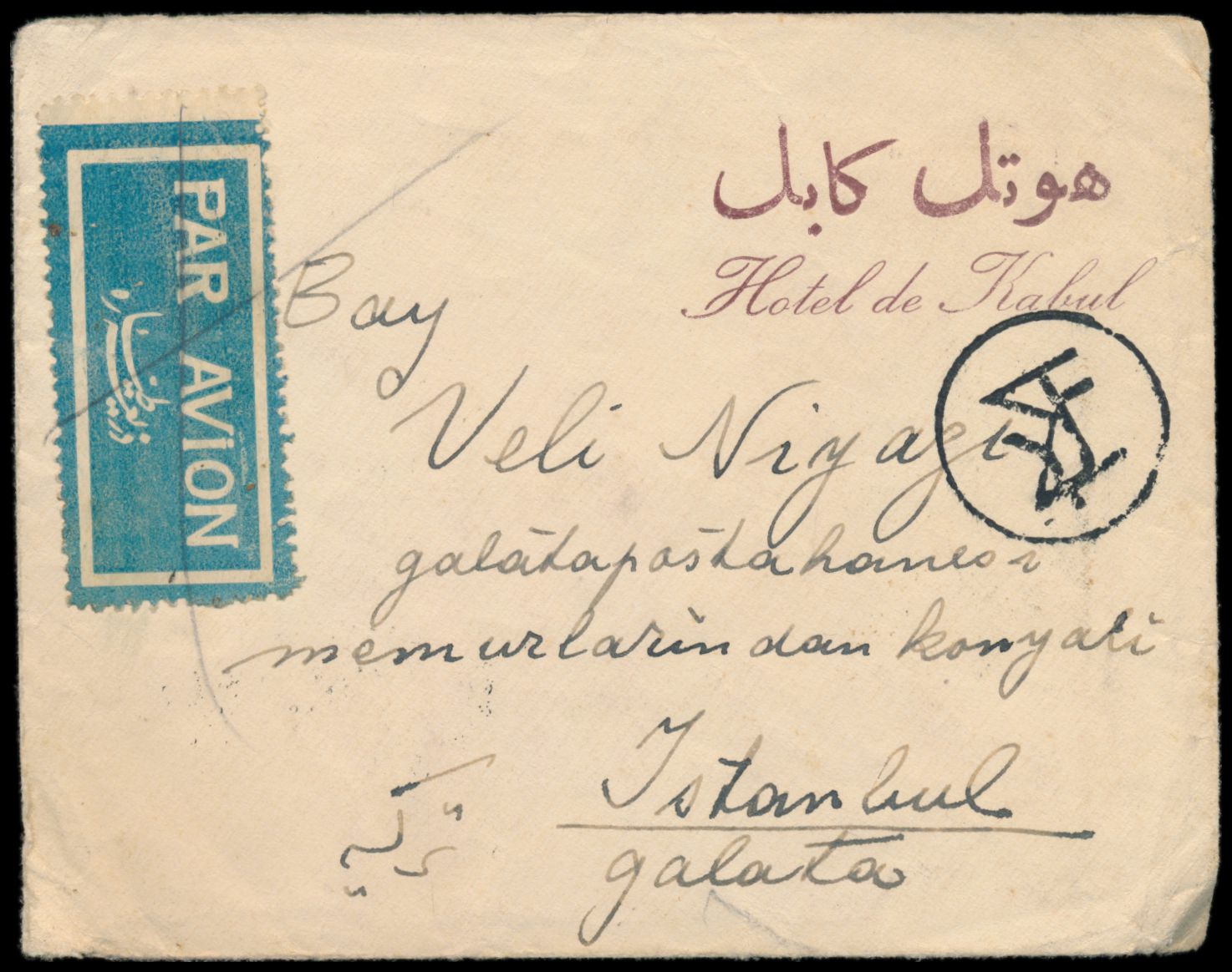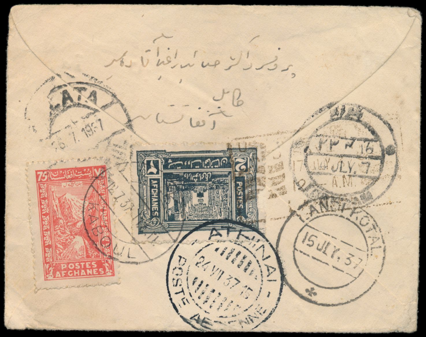 Landesansichten 2 A. (beschädigt) und 75 Pl. (1934) rückseitig auf Luftpostbrief mit Stempel Kaboul 12.7.37 über Indien nach Istanbul, mehrere indische Durchgangsstempel und Athen 24.7.37, Ankunftstempel Galata 26.7.37, Bedarf