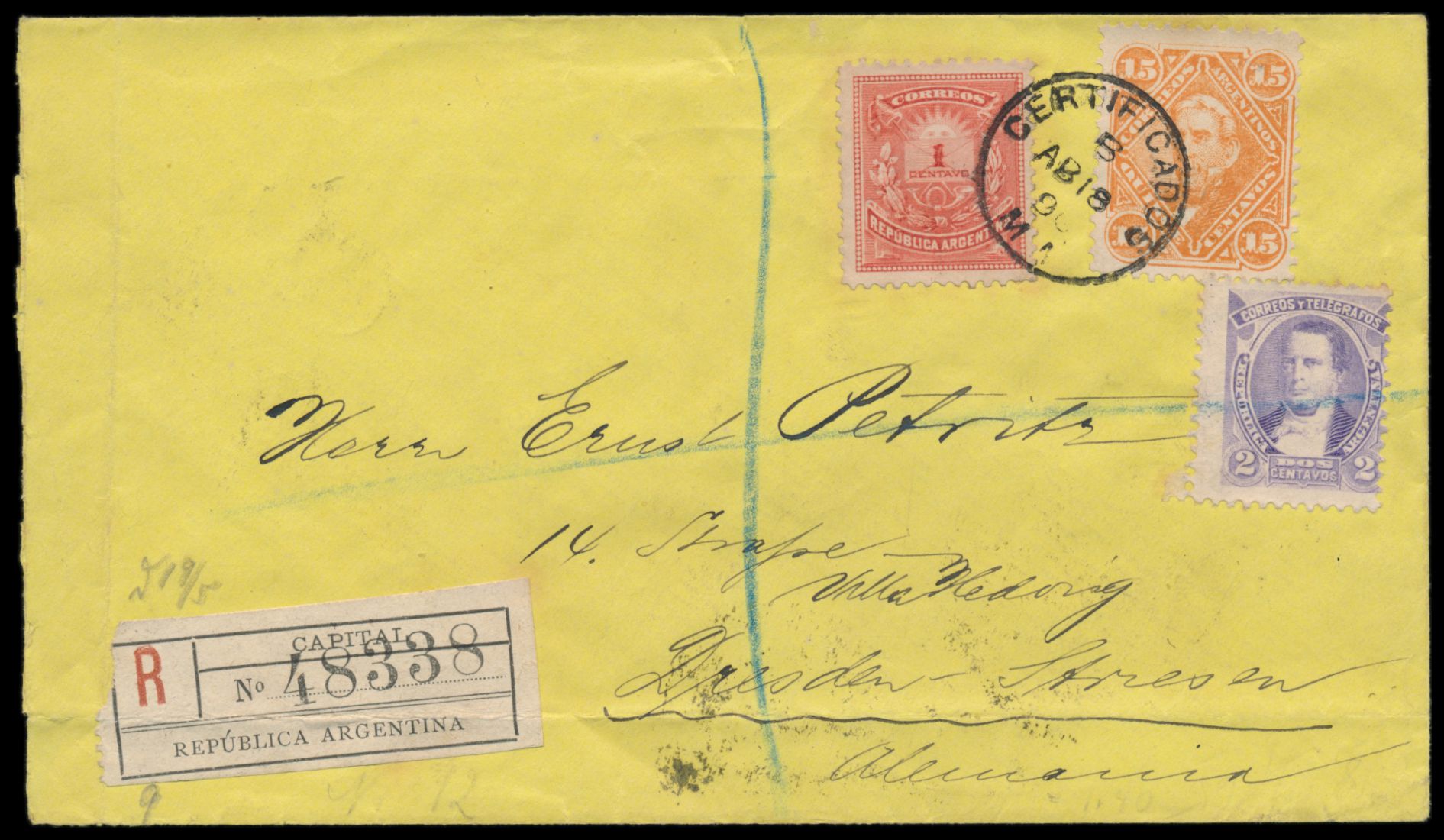 1 C. (1882), 15 C. (1887) und 2 C. (1890) auf Einschreibbrief mit Stempel Certificados M. A. 18.4.90 und frühem R-Zettel "Capital" nach Deutschland, Ankunftstempel Dresden 19.5.90