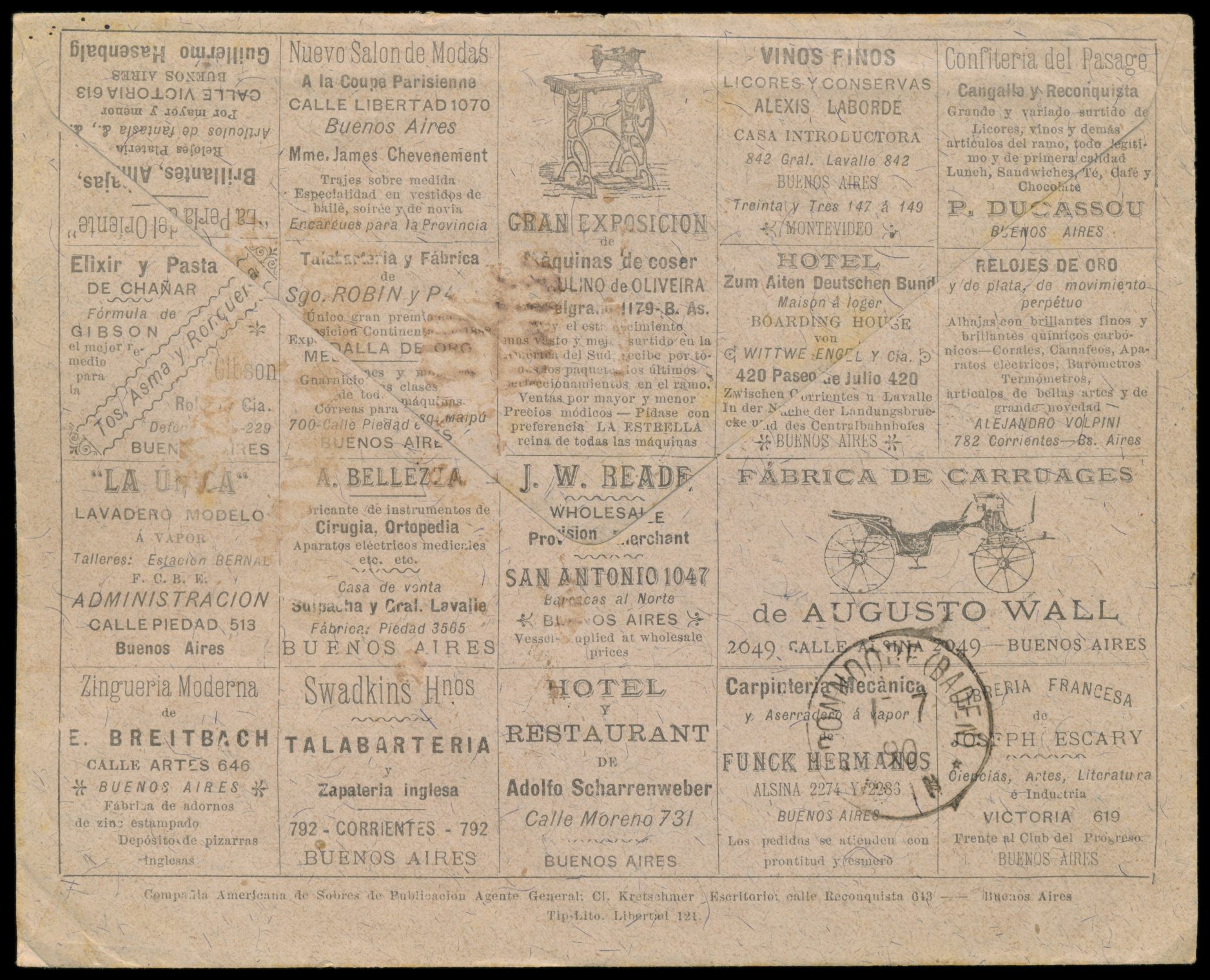 3 C. und 5 C. auf Anzeigenumschlag mit rückseitig 17 verschiedenen Firmen und vorderseitigem Absenderzudruck "Hotel Zum Alten Deutschen Bund", Druckvermerk "Compania Americana de Sobres de Publicacion ...", Stempel Buenos Aires 20.6.90, nach Deutschland, Ankunftstempel Bonndorf (Baden) 17.7.90