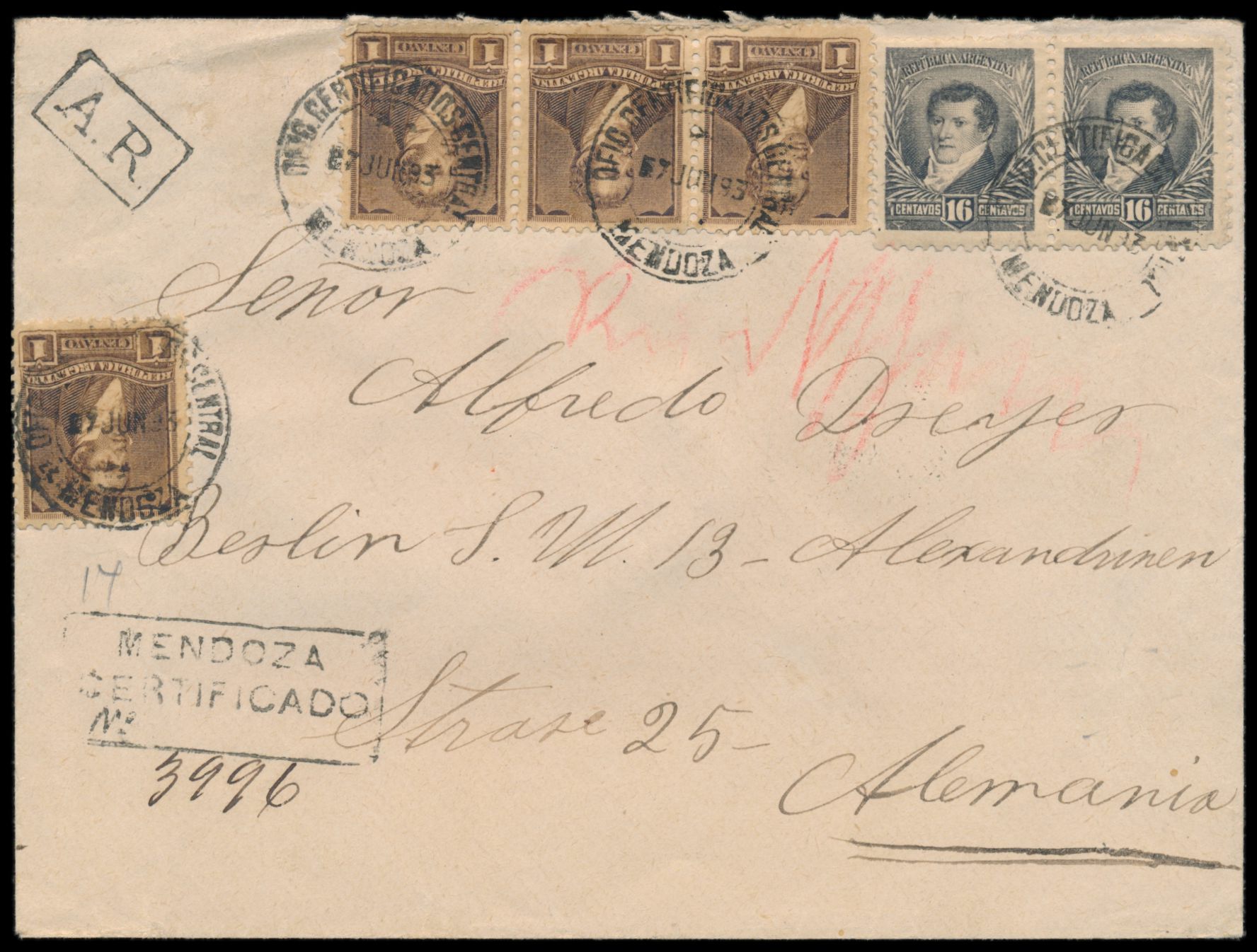 Ausgabe 1892: 4 x 1 C. und 2 x 16 C. auf R-Rückschein-Brief mit Stempel Mendoza 7.6.93 nach Deutschland, R-Stempel und Stempel A.R., Ankunftstempel Berlin 10.7.93, Bedarf