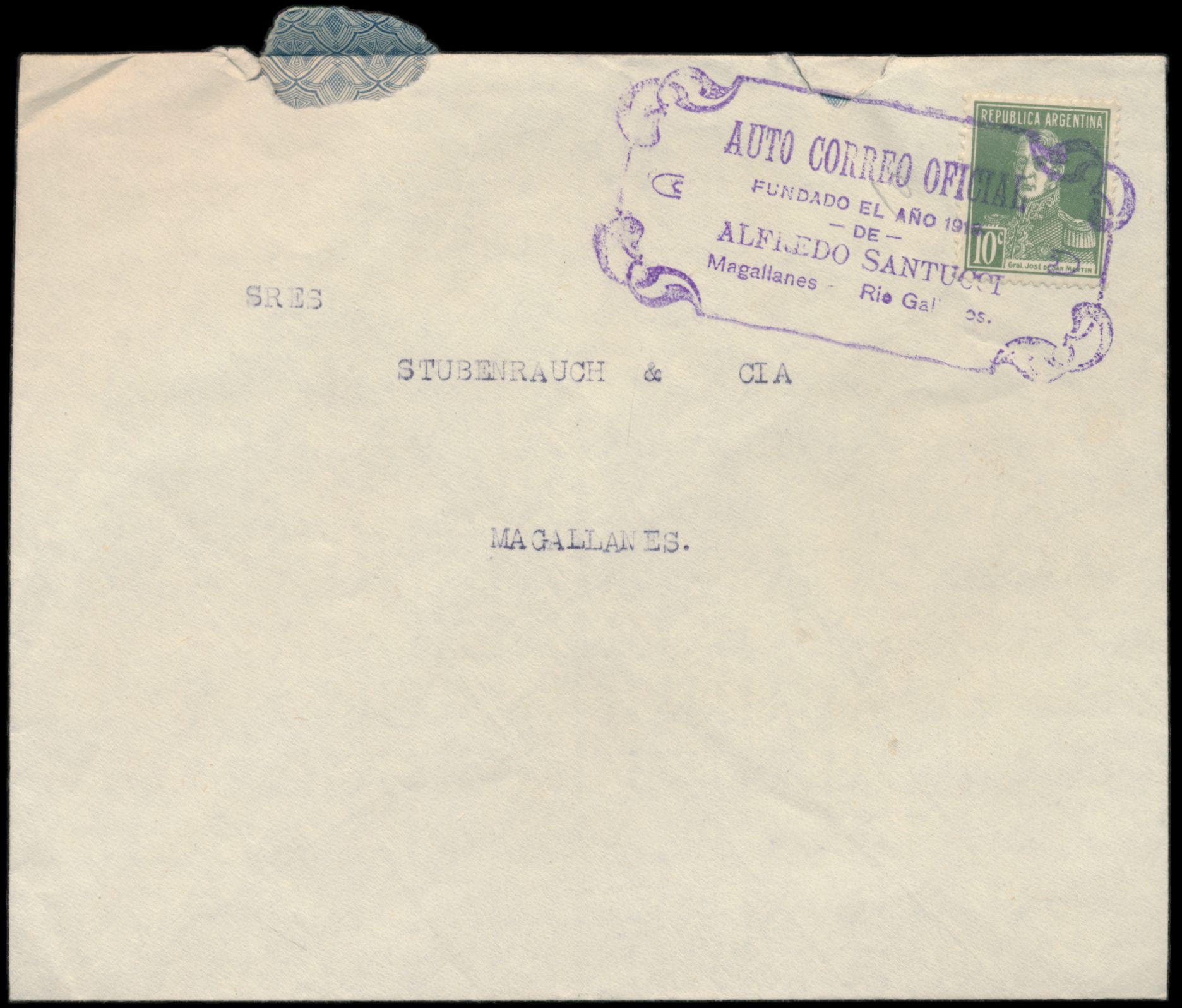 Autopost Rio Gallegos - Magallanes: 10 C. San Martin auf Brief der "Banco Anglo-Sud Americano" in Rio Gallegos nach Magallanes, entwertet mit violettem Stempel Auto Correio Official / ... Alfredo Santucci / Magallanes - Rio Gallegos, ca. 1932, Bedarf