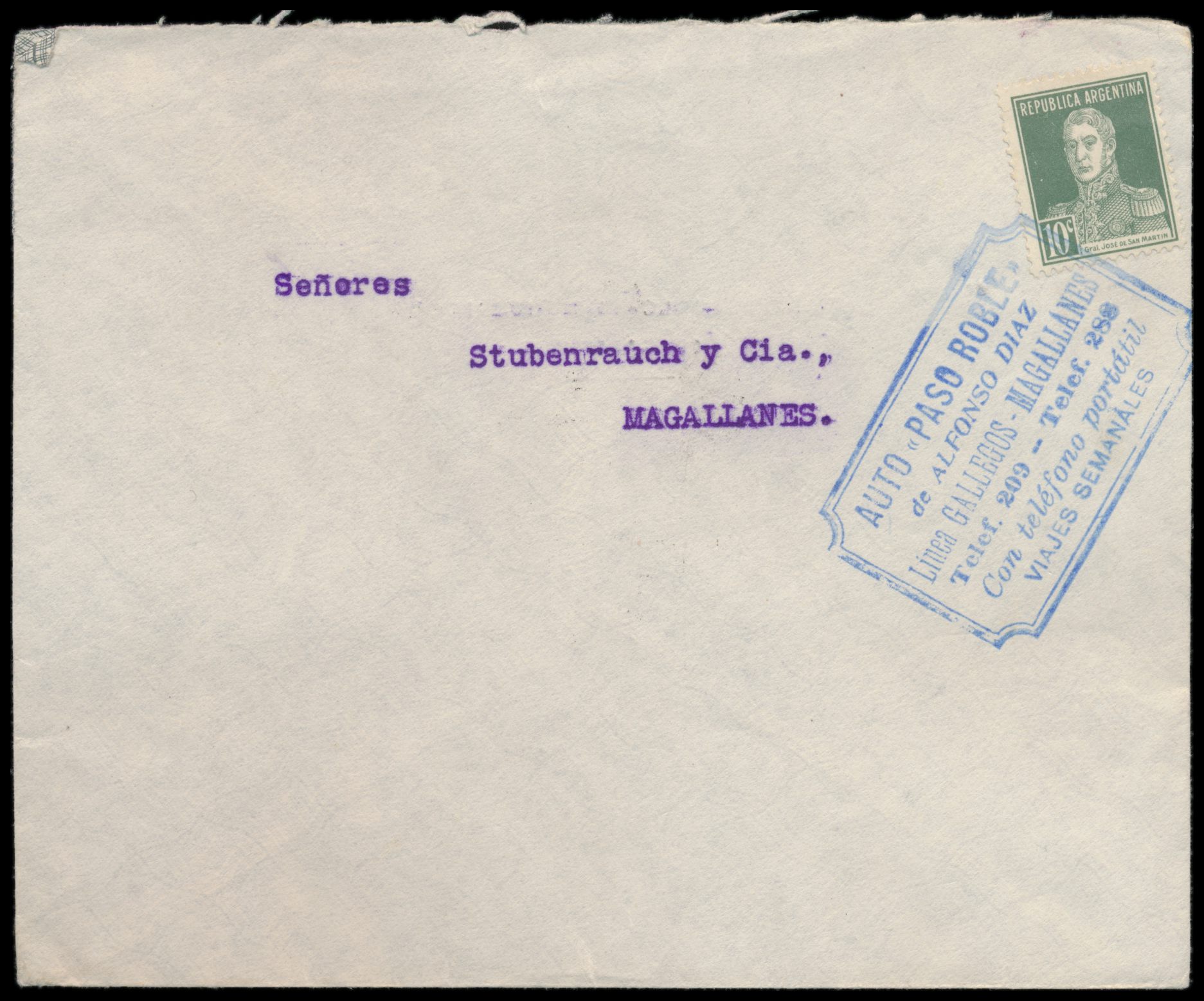 Autopost Rio Gallegos - Magallanes: 10 C. San Martin auf Brief der "Banco Anglo-Sud Americano" in Rio Gallegos, entwertet mit violettem Stempel Auto "Paso Roble" / de Alfonso Diaz / Linea Gallegos - Magallanes ..., nach Magallanes, Ankunftstempel 27.6.32, Bedarf