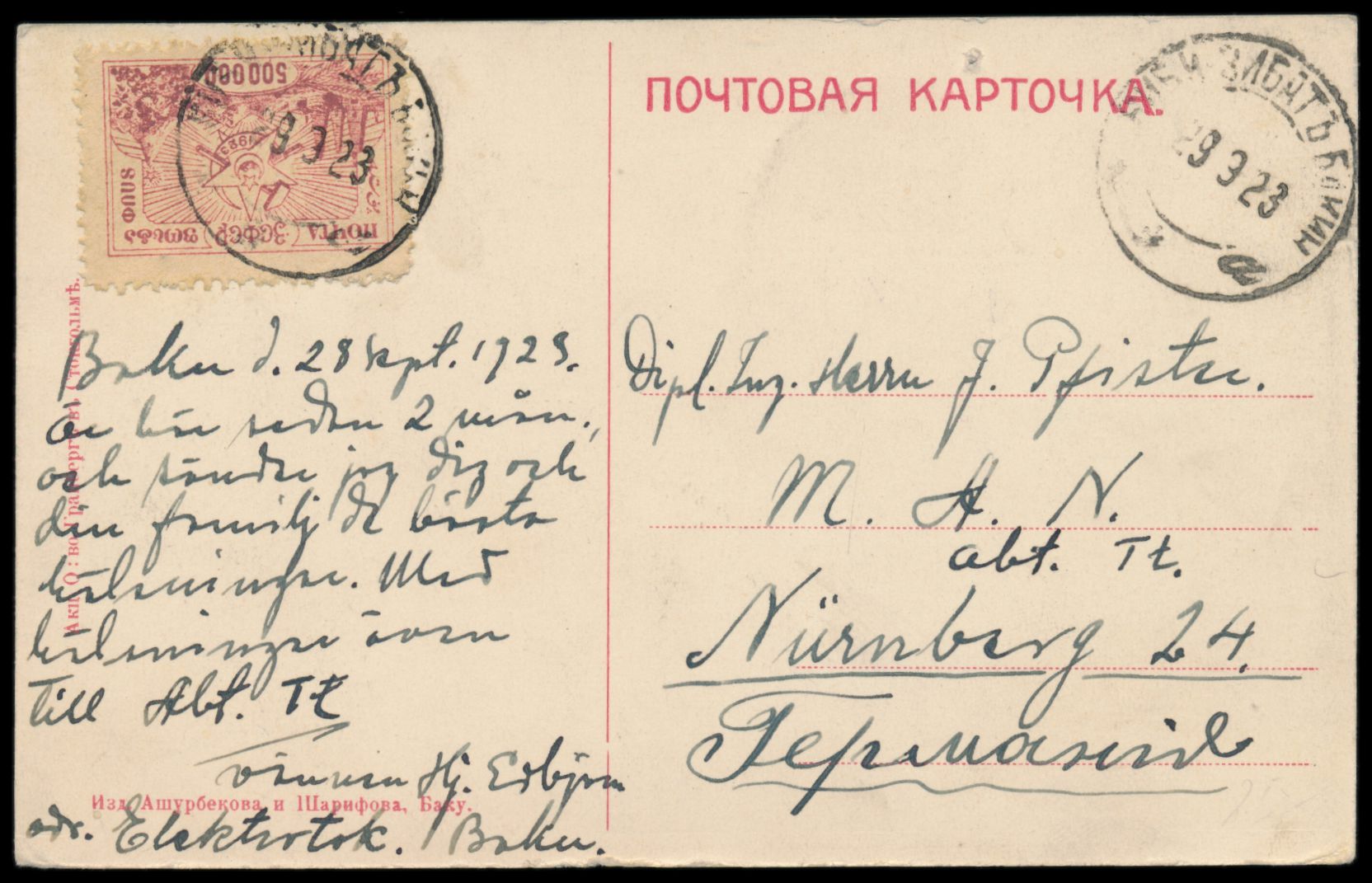 Transkaukasien 500.000 Rub. als Einzelfrankatur auf Ansichtskarte aus Baku 29.9.23 nach Deutschland, Bedarf