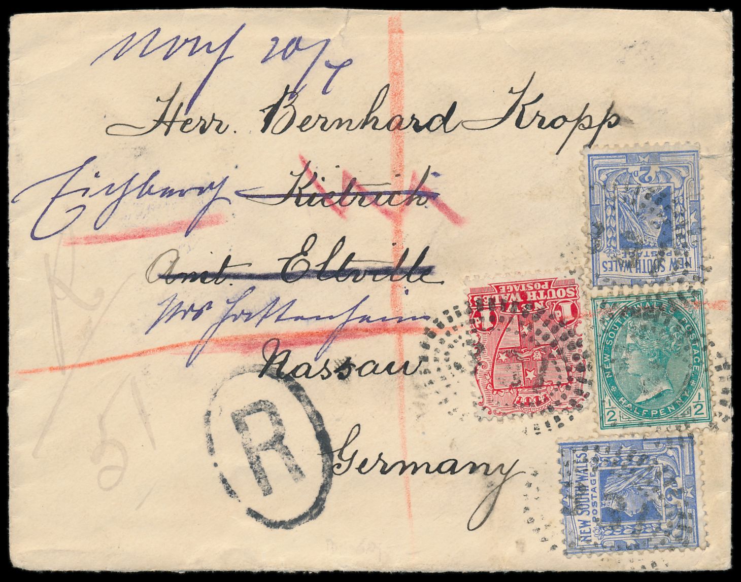 Neu Süd Wales, 1/2 d. 1 d. und 2x 2 d. auf Einschreibbrief mit Nummernstempel 351, nach Deutschland, handschriftlicher R-Vermerk und R-Ovalstempel, rückseitig Stempel Hamilton 13.3.02 und Sydney 14.3., Ankunftstempel Kiedrich 19.4.02 und Hattenheim 20.4.02, Bedarf