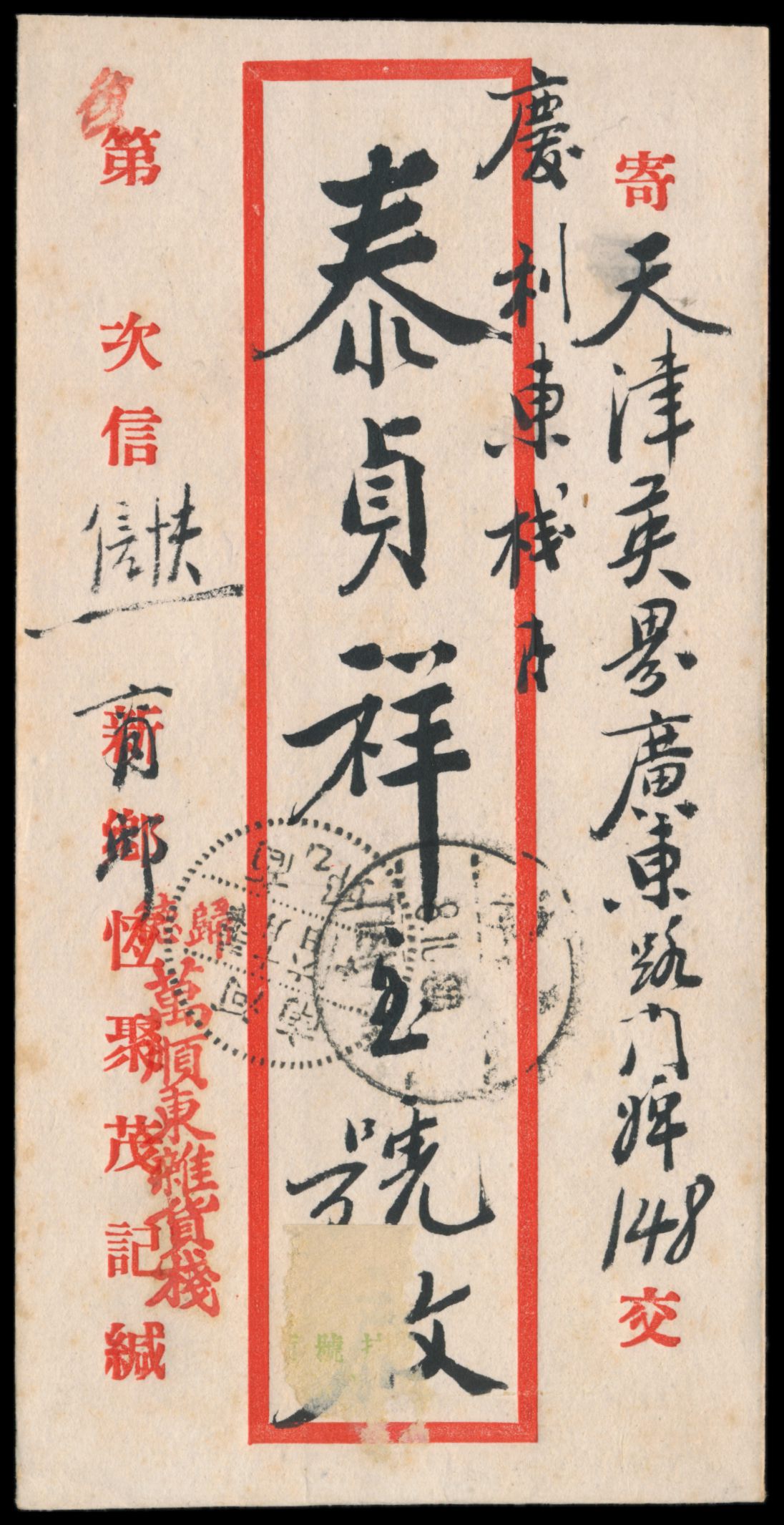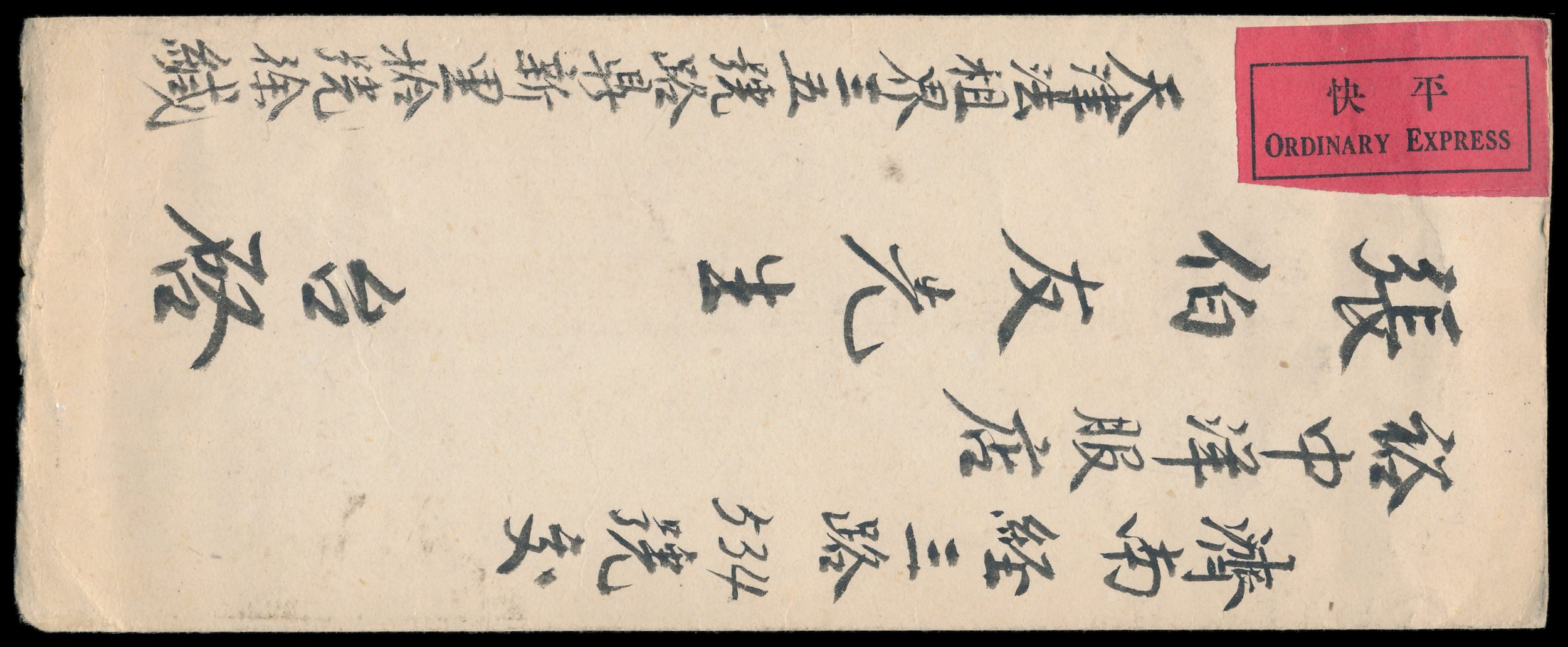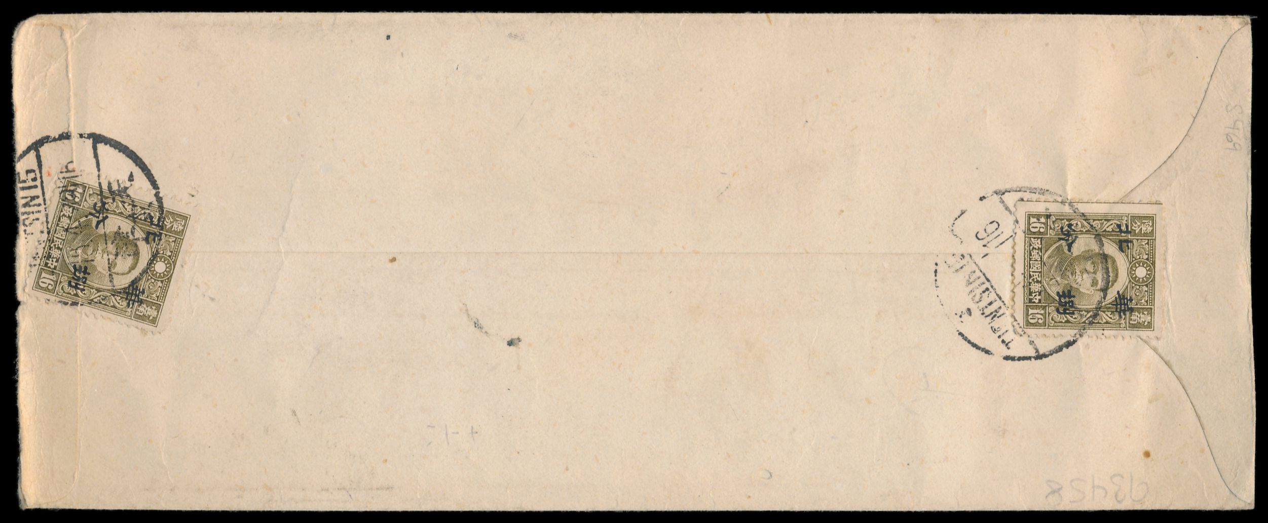 Japanische Besetzung, Gemeinsame Ausgabe der 5 Provinzen: 2 x 8 C. auf 16 C. (Half value surcharge) auf Inlands-Expressbrief, Stempel Tientsin 16.4.1943, portorichtig
