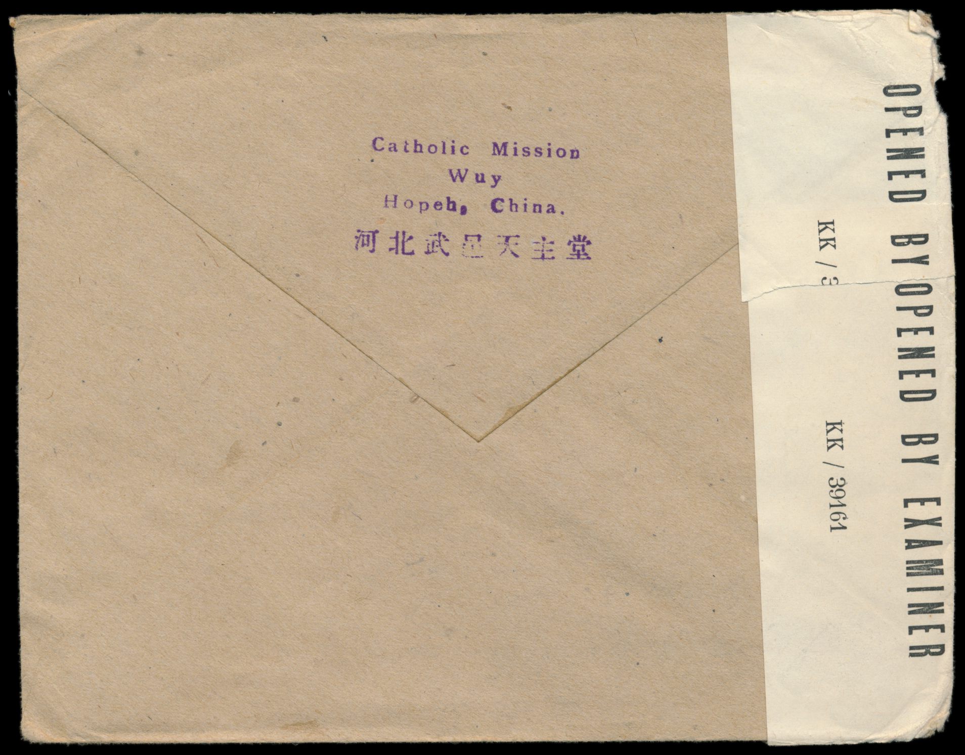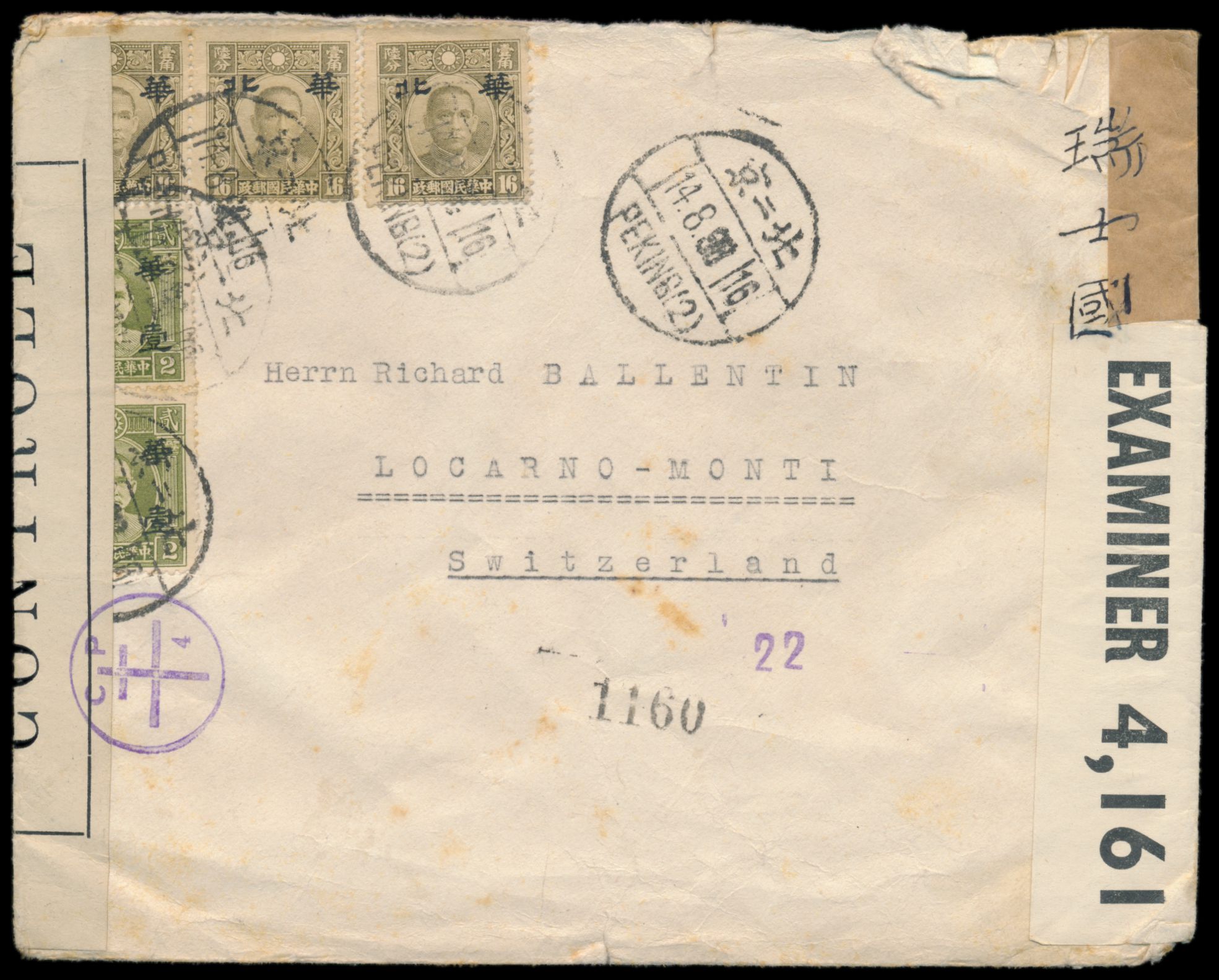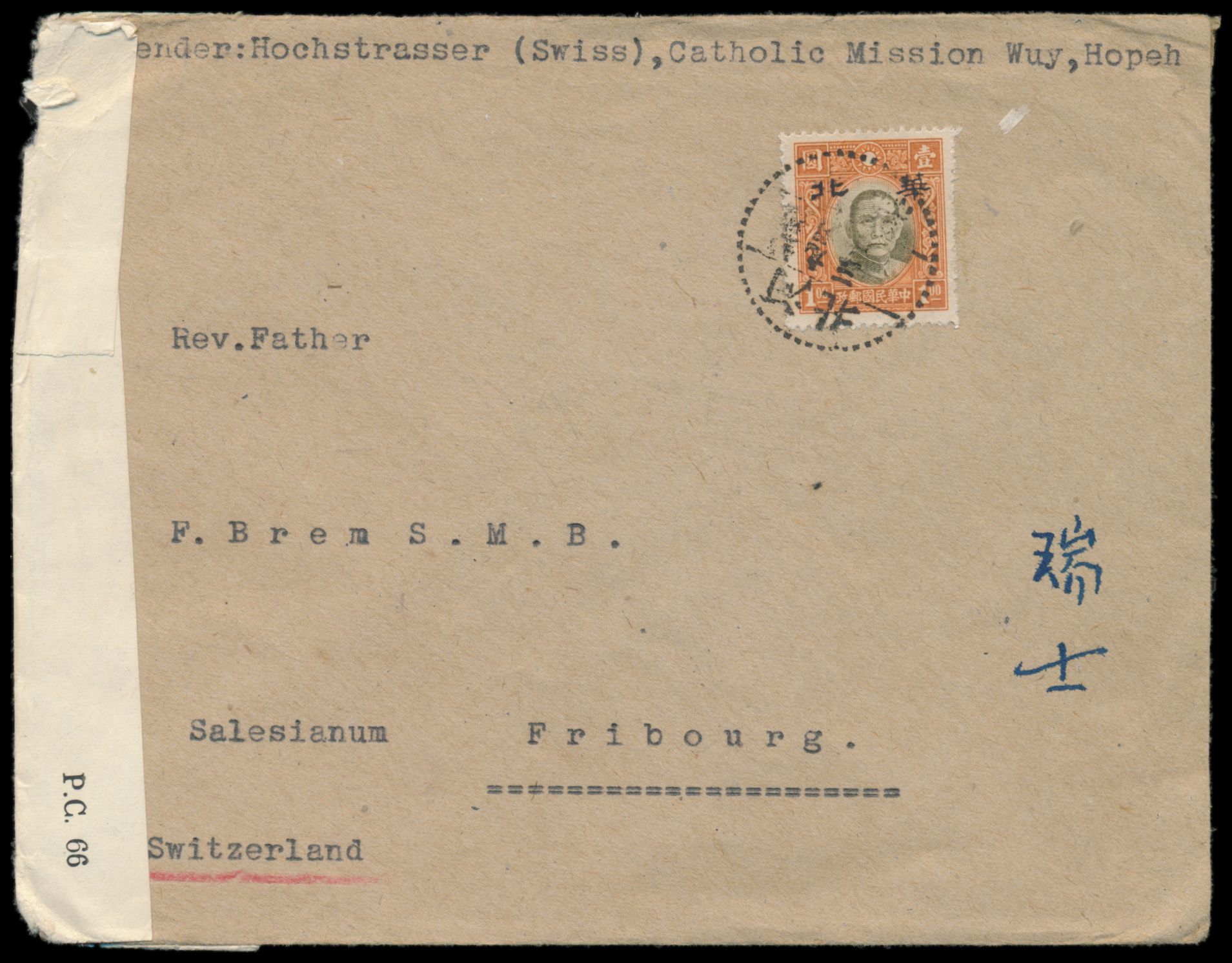 Japanische Besetzung, Gemeinschaftsausgabe der 5 Provinzen: Sun Yatsen 1 $ (1943) mit Aufdruck als Einzelfrankatur auf Brief der Katholischem Mission in Wuy, Hopeh in die Schweiz, ca. 1944, befördert über Sibirien - Türkei - Palästina, links britischer Zensurverschluß von Palästina (Kennzeichen "KK"), Post nach Europa nach Kriegseintritt über USA ist selten