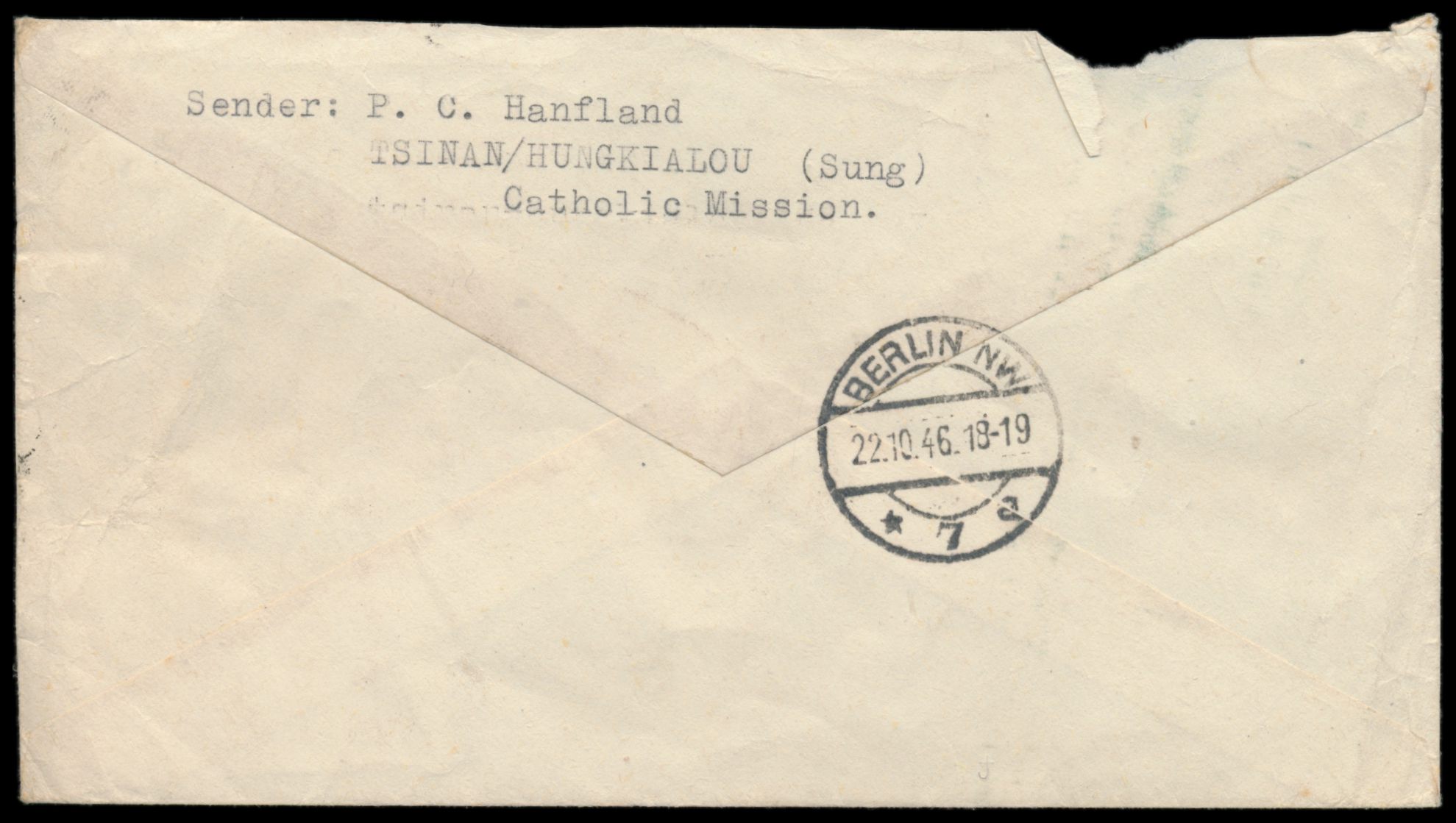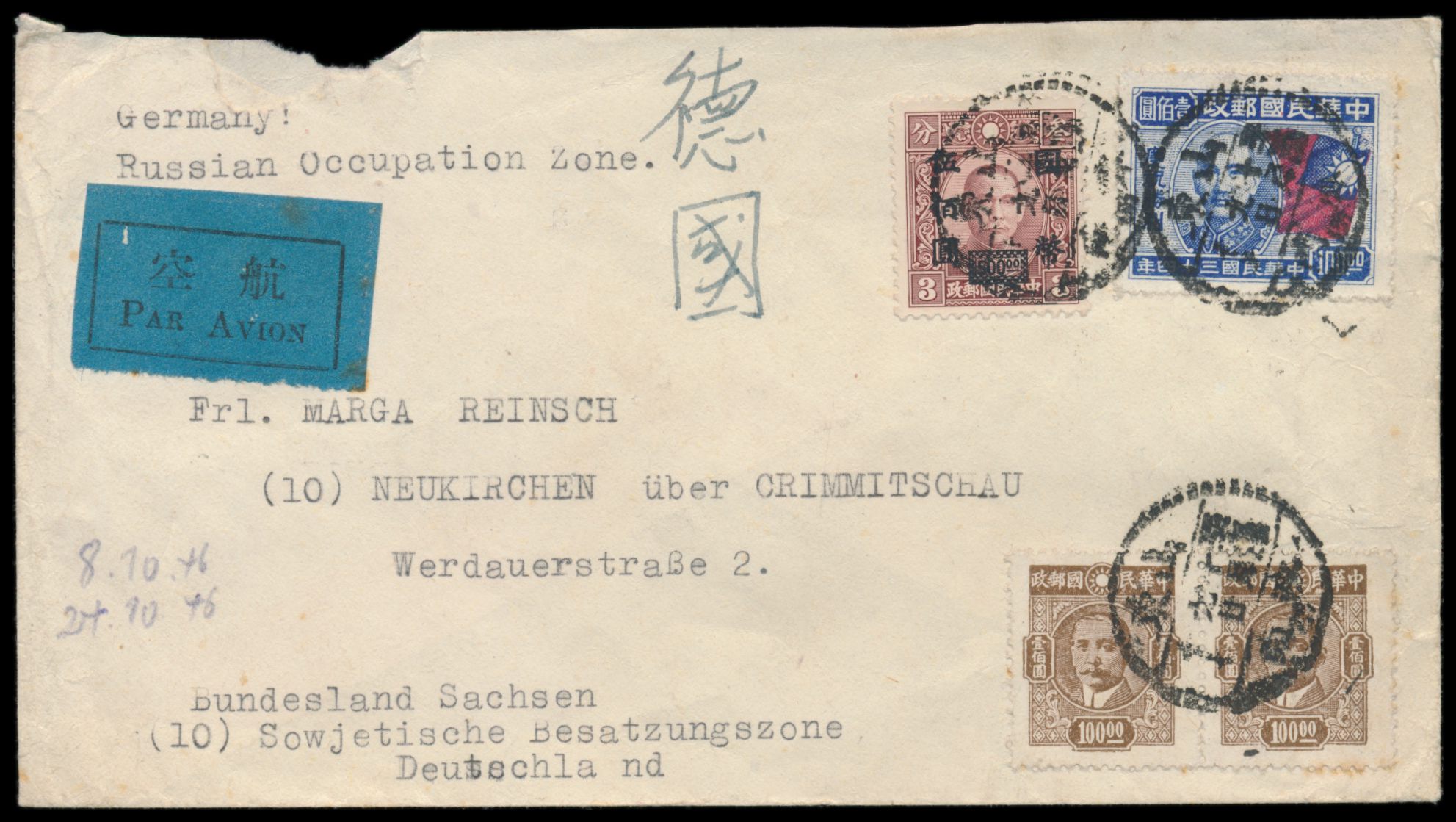 "Sieg über Japan" 100 $ mit 2 x 100 $ 500 $ auf 3 C. auf Luftpostbrief nach Deutschland, rückseitig Absender "... Tsinan / Hungkialou (Sung), Catholic Mission", Ankunftstempel Berlin 22.10.46, Umschlag hat links oben kleinen Ausriss