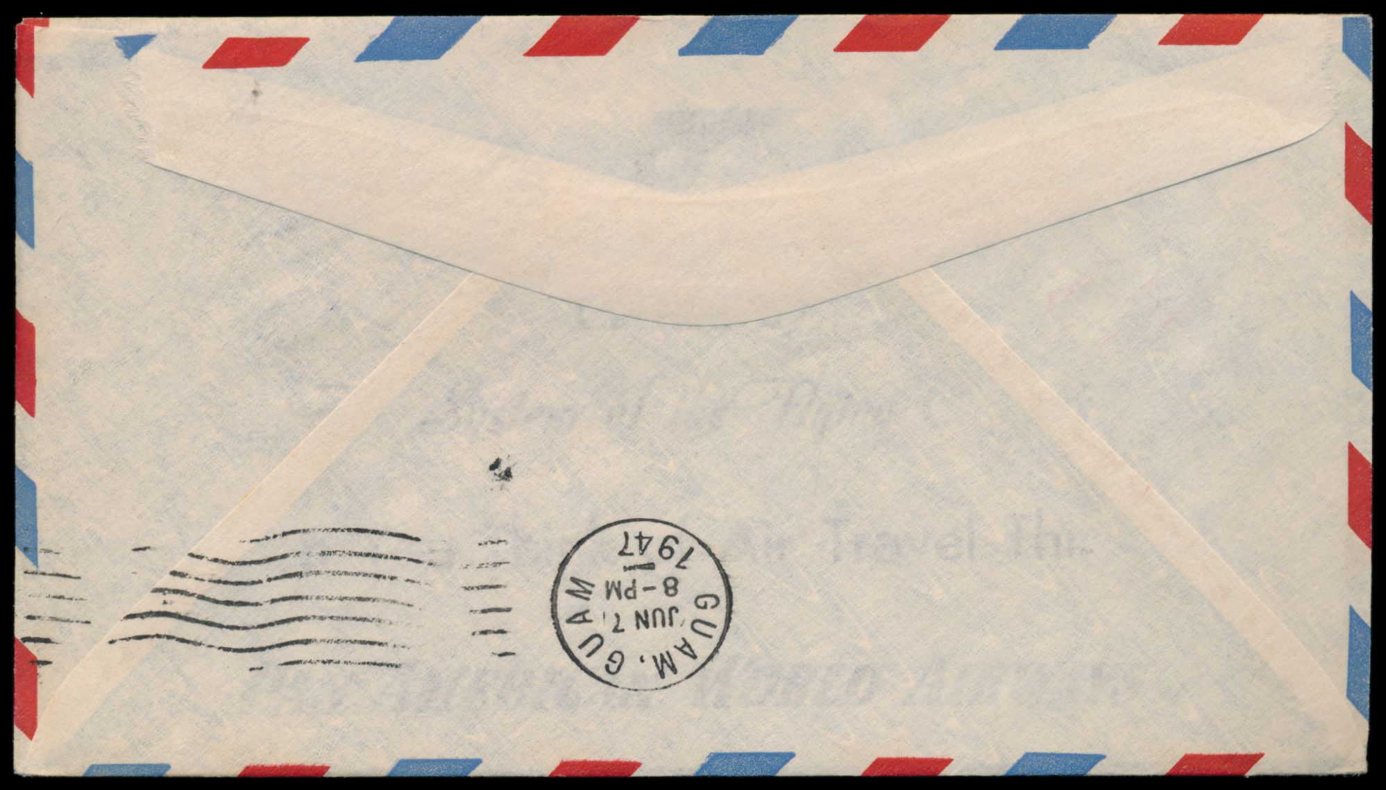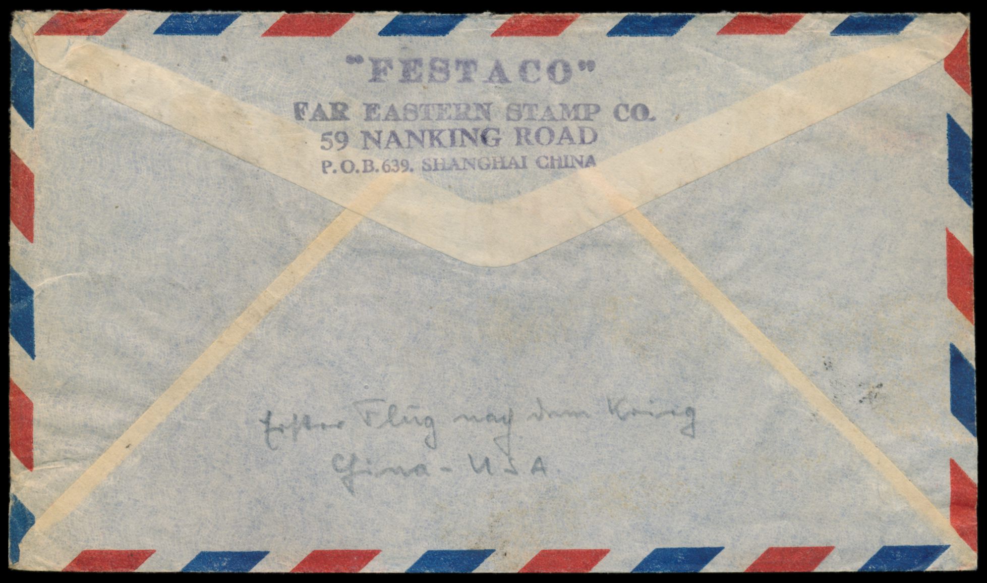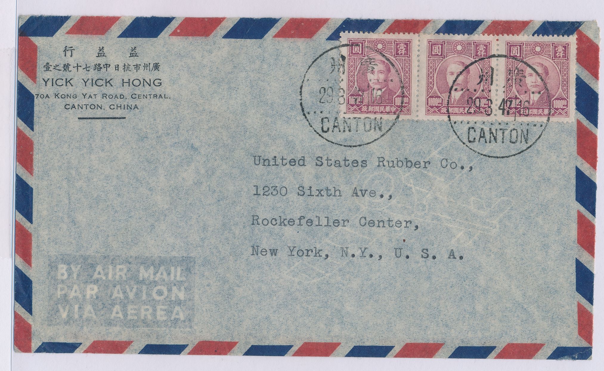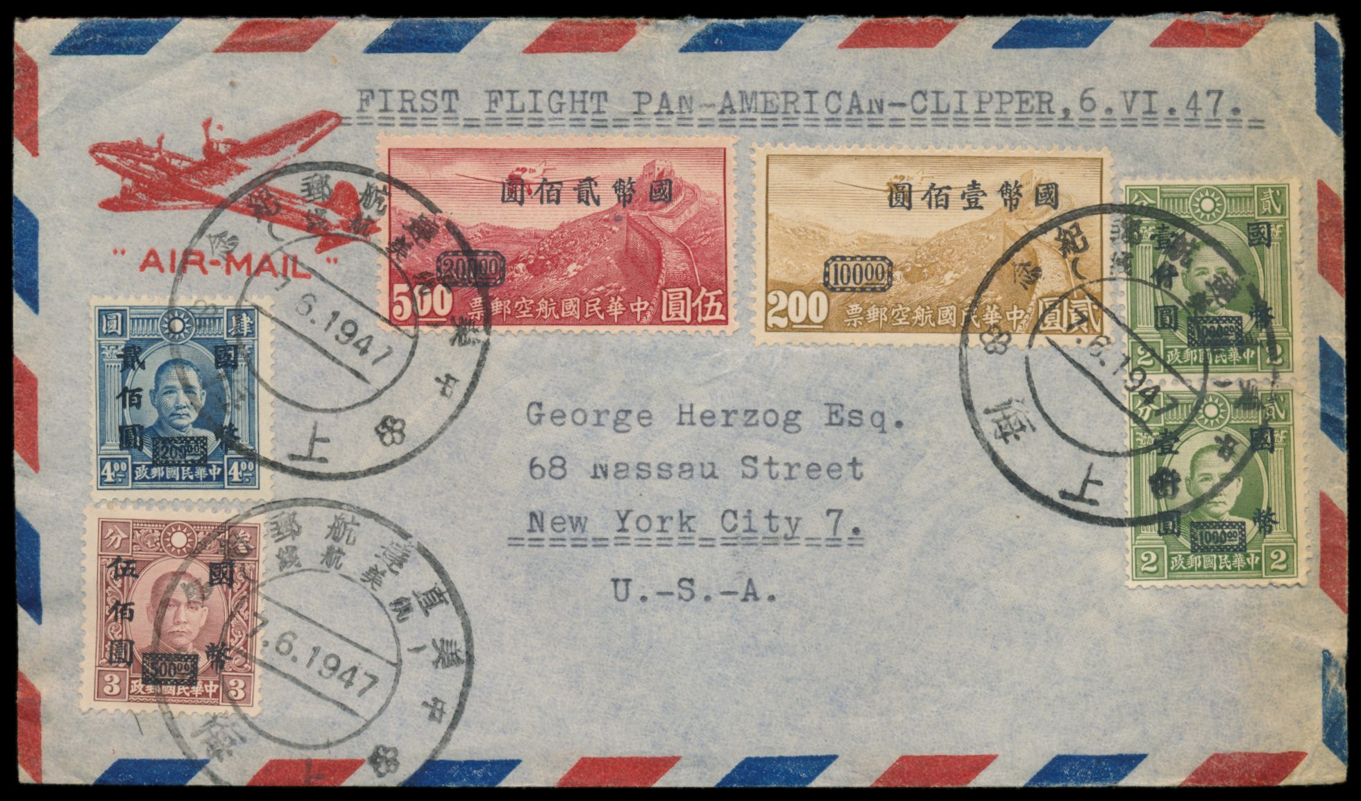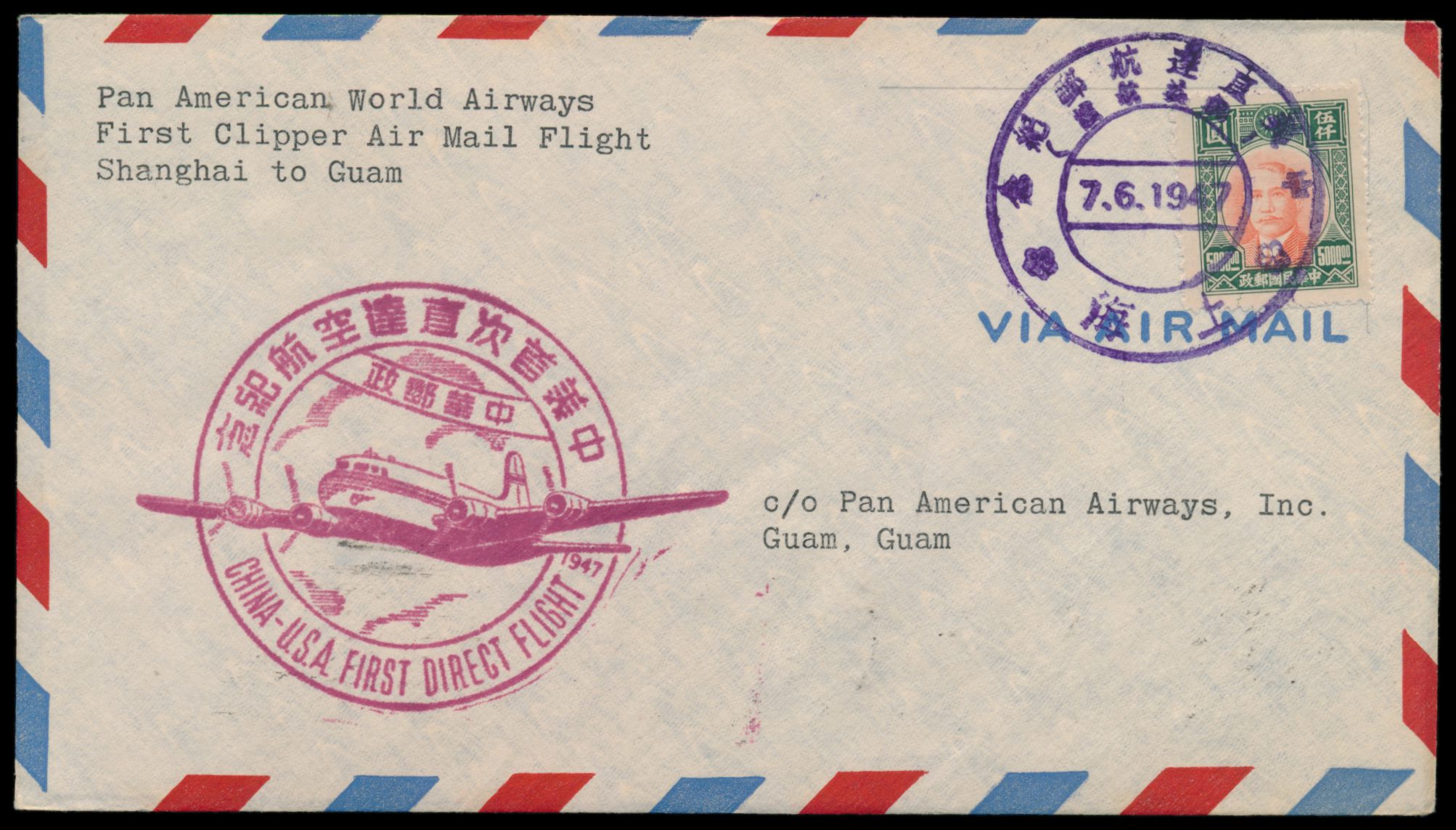 PANAM-Erstflug nach USA 7.6.1947: 2 Luftpostbriefe mit Sonderstempel nach New York bzw. Guam, 1 x Einzelfrankatur Sun Yatsen 5000 $, 1 x Mischfrankatur 3000 $, dabei Flugpostmarken 100 $ auf 2 $ und 200 $ auf 5 $
