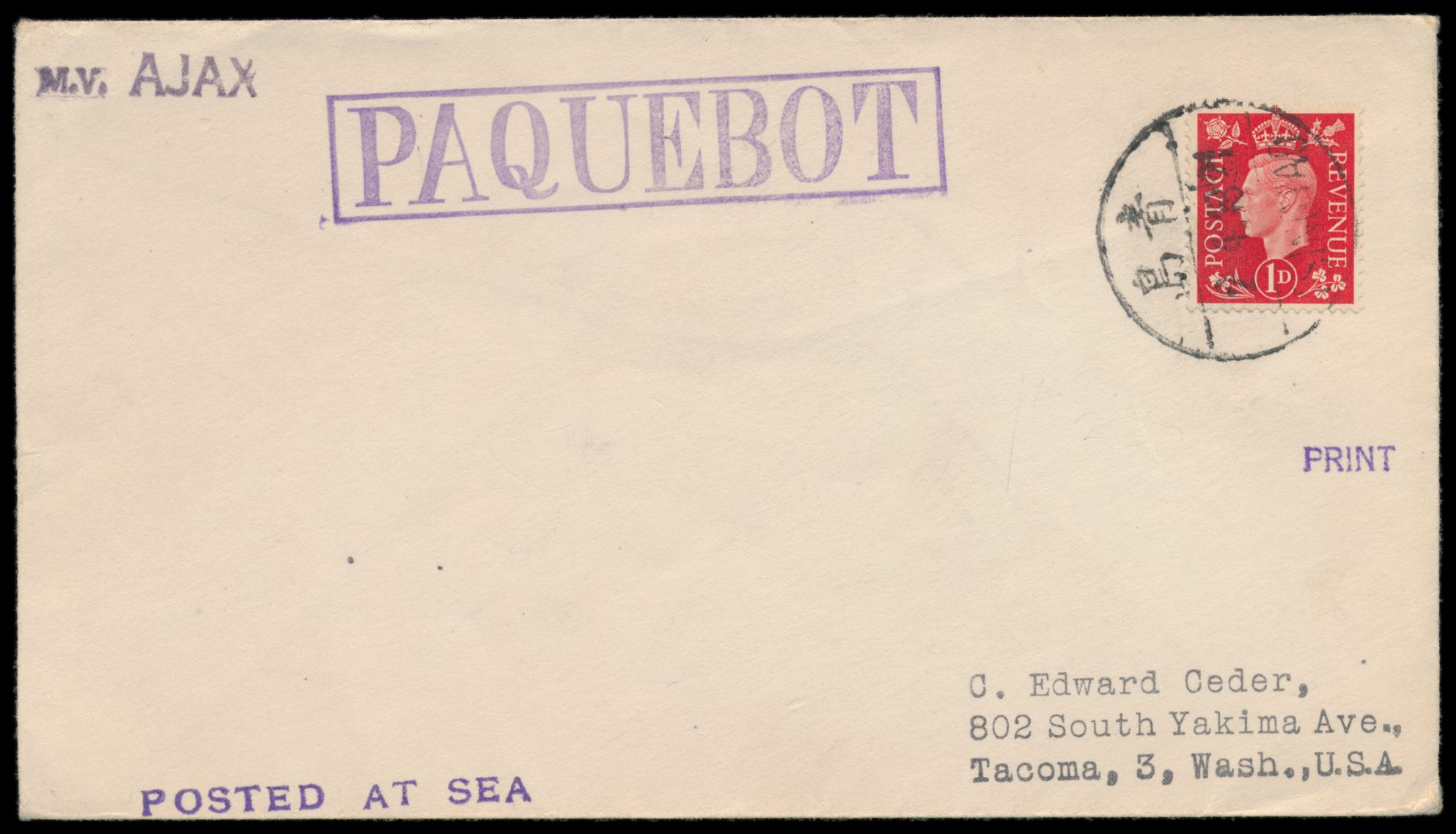 Stempel Tsingtao 2.4.48 und großer violetter R1 Paquebot auf Drucksache mit Großbritannien 1 d. nach USA