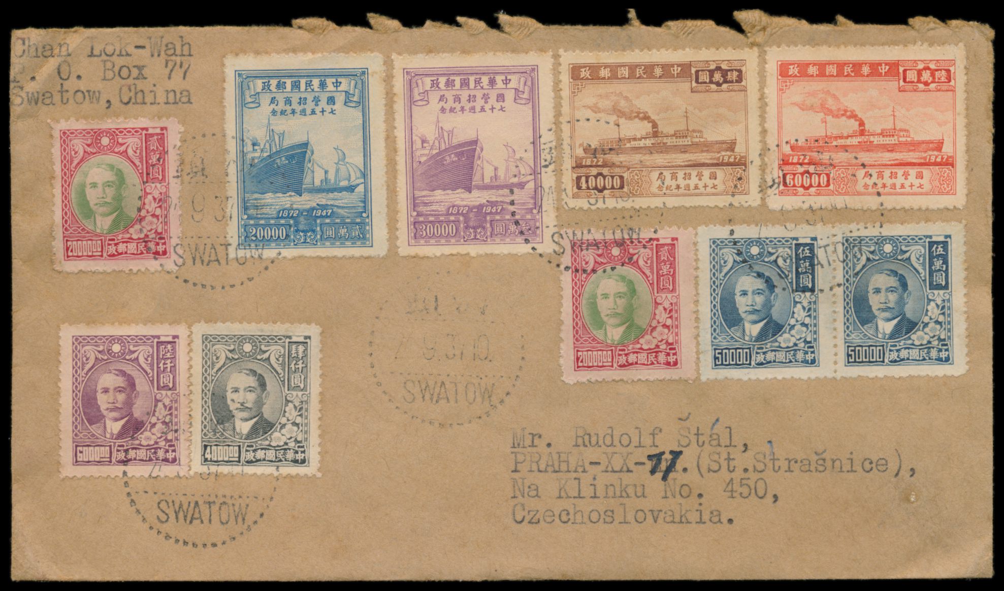 75 Jahre chinesische Kaufmanns-Dampfschiffahrt: kompletter Satz mit sechs weiteren Marken auf Brief in die Tschechoslowakei, Gesamtfrankatur 300000 $, portorichtig, Stempel Swatow 24.9.37 (1948)