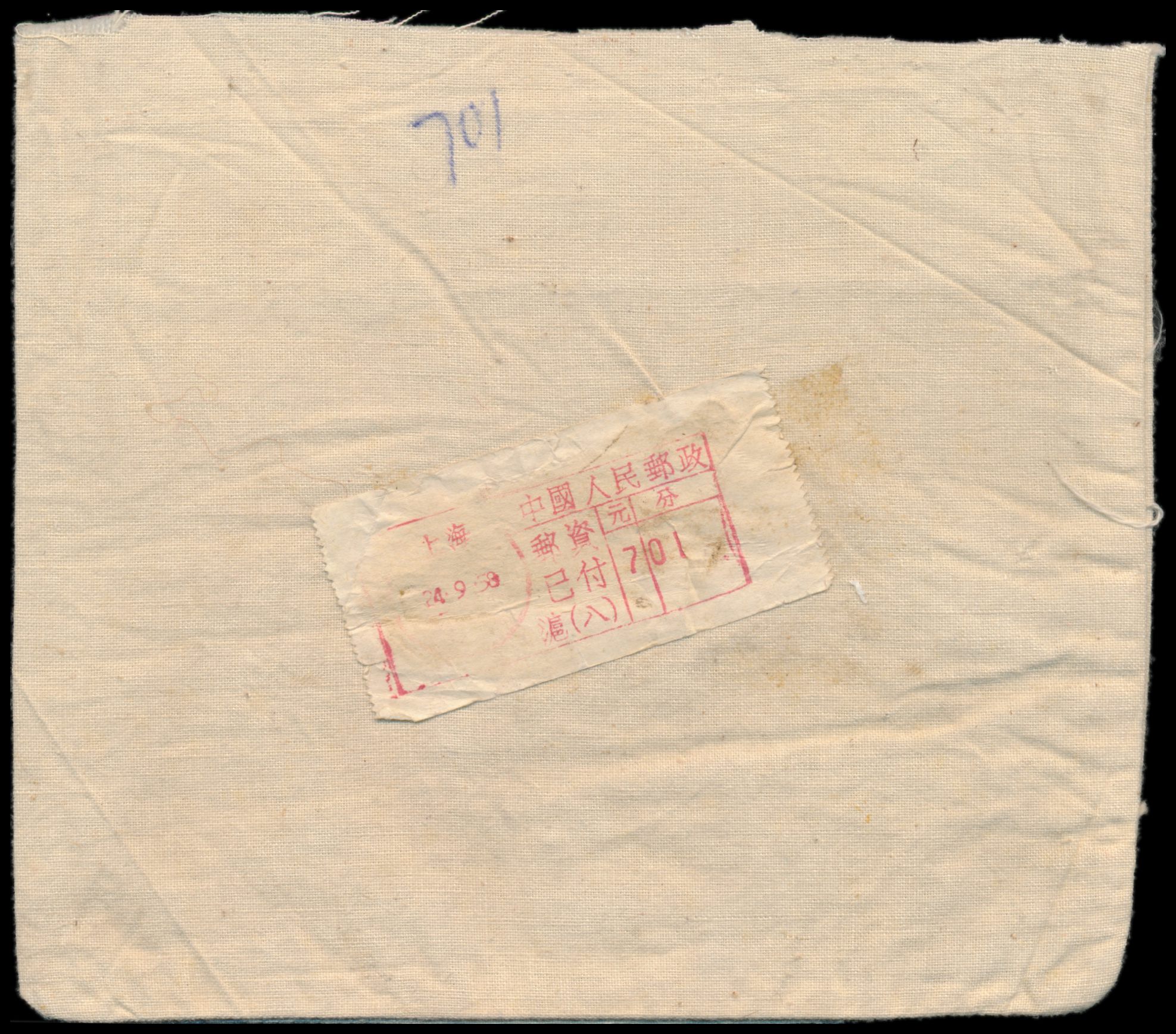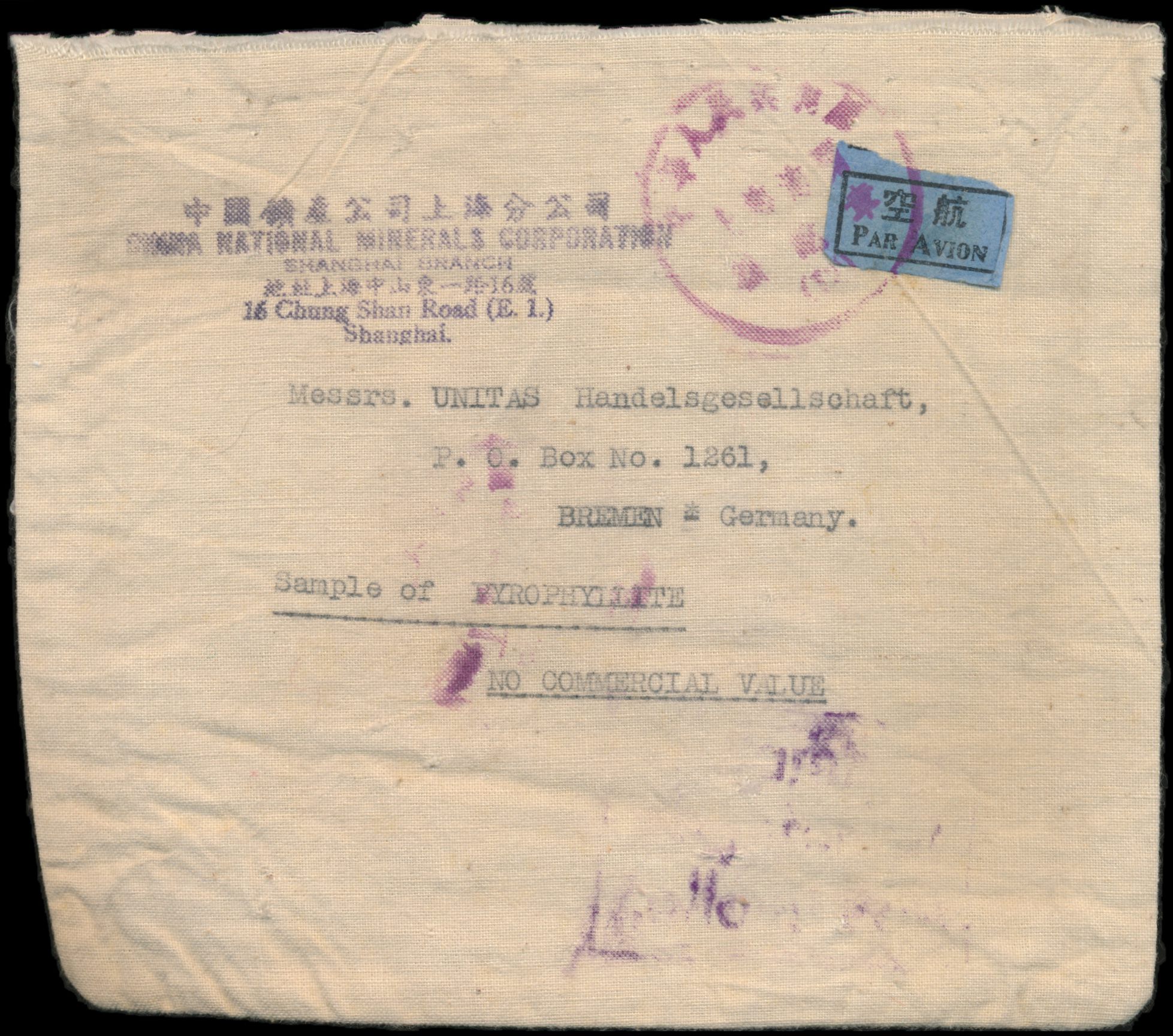 Pitney Bowes-Absenderfreistempel Shanghai 24.9.48 auf Etikett rückseitig auf Leinenbeutel "Sample of no value" mit Luftpost nach Deutschland, chinesischer Zollstempel. Von dieser Maschine waren nur vier Stück (alle in Shanghai) in Verwendung