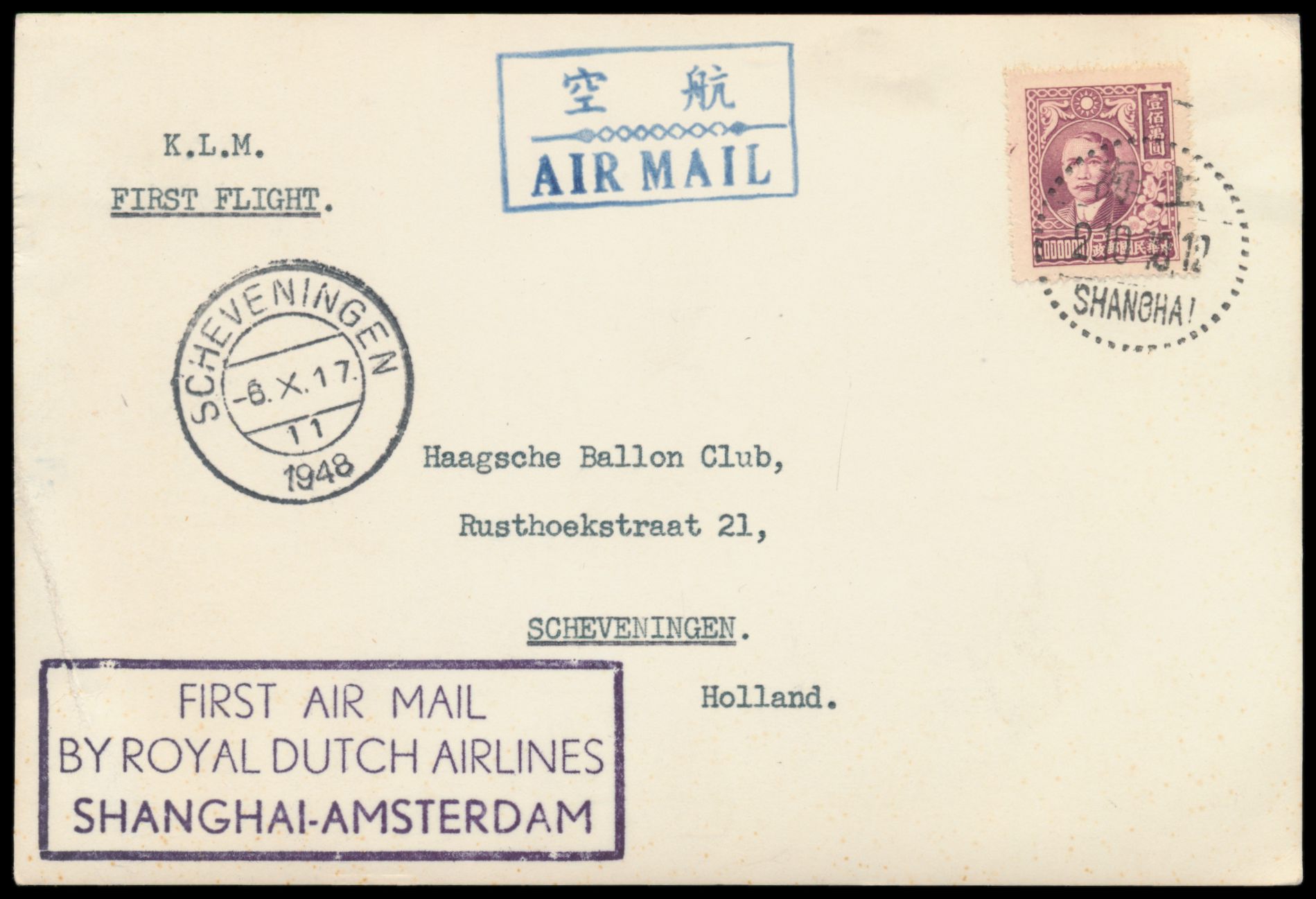 KLM-Erstflug Shanghai - Bangkok - Amsterdam: Sun Yatsen 1.00000 $ auf Luftpostkarte mit Stempel Shanghai 2.10.48 nach Holland, Ankunftstempel Scheveningen 6.10.48