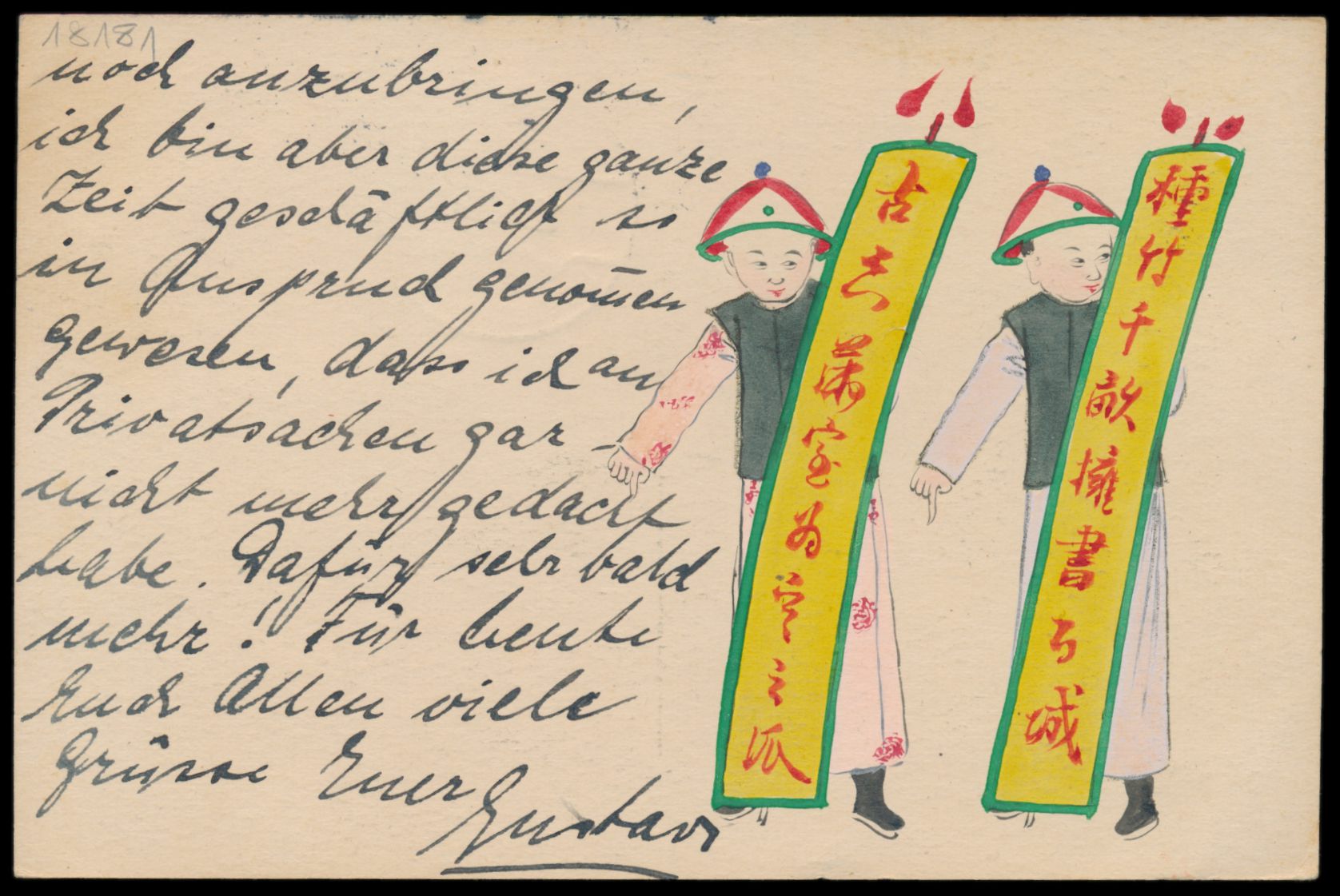 1908, Ganzsache C.I.P. 1 C. grün (Han Nr. 6) mit rückseitig mehrfarbiger Tuschezeichnung, Wertstempel mit Deutsche Post 2 C. überklebt, Stempel Peking / Deutsche Post 28.11.10, nach Deutschland, Bedarf