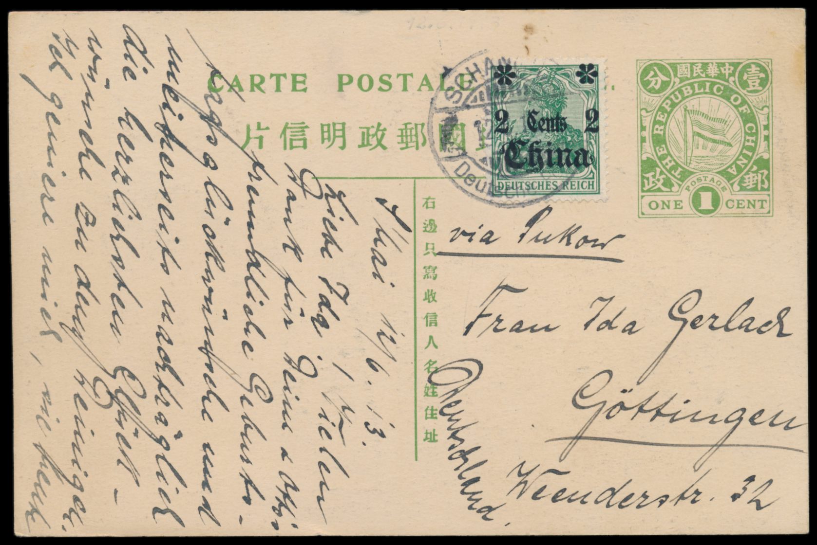 Republik, Ganzsache 1 C. "Flagge der Republik" (Han Nr. 10) mit rückseitig mehrfarbiger Tuschezeichnung , Zusatzfrankatur Deutsche Post 2 C. , Stempel Schanghai / Deutsche Post 12.6.13, "via Pukow" nach Deutschland, Bedarf