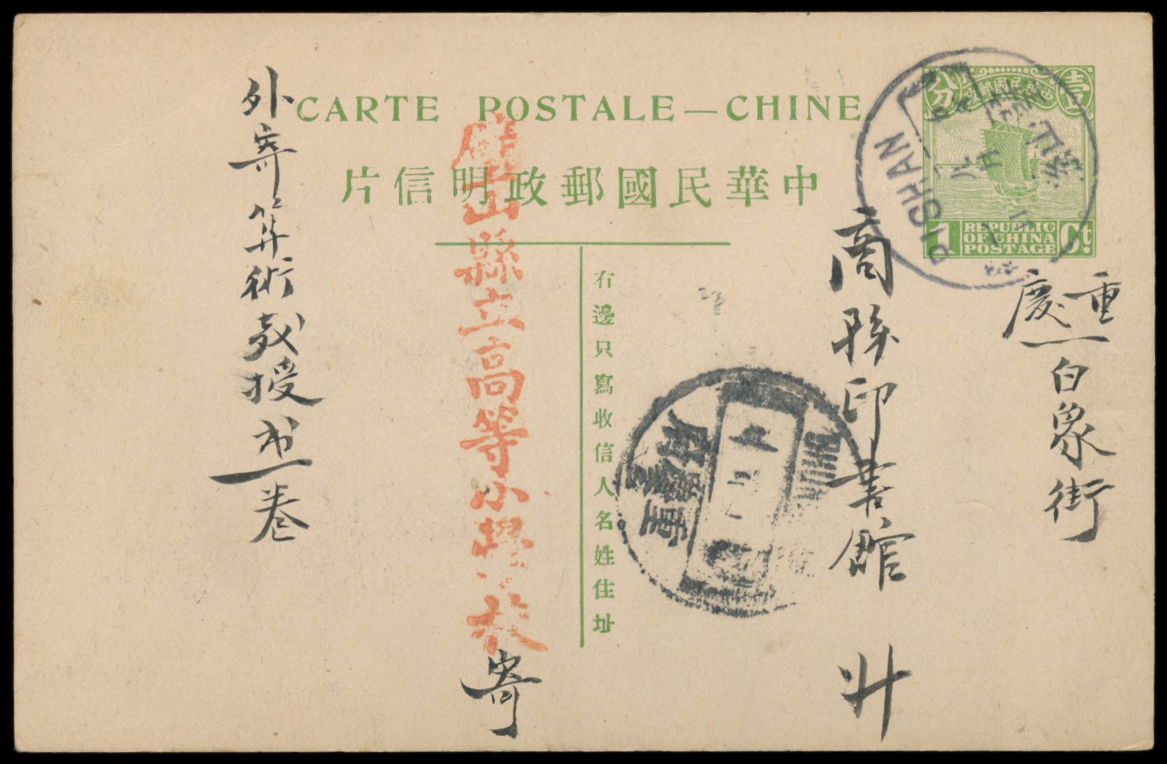 Ganzsache 1 C. Dschunke (Han No. 14), Stempel Pishan 1.8.5 (1916) (Szechwan), undeutlicher Ankunftstempel Chungking, Bedarf