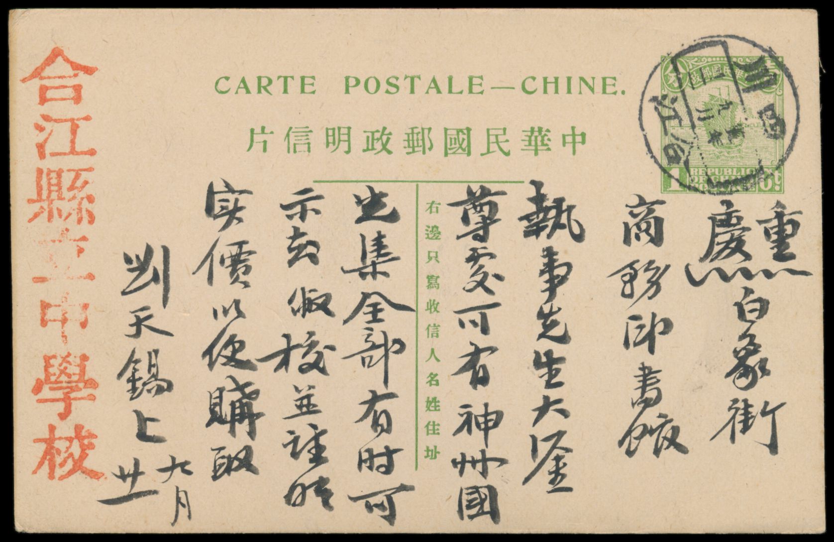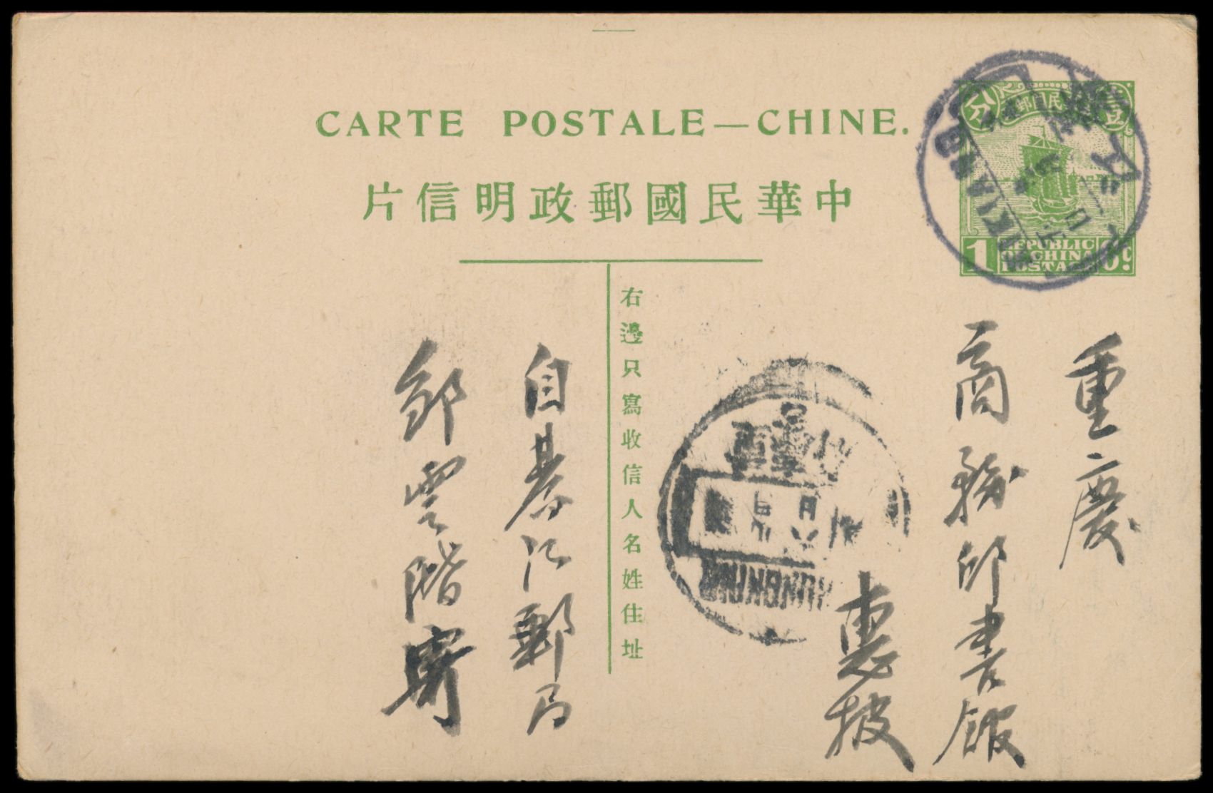 Ganzsache 1 C. Dschunke (Han No. 14), Stempel Kikiang (Szechwan), undeutlicher Ankunftstempel Chungking, ca. 1916, Bedarf