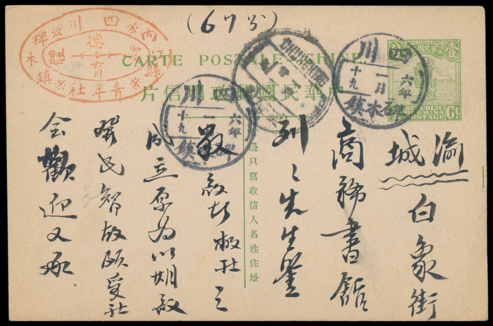 Ganzsache 1 C. Dschunke (Han No. 14), Stempel Szechwan / ... 29.1.6 (1917), Ankunftstempel Chungking, Bedarf