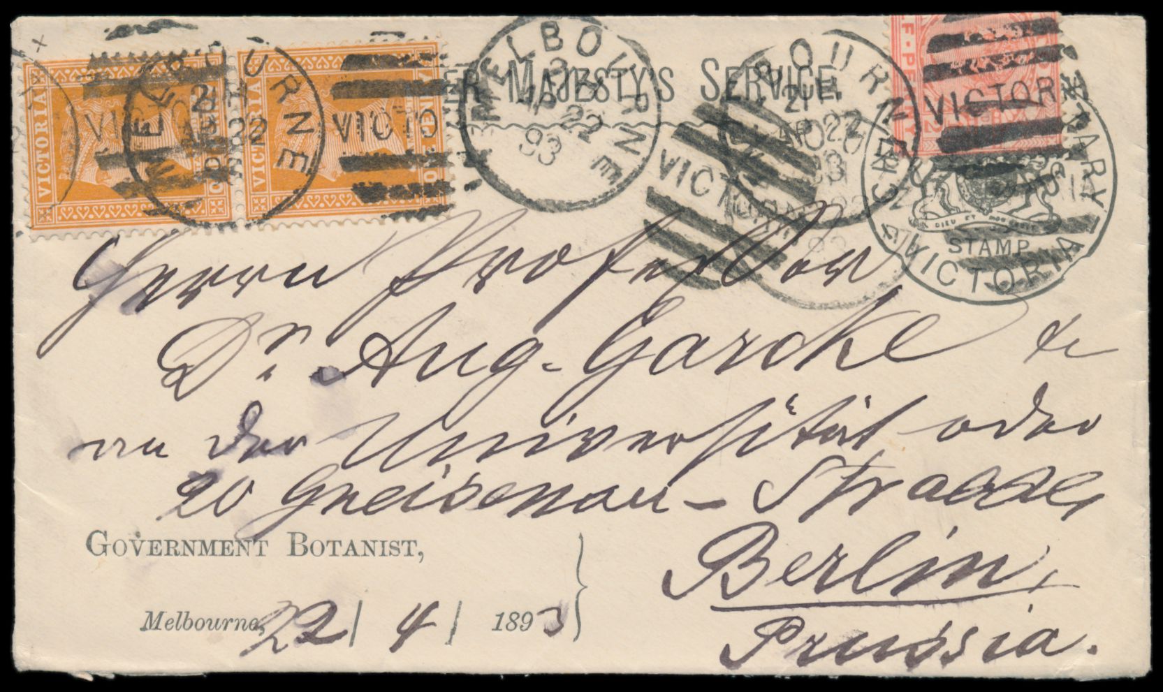 Victoria, Dienstumschlag "Government Botanist, Melbourne" mit Dienstsiegel "Chief Secretary Victoria nach Deutschland, Frankatur QV 1/2 d. und 2 x 1 d., Stempel Melbourne 22.4.93, Ankunftstempel Berlin 28.5.93