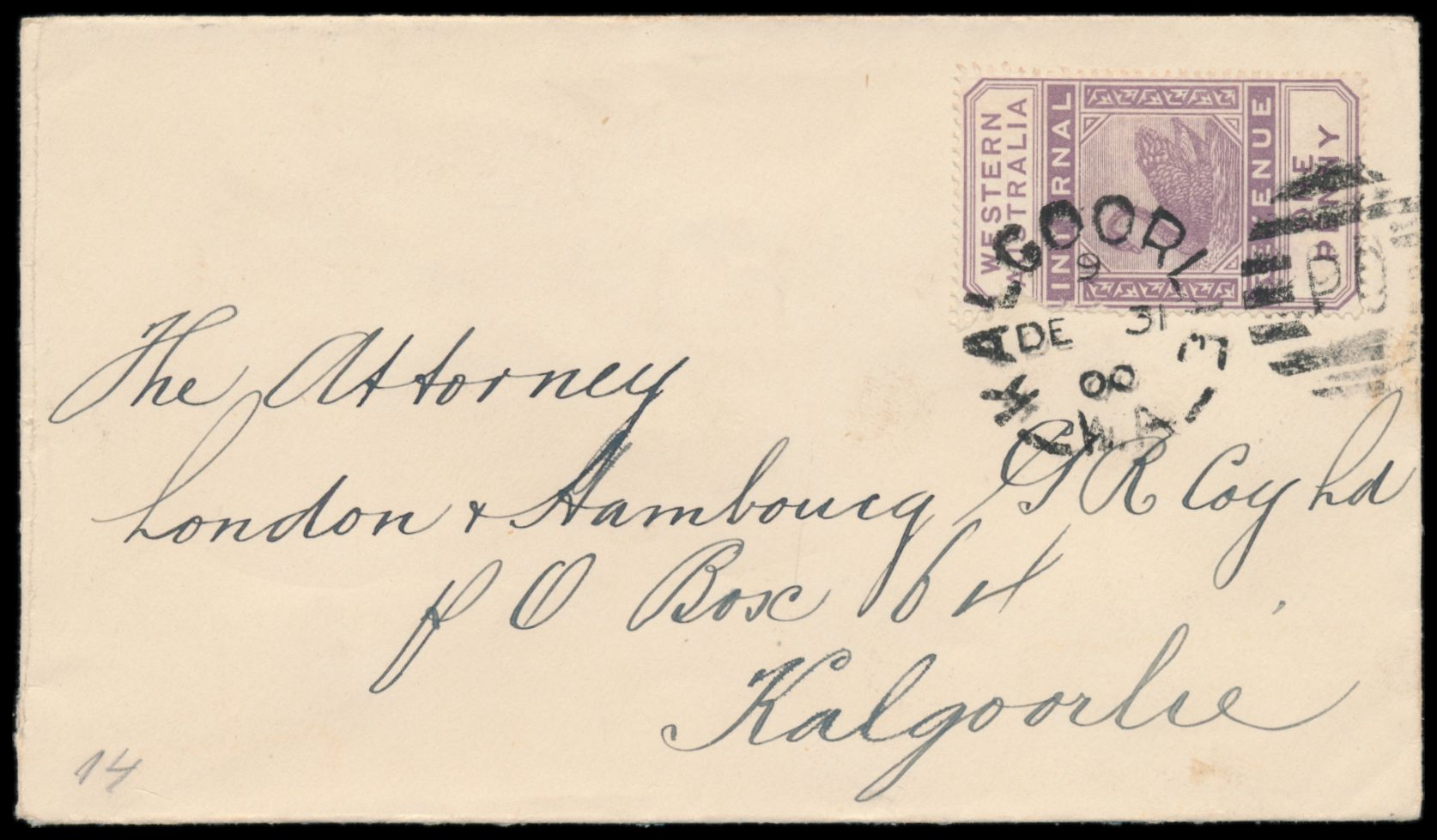 West-Australien, Ortsbrief der "Bank of Australasia" mit Internal Revenue 1 d. und Stempel Kalgoorlie 31.12.00