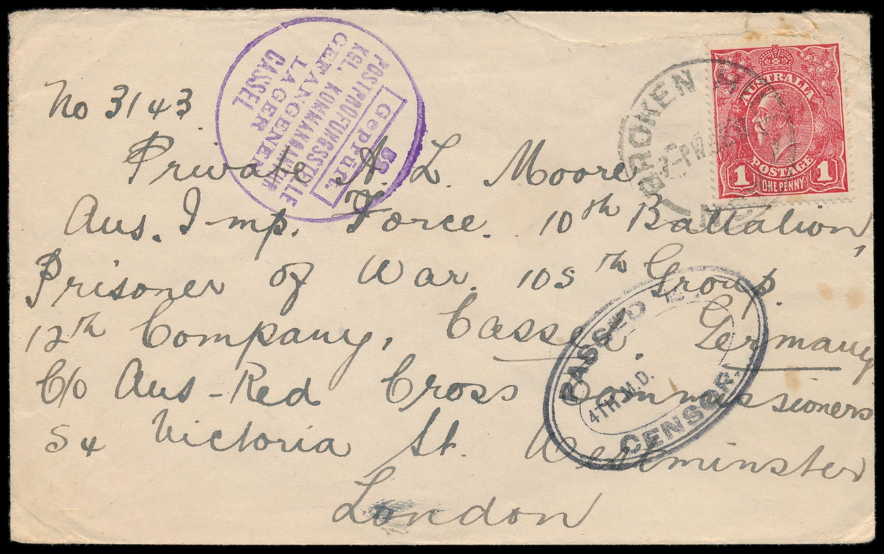 Vordruckumschlag aus dem Kriegsgefangenenlager Liverpool, N.S.W. nach Deutschland, violetter Lagerstempel mit faksimilierter Unterschrift Sands, roter Rahmenstempel Passed by Censor, S.D. ..., mit Inhalt vom 27.4.1916
