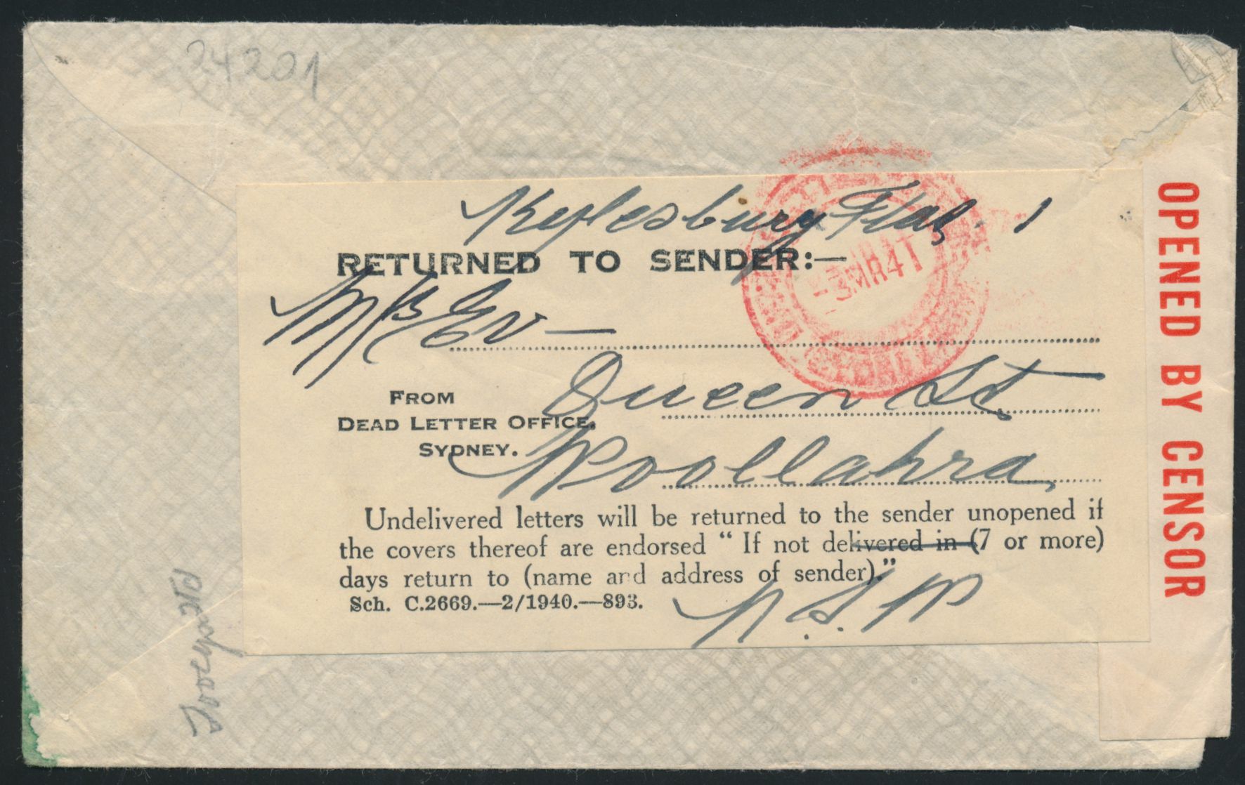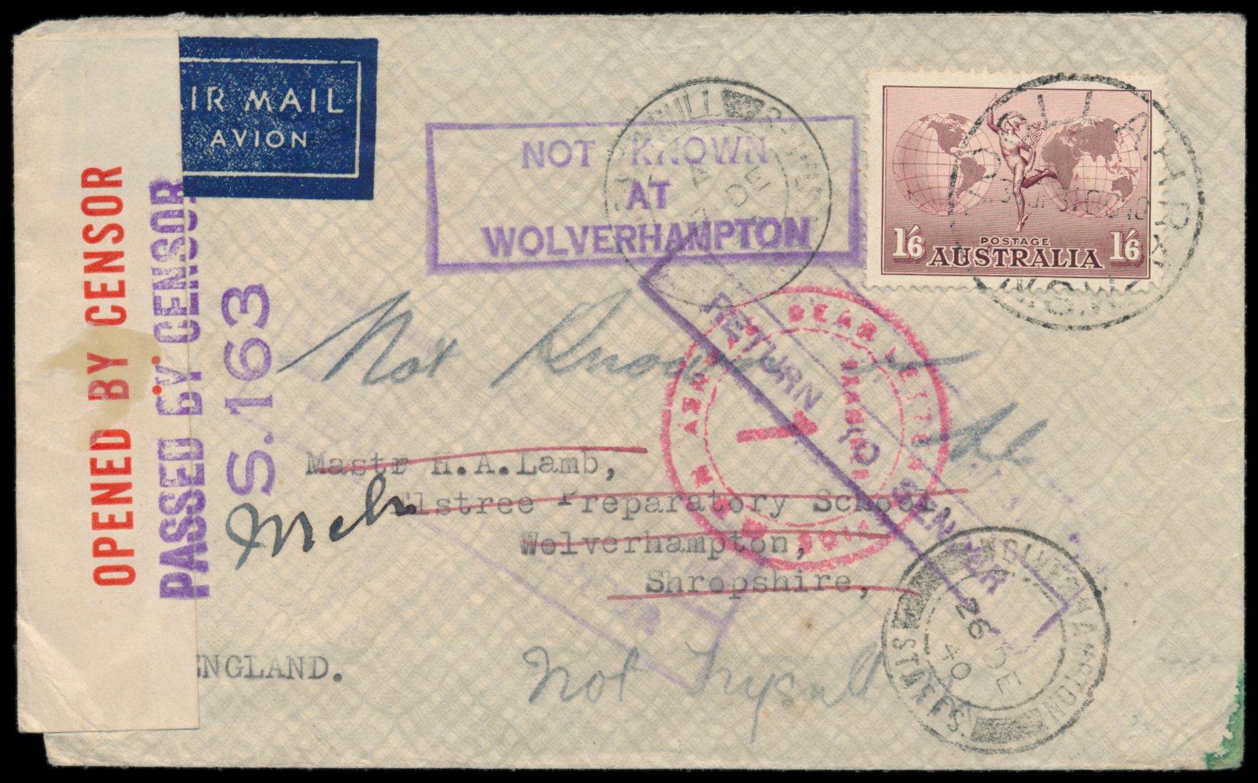 1,6 Sh. auf Luftpostbrief mit Stempel Woolahra N.S.W. 31.10.40 nach England, links australischer Zensurverschluß und Stempel Passed by Censor / S. 163, Ankunftstempel Wolverhampton und R3 "Not known at Wolverhampton" und "Return to Sender", roter Stempel und rückseitig Aufkleber Dead Letter Office Sydney