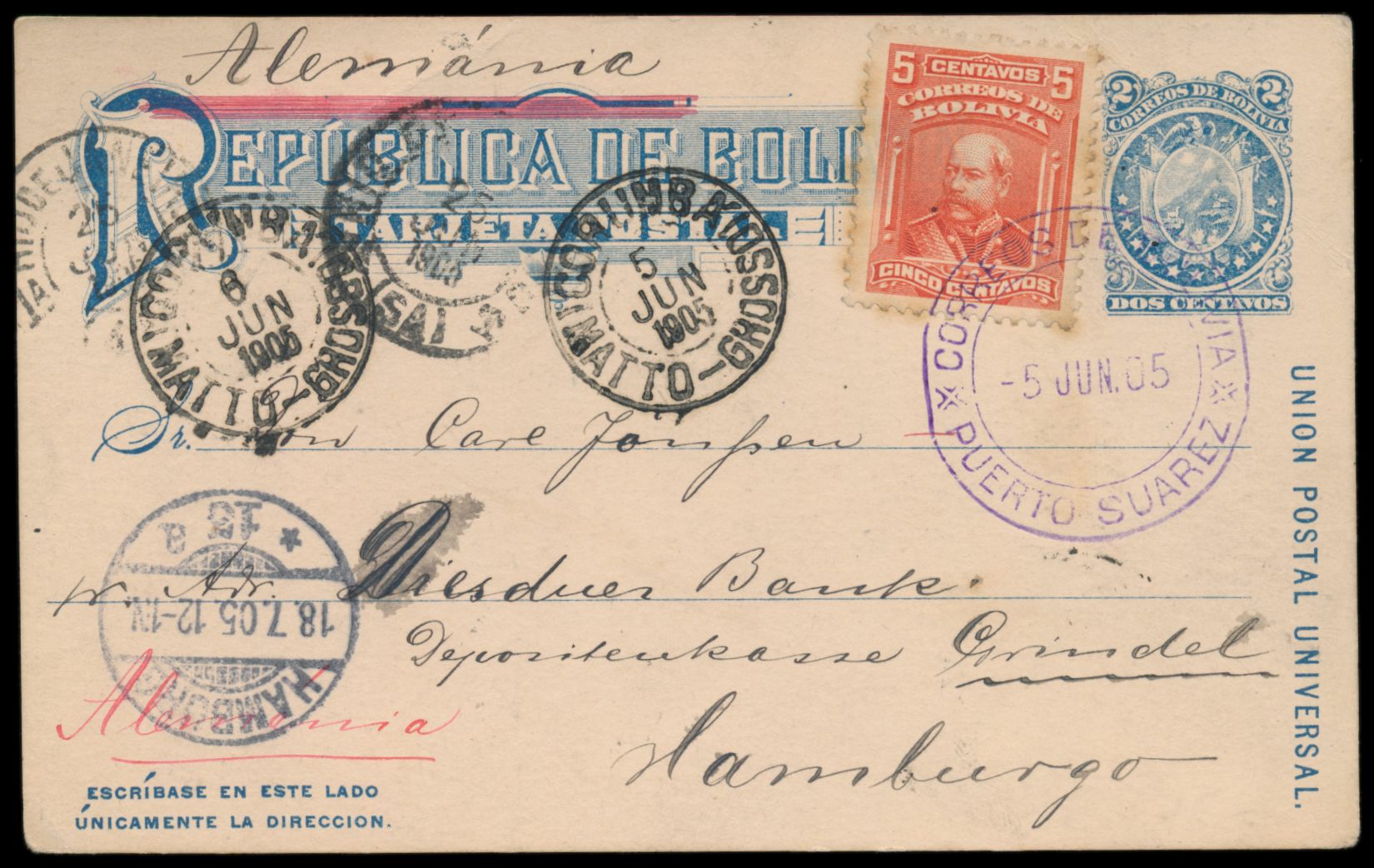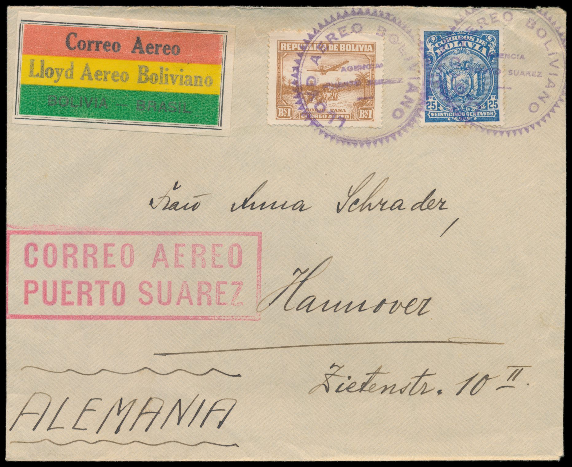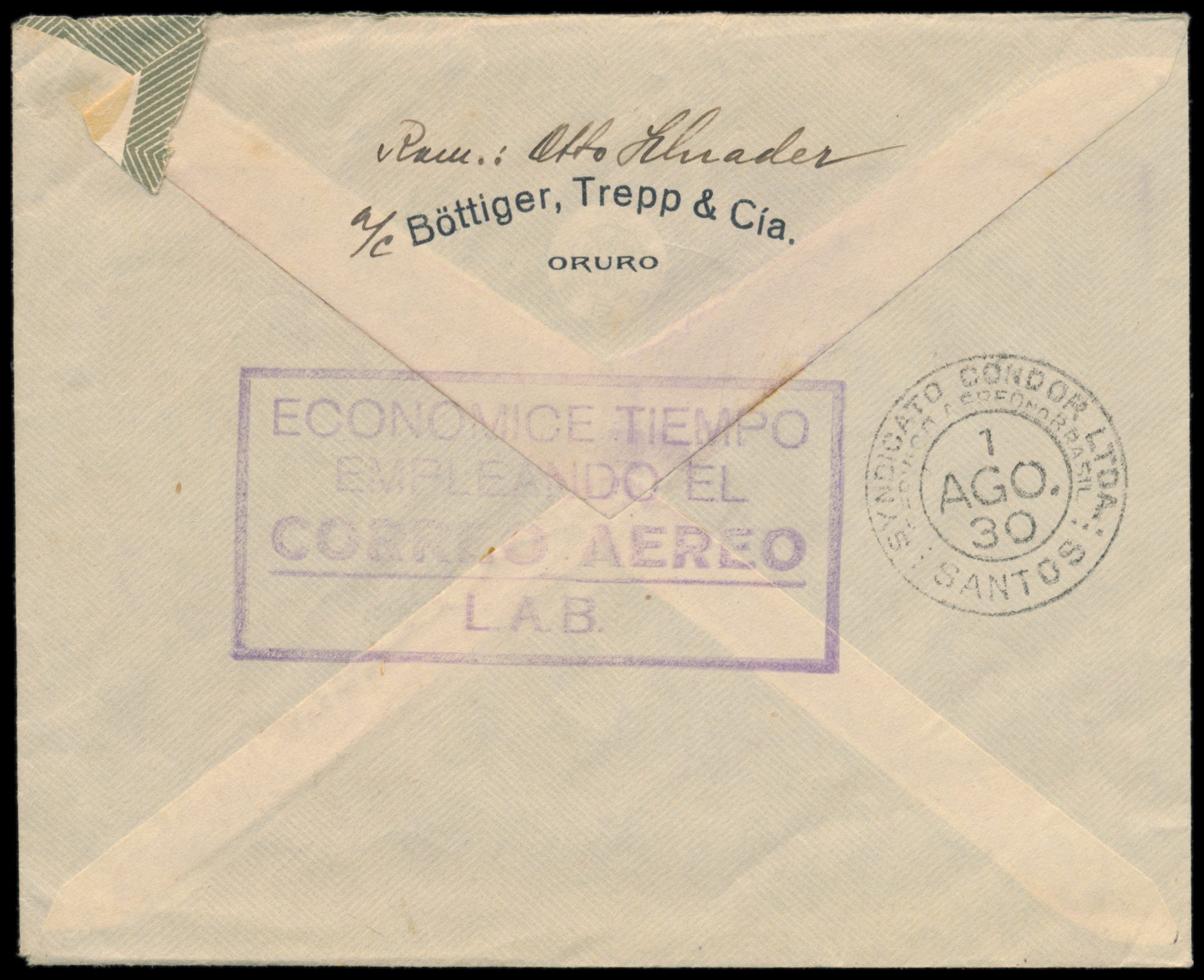 Erstflug nach Brasilien als Gemeinschaftsflug L.A.B. und Condor, seltene Etappe Puerto Suarez - Santos: Brief mit 25 C. und 1 B. Flugpost nach Deutschland, Stempel Lloyd Aereo Boliviano / Agencia Puerto Suarez, roter R2 Correo Aereo / Puerto Suarez, rückseitig violetter L.A.B.-Werbestempel und Ankunftstempel Syndicato Condor LTDA Santos 1.8.30