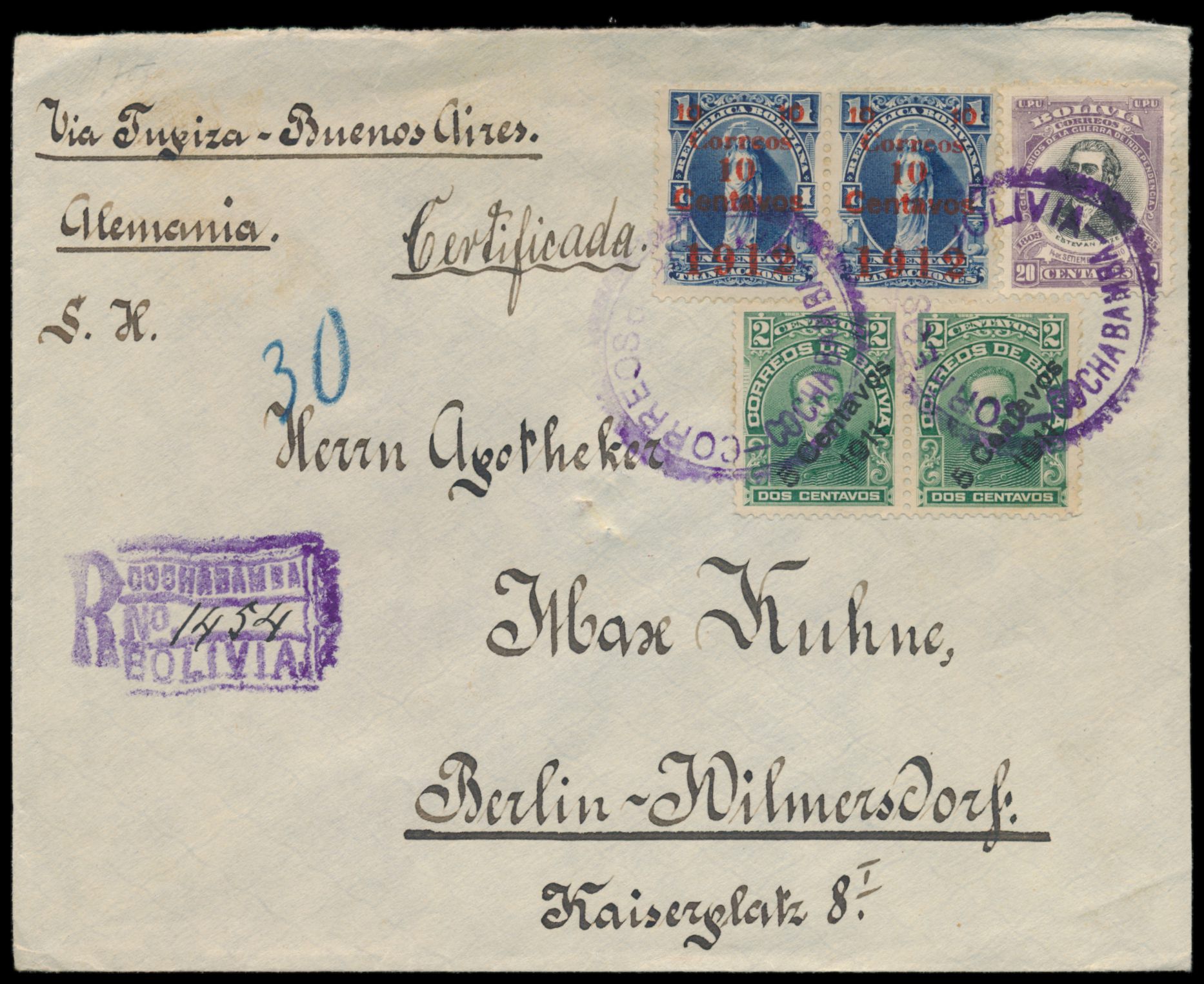 Mischfrankatur 20 C. Esteban Arze mit Aufdruckprovisorien 1911 2 x 5 C. und 1912 2 x 10 C. auf Einschreibbrief von Cochabamba (26.5.1912) nach Deutschland, Leitvermerk "via Tuyiza - Buenos Aires", violetter R-Stempel mit handschriftlicher Nr., Ankunftstempel Berlin 10.7.12, Bedarf, dekorativ