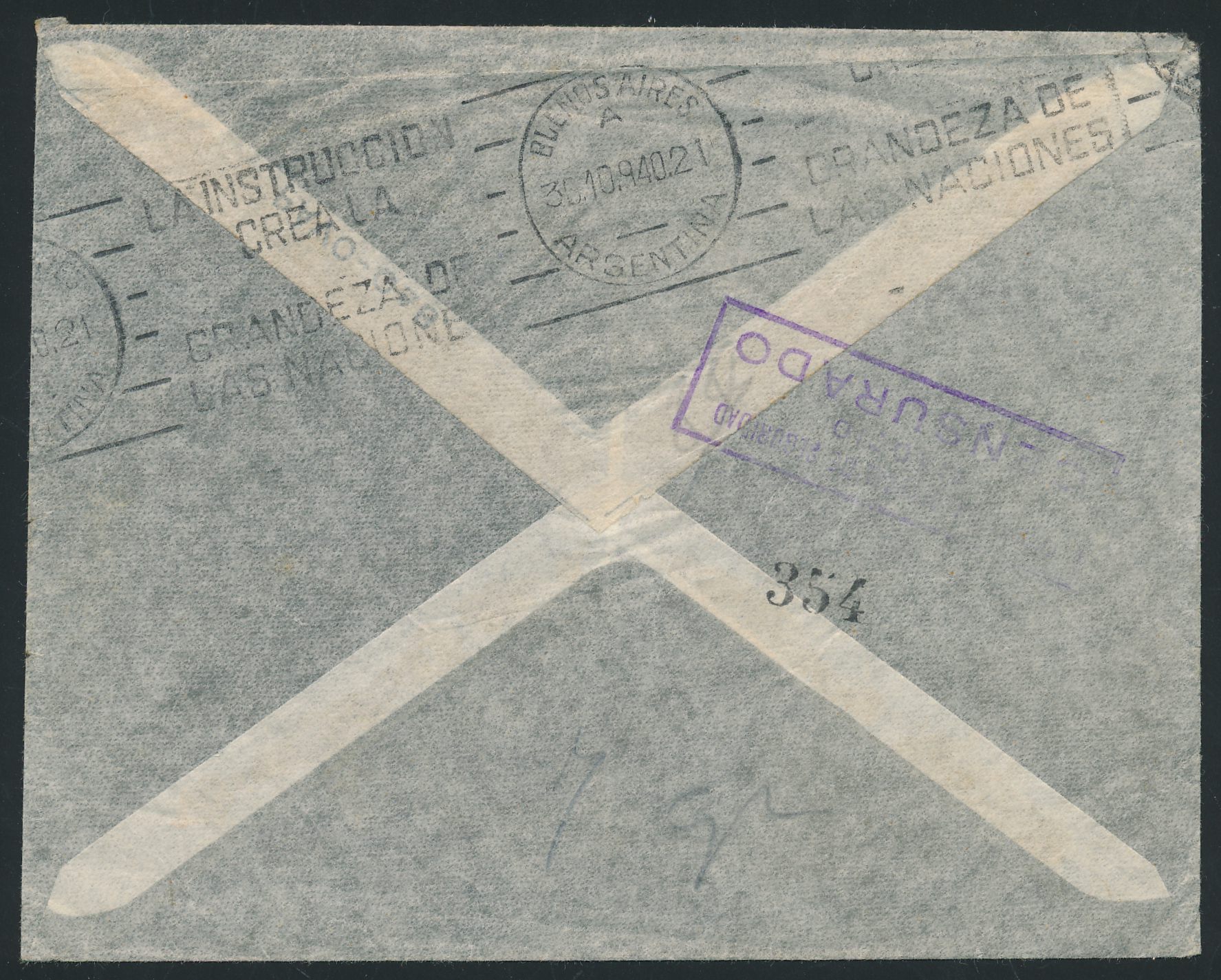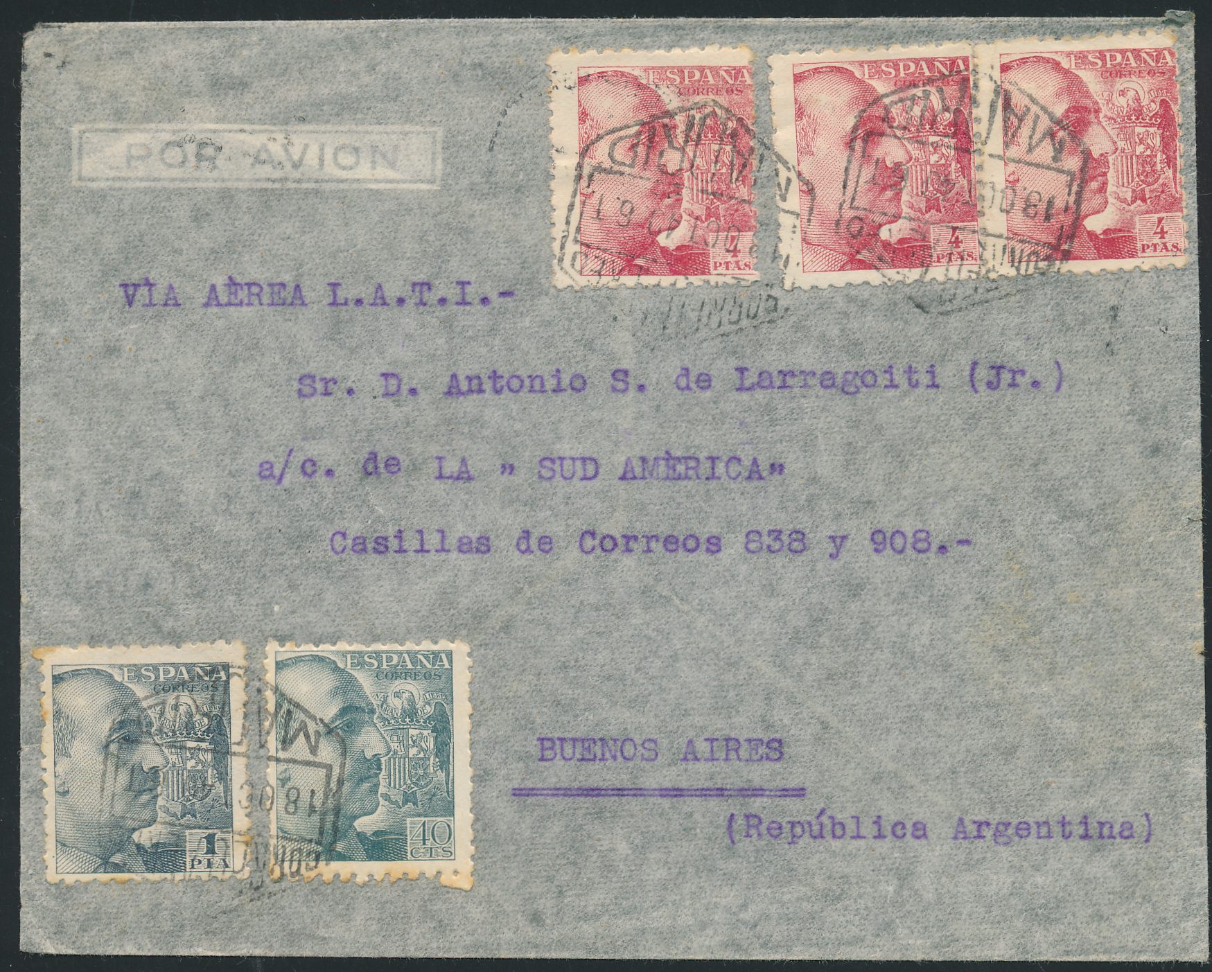 Spanien: 40 C., 1 Pta. und 3 x 4 Pts. auf Luftpostbrief mit L.A.T.I.-Leitvermerk nach Buenos Aires, Stempel Madrid 18.10.40, rückseitig Zensurstempel von Madrid, Ankunftsstempel Buenos Aires 30.10.40
