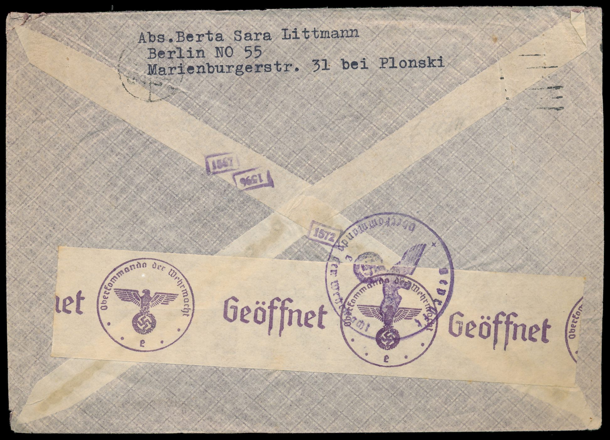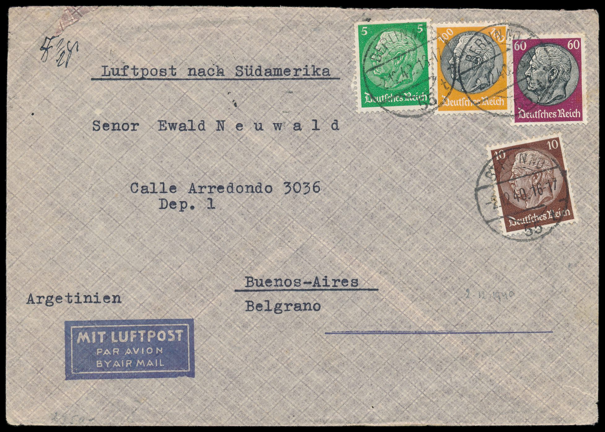 Deutsches Reich, Luftpostbrief mit Hindenburg-Frankatur 175 Pf. nach Buenos Aires, Stempel Berlin NO 55 2.12.40, Absender mit jüdischem Zwangsnamen "Sara" , rückseitig Zensur Frankfurt, vermutlich mit LATI-Flug am 14.12.1940 von Rom nach Rio de Janeiro