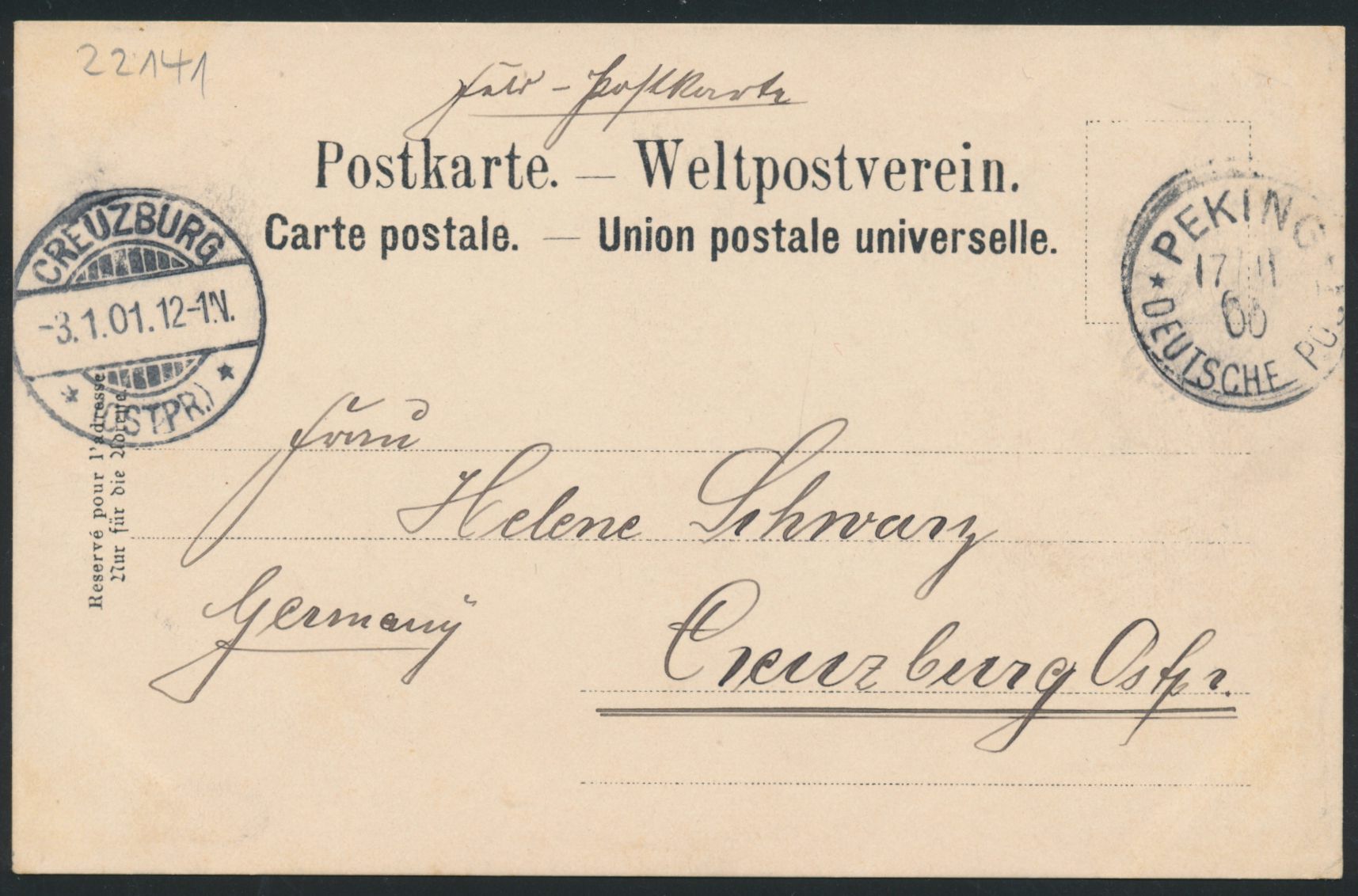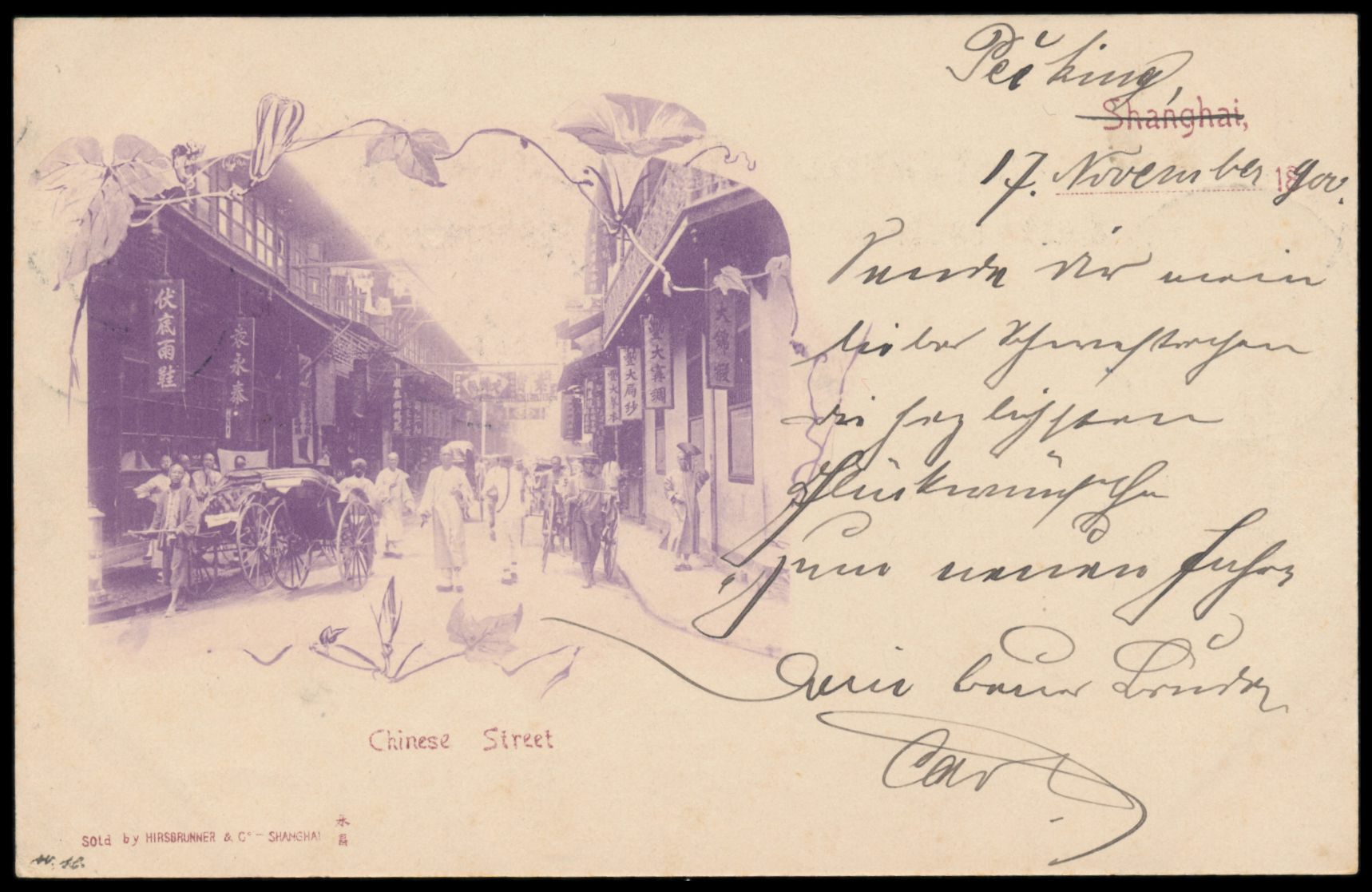 frühe Ansichtskarte Shanghai - Chinese Street, Verlag Hirsbrunner & Co., Shanghai, verwendet als Feldpostkarte nach Deutschland, Stempel Peking 17.11.01, Ankunftstempel Creuzburg (Ostpr.) 3.1.01, Bedarf