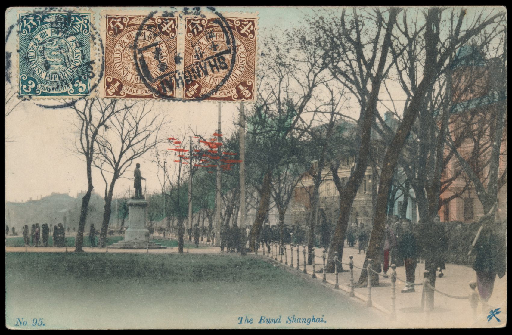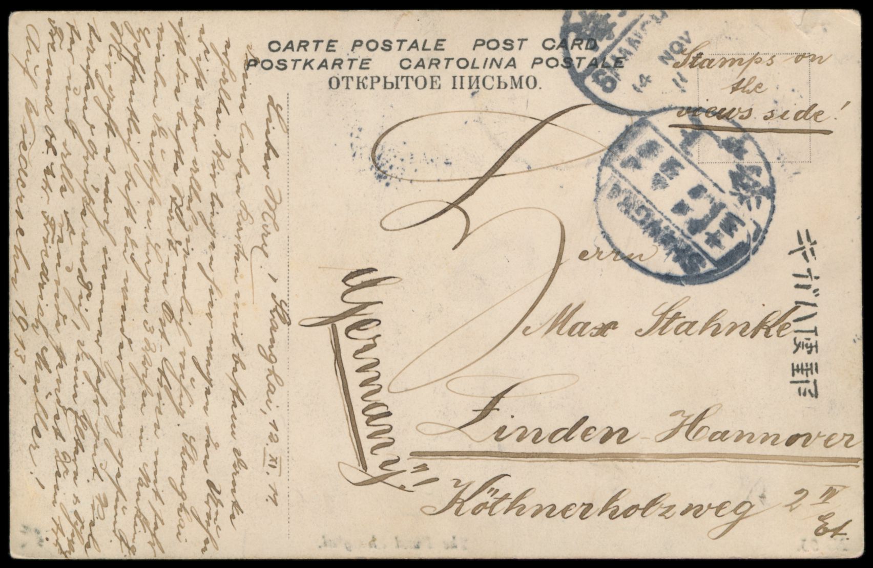 The Bund Shanghai; kolorierte Ansichtskarte mit bildseitig 2 x C.I.P. 1/2 C. und 3 C. mit Stempel Shanghai 14.11.11 nach Deutschland, Bedarf