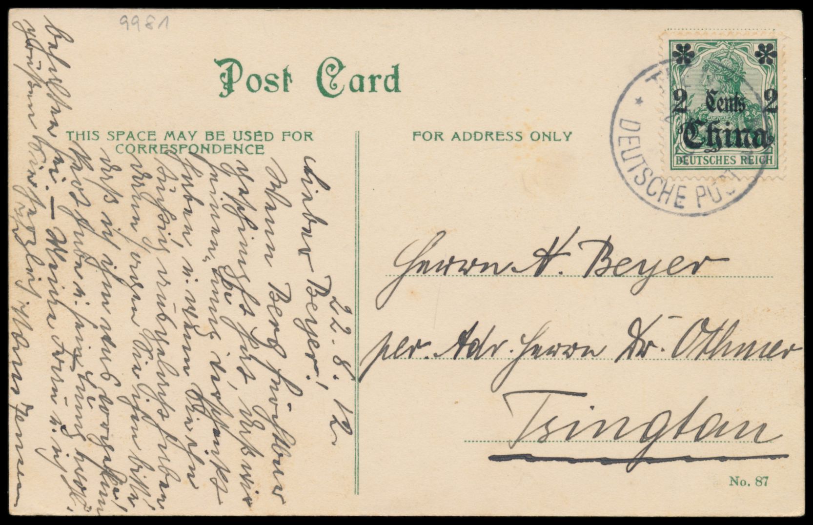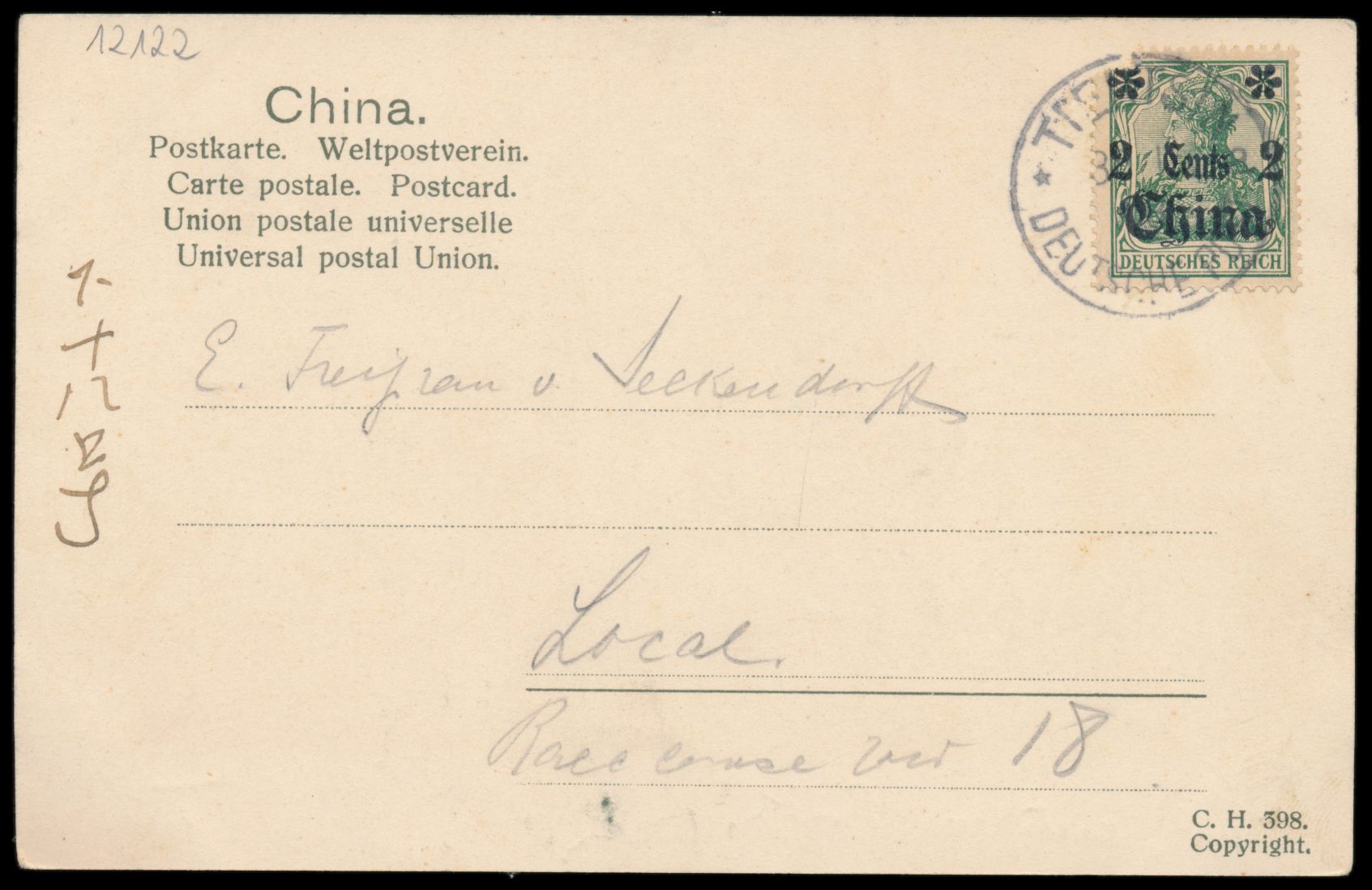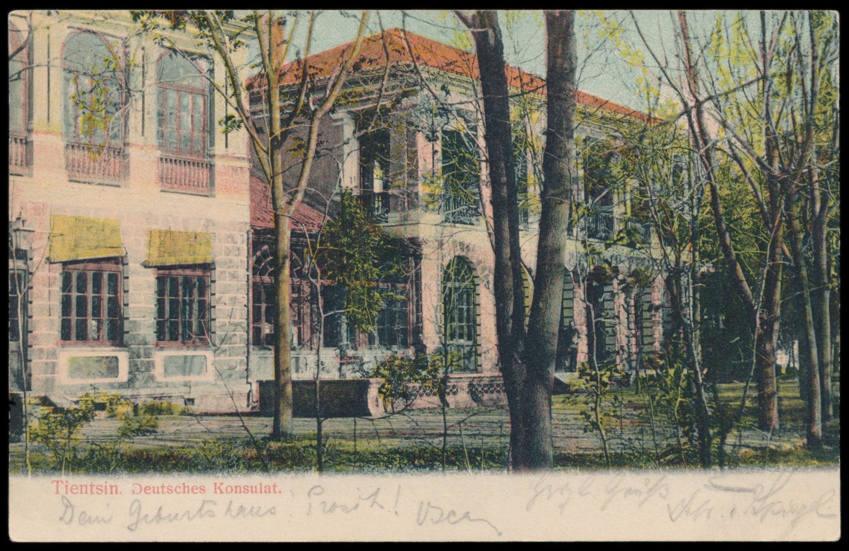 kolorierte Ansichtskarte Tientsin. Deutsches Konsulat, Frankatur Deutsche Post 2 C. (kleiner Eckfehler), Stempel Tientsin 30.1.1908, Ortskarte, Bedarf