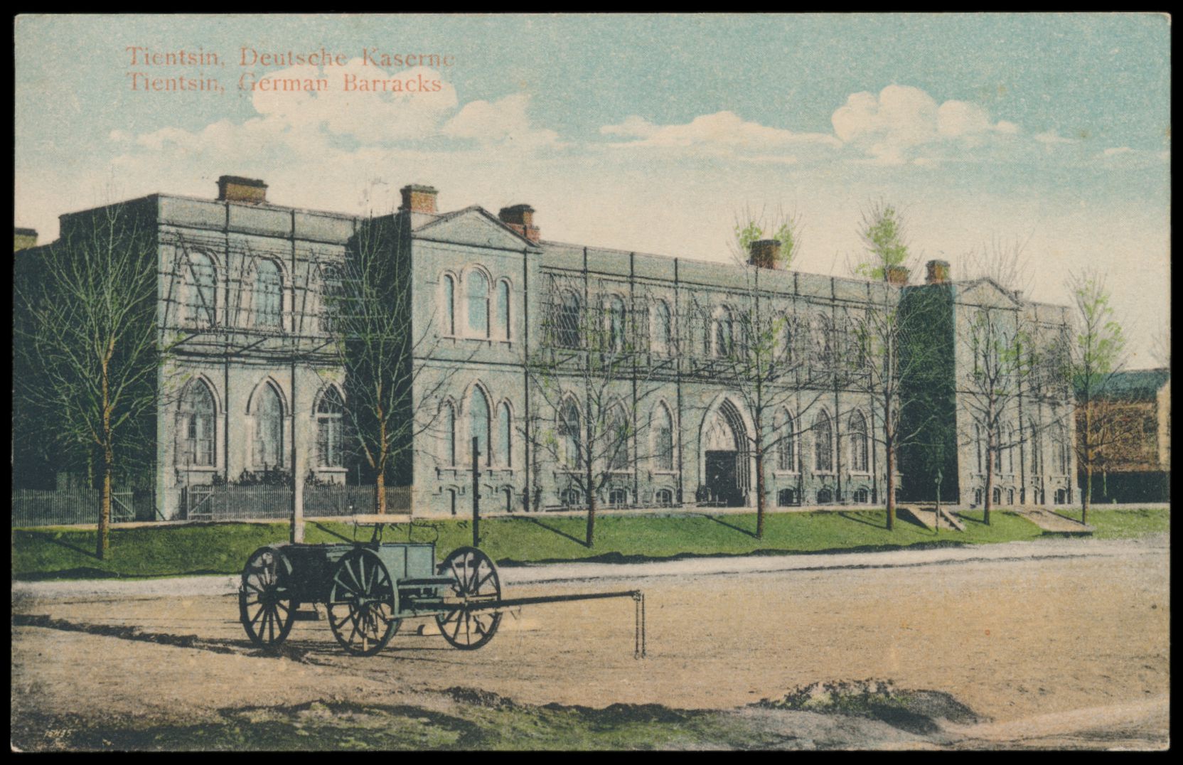 mehrfarbige Ansichtskarte Tientsin, German Barracks, Frankatur Deutsche Post 2 C., Stempel Tientsin a 23.8.12, nach Tsingtau, Bedarf