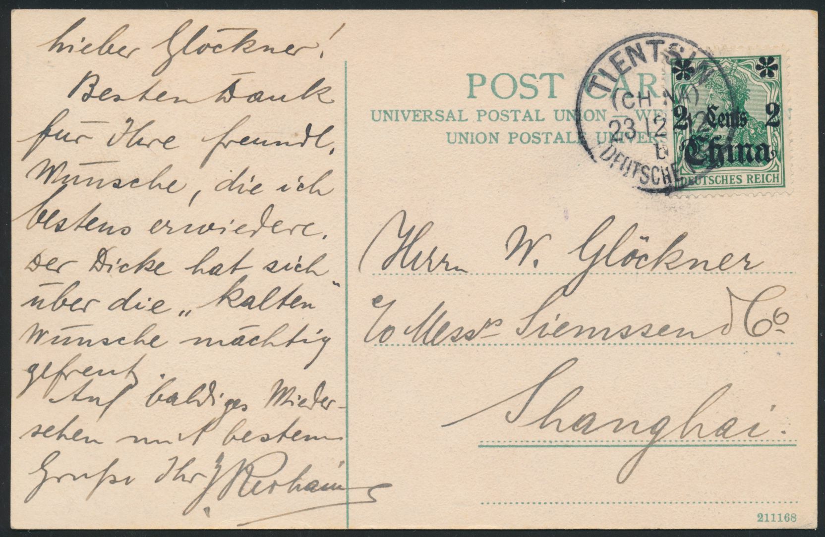 Ansichtskarte Pei-Tai-Ho nach Deutschland, Frankatur C.I.P. 2 x 1/2 C., 1 C. und 2 C. mit blauem Stempel Tientsin 28.10.00 in Doppelfrankatur mit Französische Post 10 C. mit Stempel Shanghai / Chine 1.11.00, französischer Seepoststempel 1.11.00 als Durchgangsstempel, Ankunftstempel Berlin 5.12.00, Bedarf