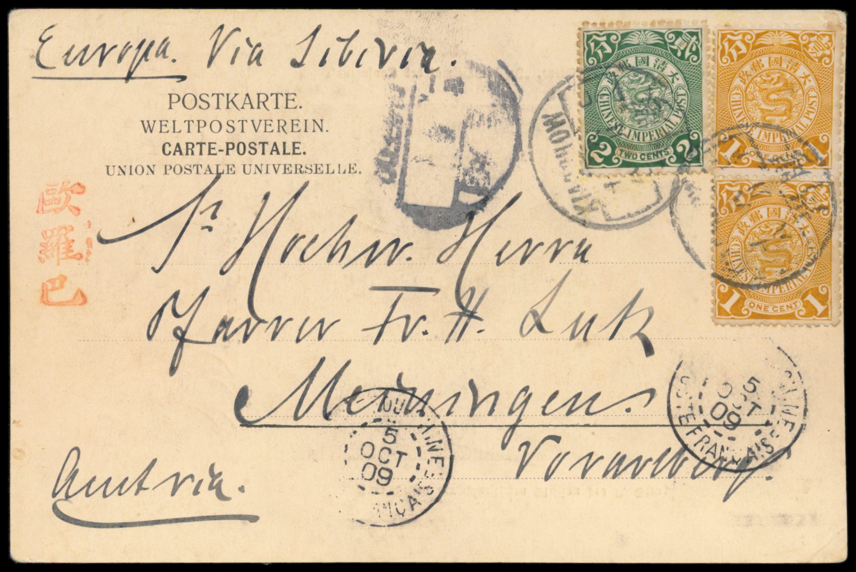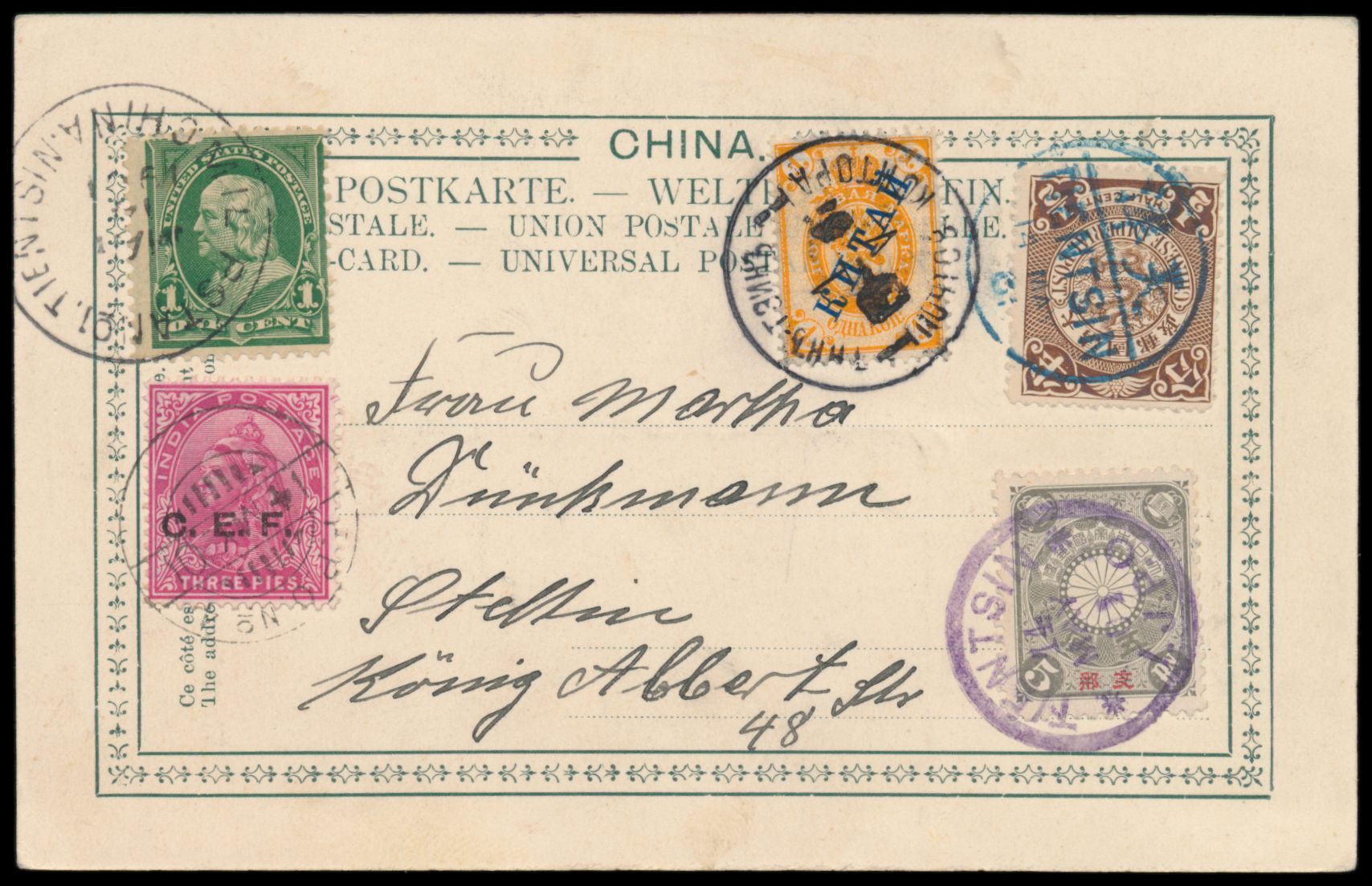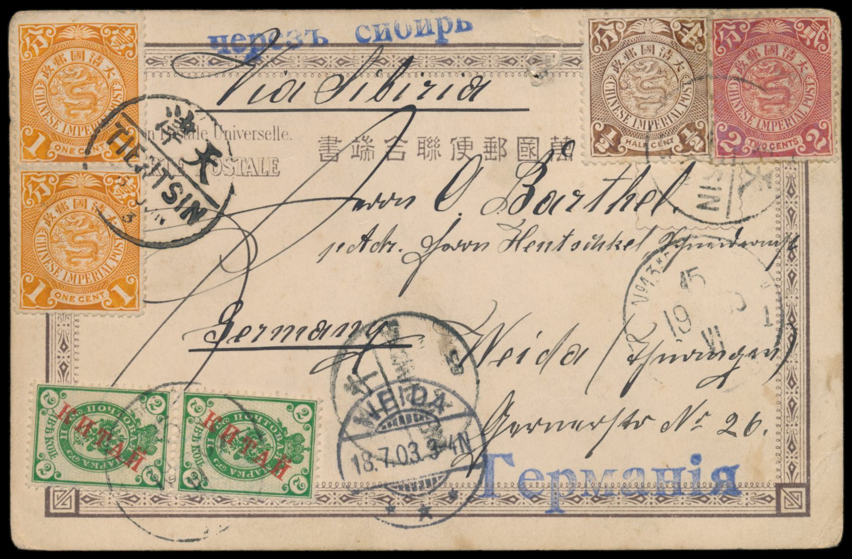 C.I.P. 1/2 C., 2 x 1 C. und 2 C. auf Ansichtskarte mit Stempel Tientsin 6.6.03 via Sibirien nach Deutschland, russischer Leitstempel und 2 x 2 Kop. "Kitai" mit Stempel No. 3 Reserve Feldpostamt 15.6. / 28.6. 1903 in Shanhaikuan, Doppelfrankatur wegen Beförderung über Sibirien erforderlich, chinesischer Durchgangsstempel Newchwang, Ankunftstempel Weida 18.7.03, schwache Alterungsspuren und oben unauffälliger kleiner Einriss neben der Frankatur, Bedarf