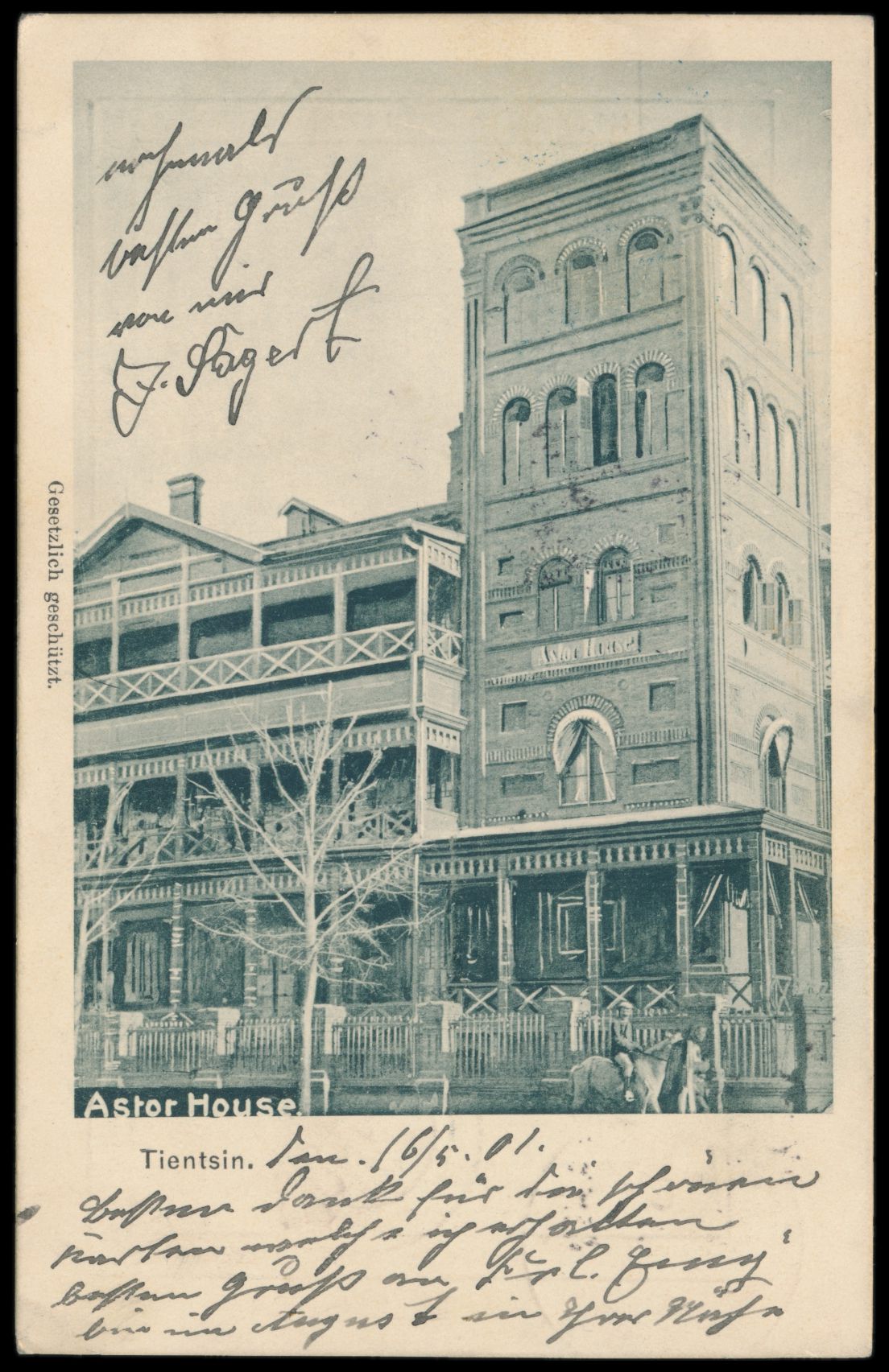 1901: Ansichtskarte Tientsin - Astor House mit Fünf-Länder-Frankatur: China, Indien, Japan, Russland und USA mit den Stempeln der verschiedenen Postämter in Tientsin, nach Deutschland, Bedarf