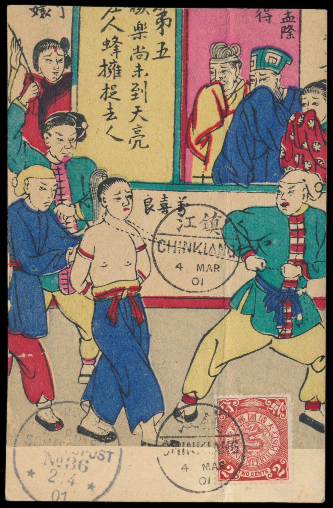 2 C. C.I.P. rückseitig auf deutscher Feldpost-Vordruckkarte mit rückseitig aufgeklebten Bild "Gerichtsszene" (?) (Druck, keine Tuschezeichnung), 2 x Stempel Chinkiang 4.3.01 und Stempel Kais. Deutsche Marine-Schiffspost No. 36 2.4.01 (S.M.S. Geier in Chinkiang), adressiert nach Deutschland