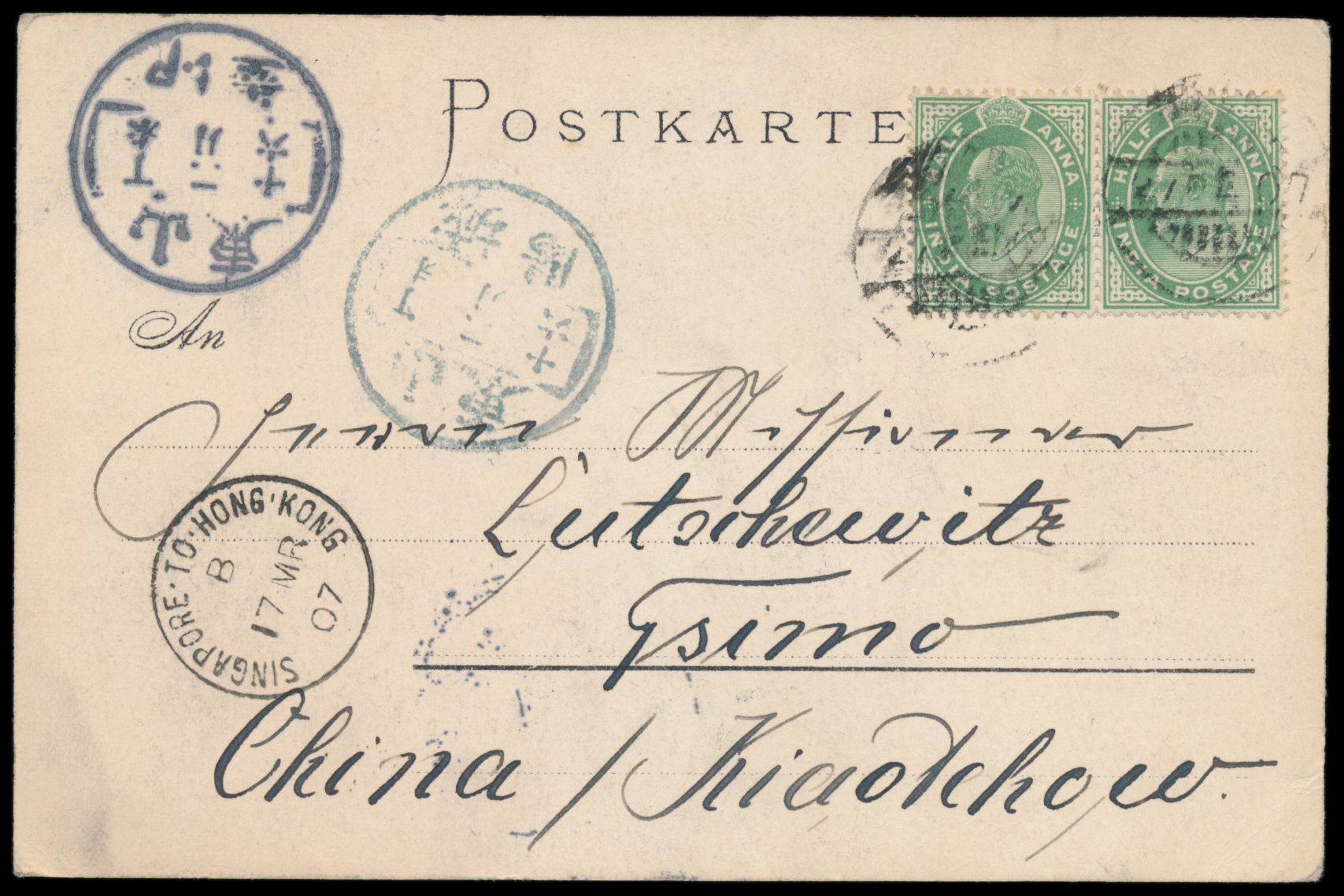 2 x Indien Half Anna auf Ansichtskarte mit Stempel Aden 27.2.07 nach Tsimo, Durchgangsstempel Singapore to Hong-Kong 17.3.02 und zwei chinesische Ankunftstempel, Bedarf