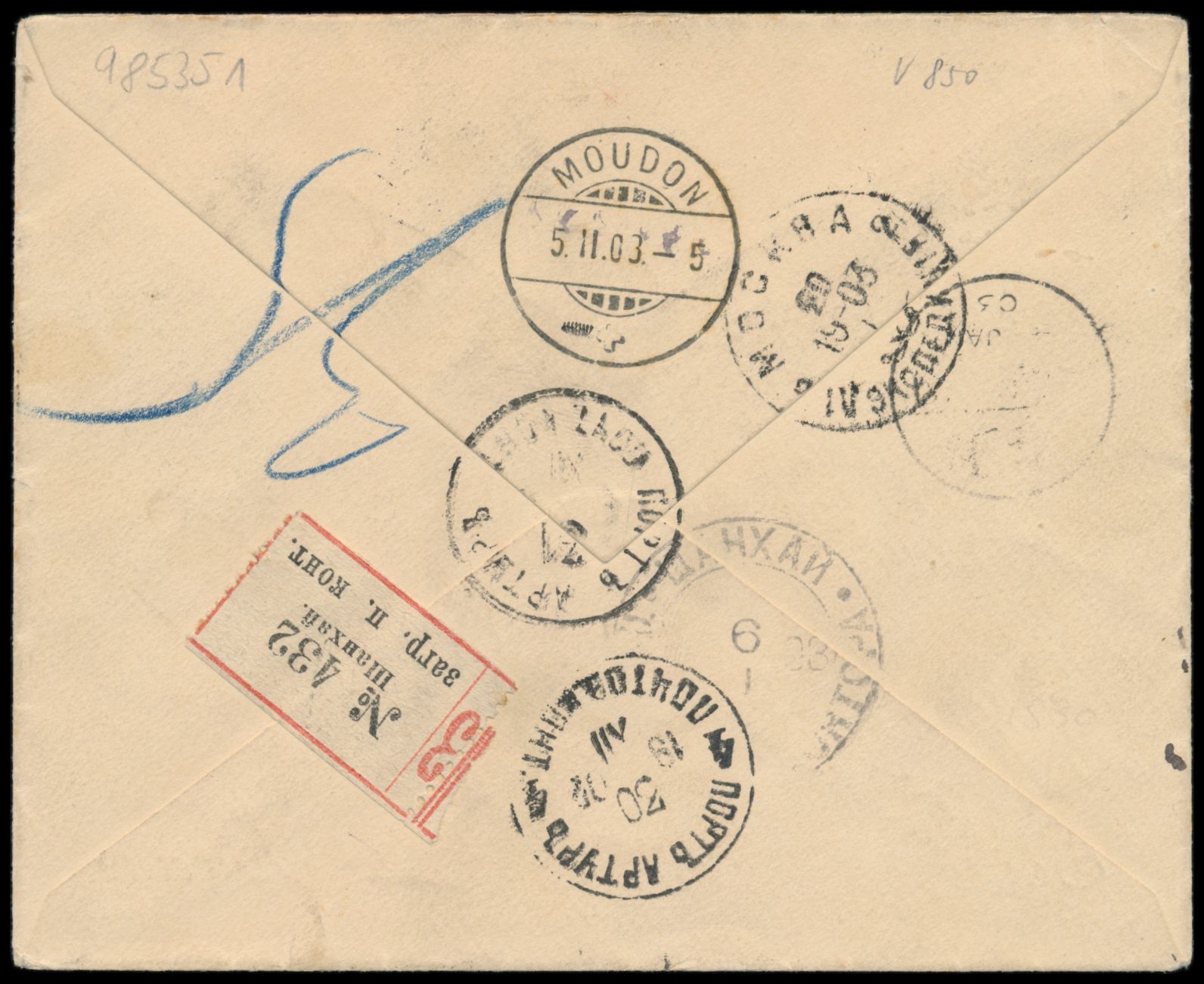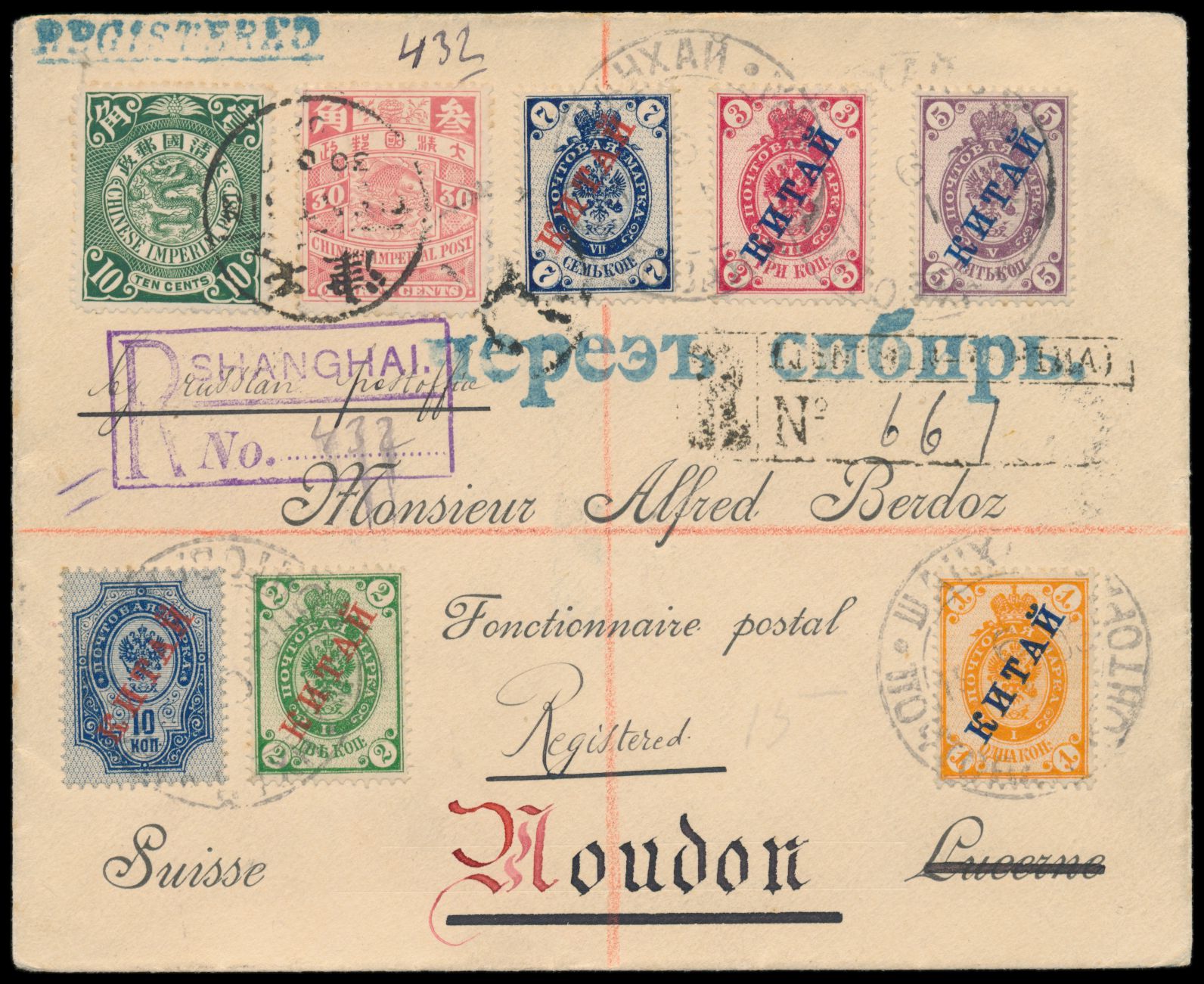 Einschreibbrief mit Doppelfrankatur China C.I.P. 10 C. und 30 C. mit Stempel Tientsin 30.12.02 und Russische Post 1 Kop. bis 10 Kop. mit Stempel Shanghai 6.1.1903 in die Schweiz, chinesischer und russischer R-Stempel, rückseitig zusätzlich russischer 3-Zettel, befördert über Sibirien, Durchgangsstempel Port Arthur 30.12.02 und Moskau 20.1.1903, Ankunftstempel Moudon 5.2.03
