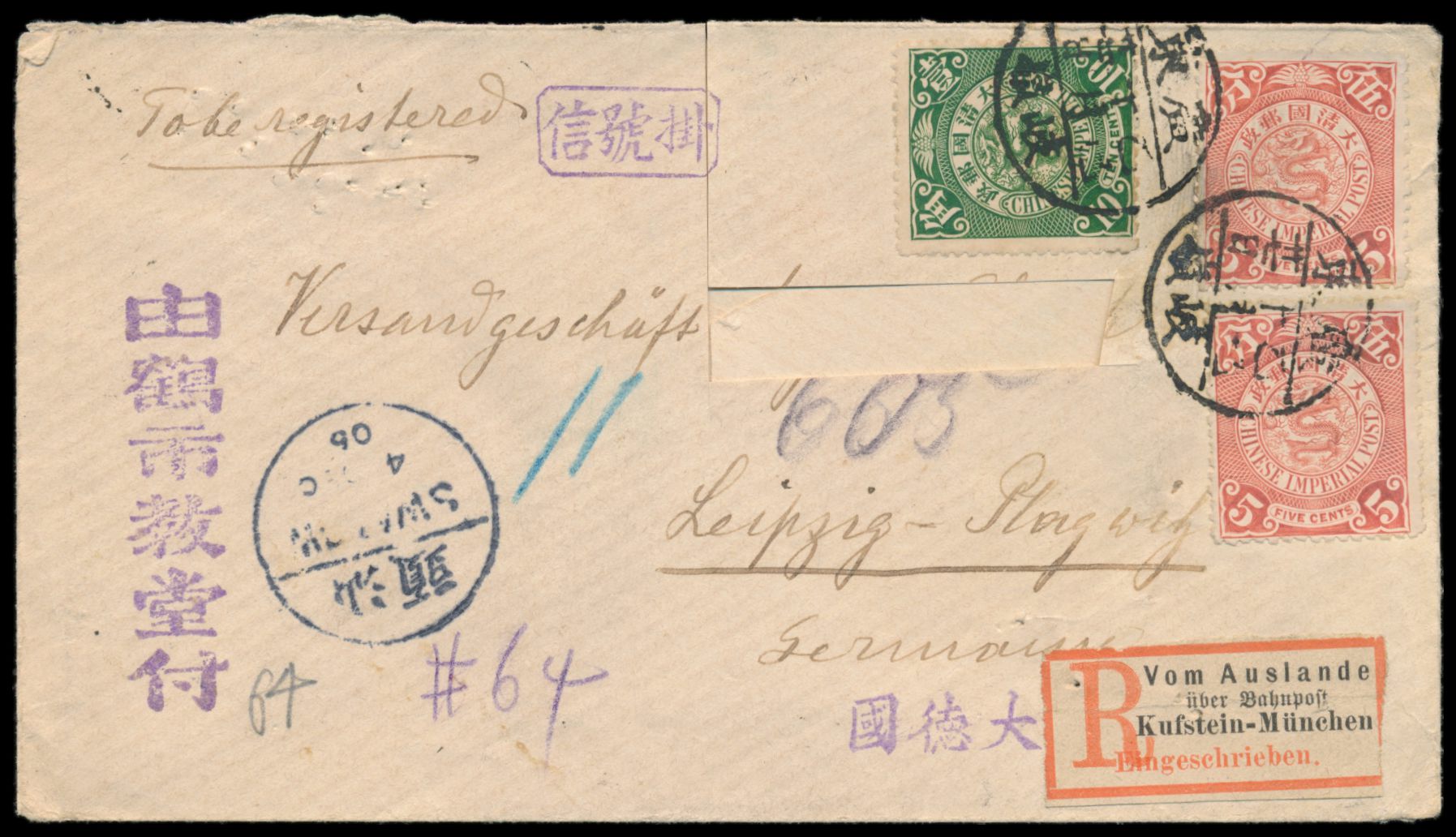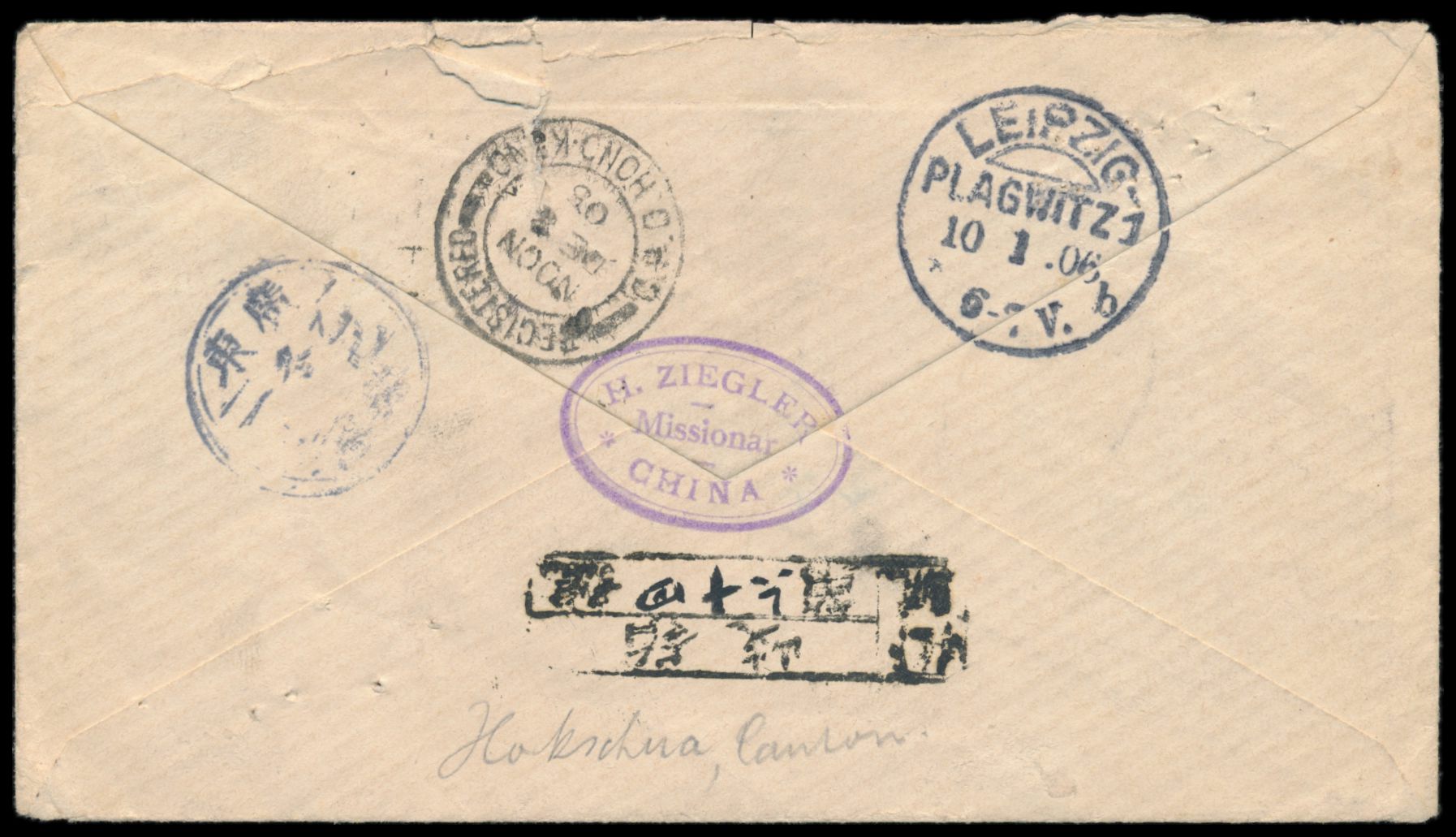 2 x C.I.P 5 C. und 10 C. auf Einschreibbrief des Missionars H. Ziegler (Absenderstempel) mit Lunar Dater Hokschua (?) nach Deutschland, rückseitig chinesischer Einschreibstempel, Durchgangsstempel Swatow 4.12.05 und Registered G.P.O. Hong-Kong 8.12.05, in Deutschland R-Zettel "Vom Auslande über Bahnpost Kufstein - München" , Ankunftsstempel Leipzig 10.1.06, Empfängername ausgeschnitten, Bedarf