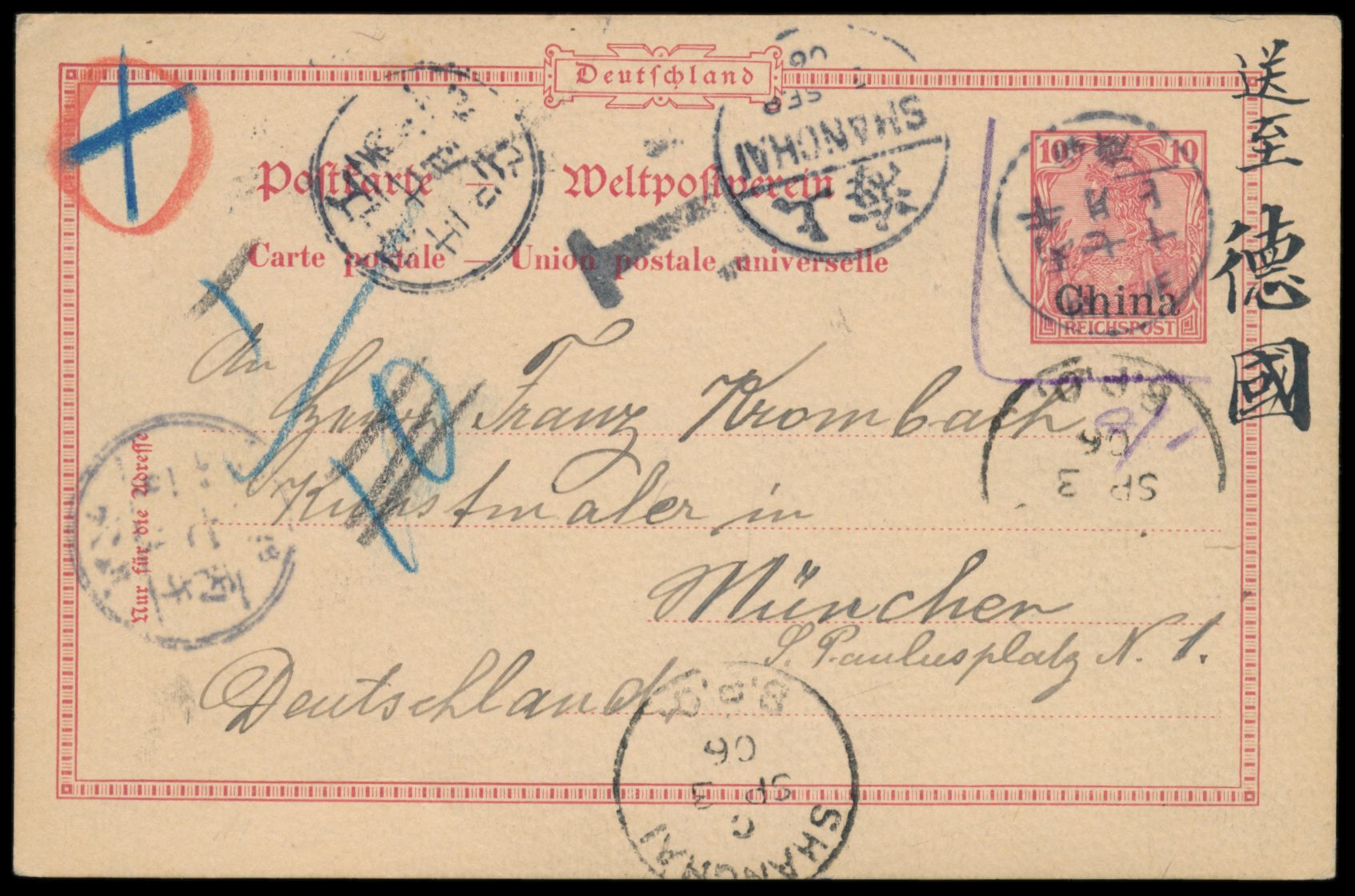 Ganzsache Deutsche Post 10 Pf., geschrieben "Kathol. Mission Hankow" am 29.8.06, befördert durch die chinesische Post, verschiedene Lunar Dater, Taxstempel "T", Durchgangsstempel Shanghai 2.9.06 und 3.9.06 des chinesischen und des britischen Postamts, Bedarf