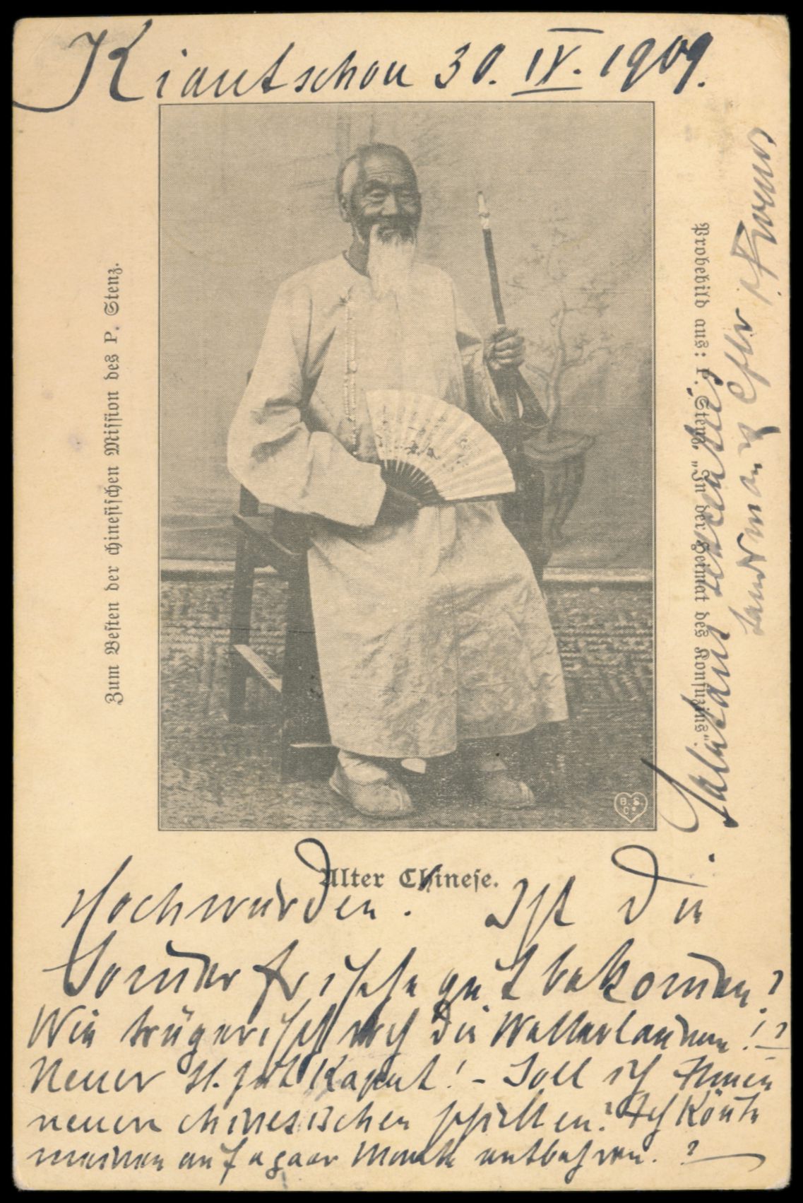C.I.P. 2 x 1 C. und 2 C. mit Stempel Kiaochow auf Ansichtskarte "Alter Chinese" nach Deutschland, Durchgangsstempel des französischen Postamts Chefoo 5.10.09, Bedarf