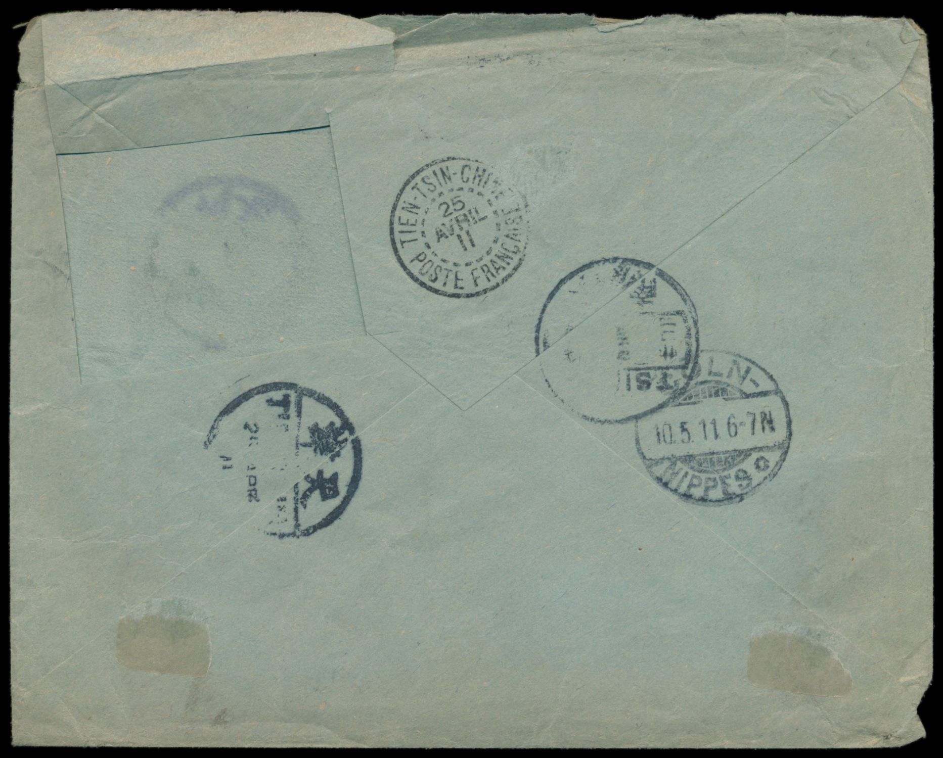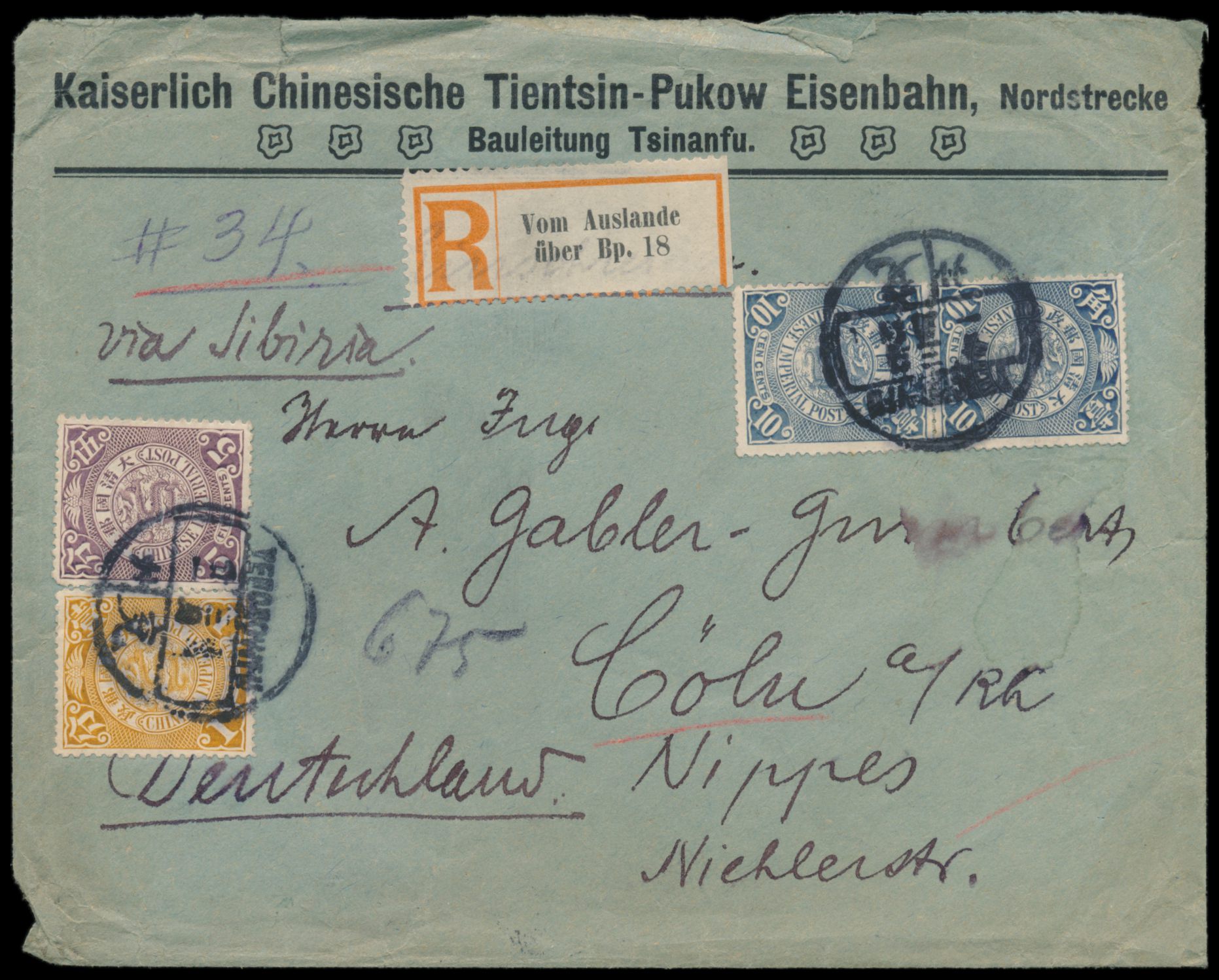 Vordruckumschlag "Kaiserlich Chinesische Tientsin-Pukow Eisenbahn, Nordstrecke / Bauleitung Tsinanfu" als Einschreibbrief nach Deutschland, vorderseitig C.I.P. 1 C., 5 C. und 2 x 10 C., rückseitige Frankatur ausgeschnitten!, Stempel Yenchowfu, handschriftlicher R-Vermerk, Durchgangsstempel Tsinanfu und Tientsin 25.4.11, Ankunftstempel Köln 10.5.11