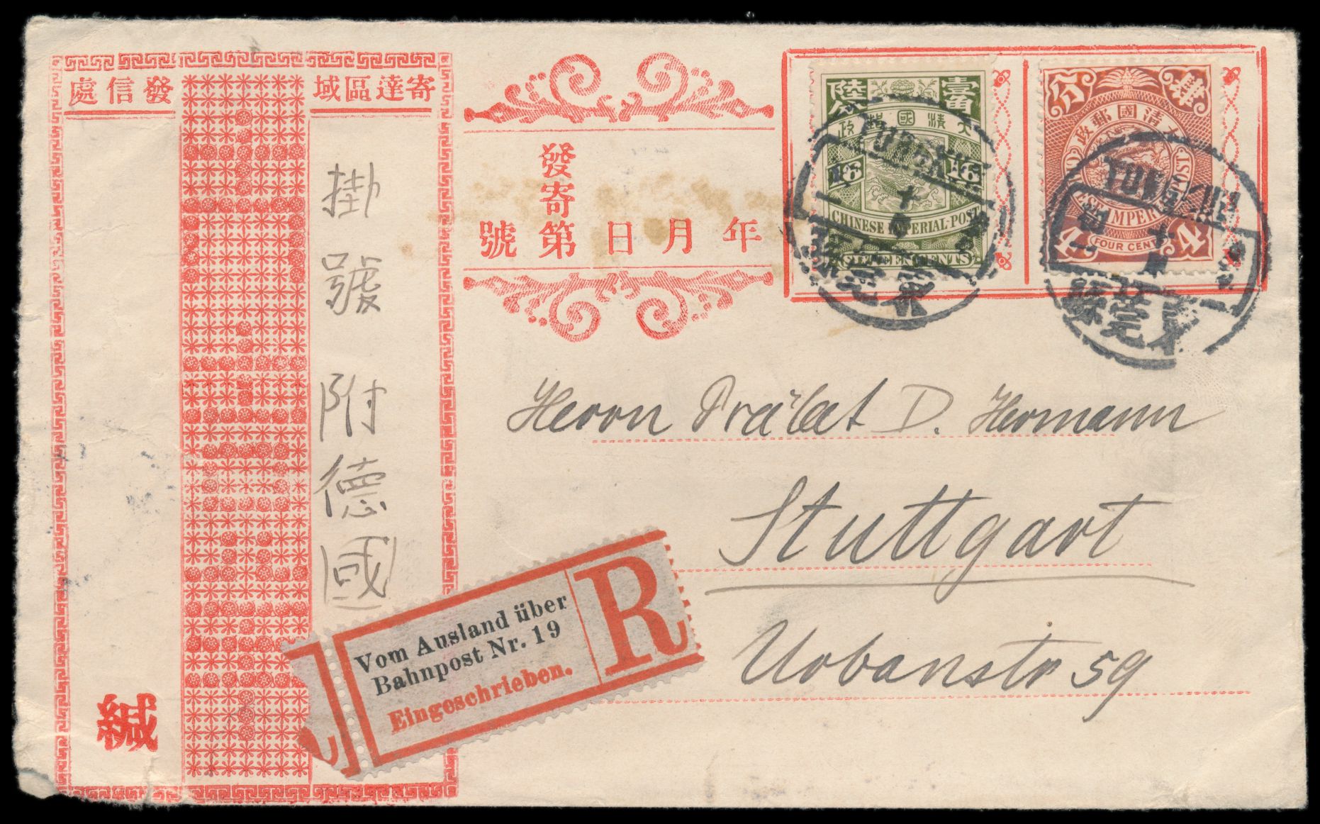 4 C. und 16 C. C.I.P. auf dekorativem Vordruckumschlag als Einschreiben nach Deutschland, Stempel Tungkun , rückseitig R-Stempel von Tungkun, Durchgangsstempel Sheklung und Registered G.P.O. Hongkong 1.10.12, in Deutschland R-Zettel "Vom Ausland über Bahnpost Nr. 19" , Ankunftstempel Stuttgart 30.10.12, Bedarf