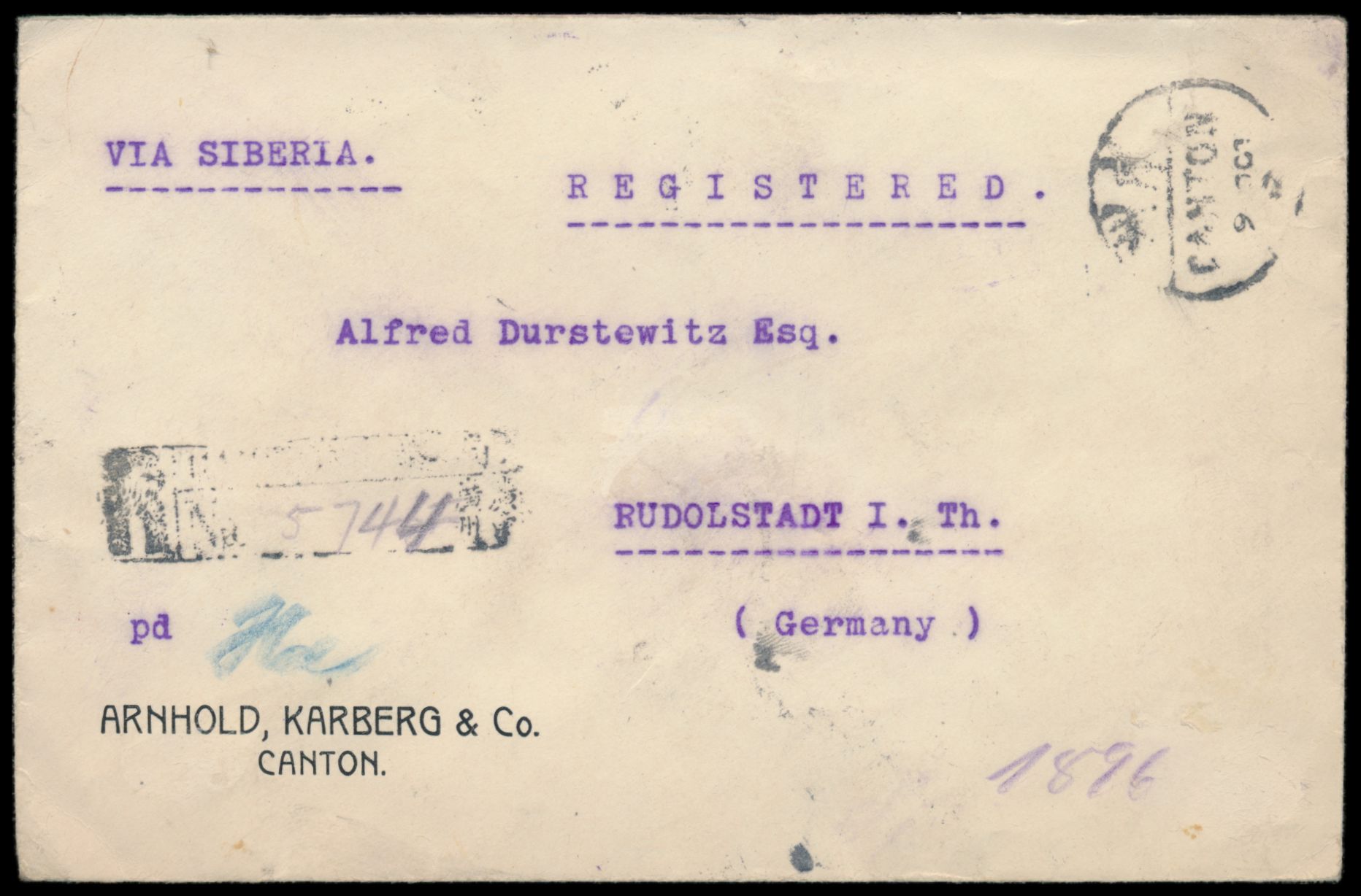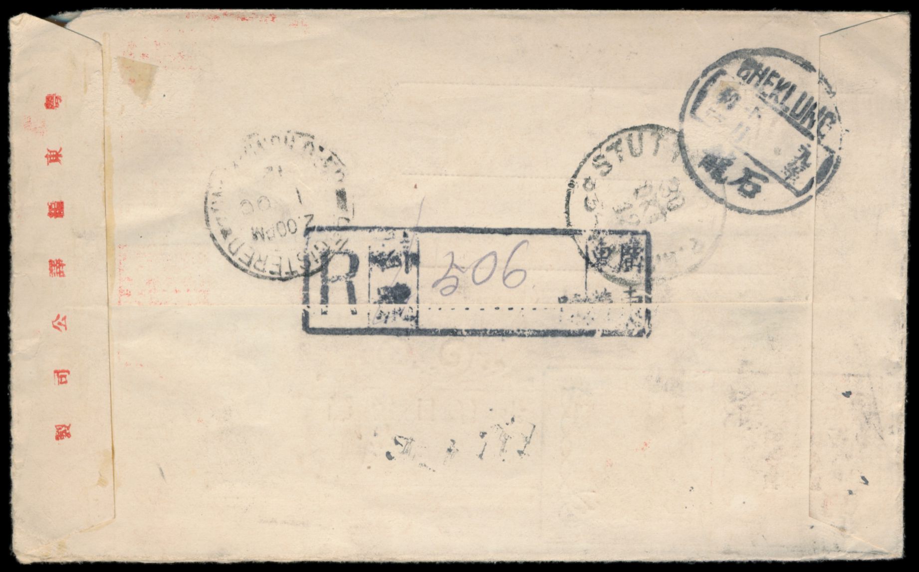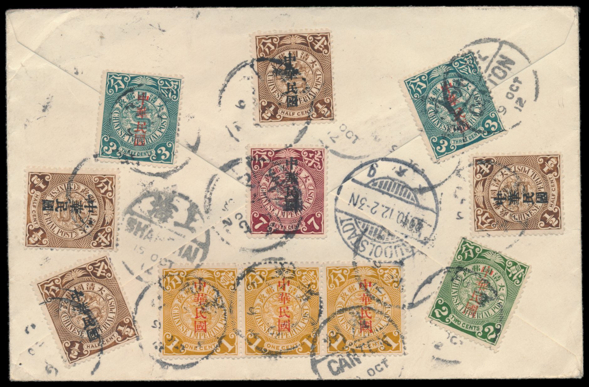 Republik: C.I.P. 4 x 1/2 C., 3 x 1 C., 2 C., 2 x 3 C. und 7 C. mit kurzem Aufdruck rückseitig auf Einschreibbrief nach Deutschland, Stempel Canton 9,10.12, chinesischer R-Stempel mit handschriftlicher Nr., Durchgangsstempel Shanghai 15.10.12, Ankunftstempel Rudolstadt 29.10.12, ungewöhnliche Darstellung des 20 C.-Tarifs, portorichtig, Bedarf