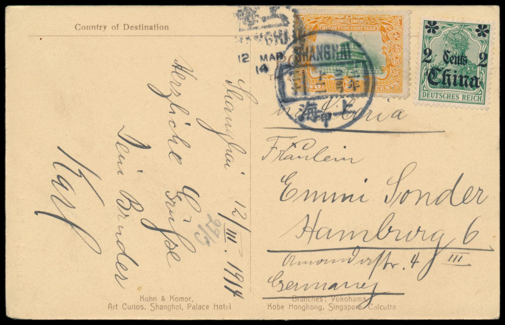 1. Regierungsjahr des neuen Kaisers 2 C. zusammen mit Deutsche Post 2 C. auf Ansichtskarte "Shanghai - Bund" nach Deutschland, Stempel Shanghai 12.3.1914, Bedarf