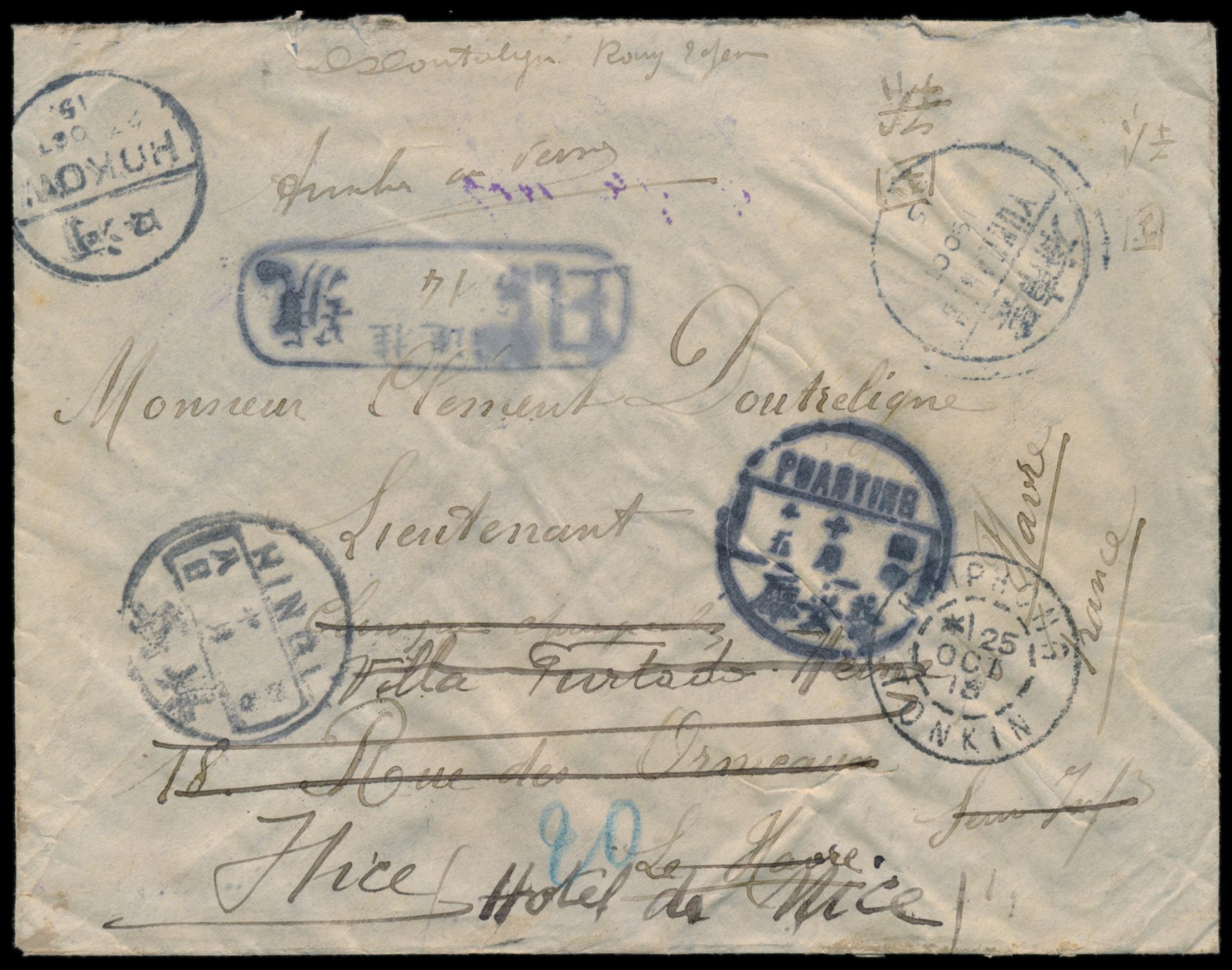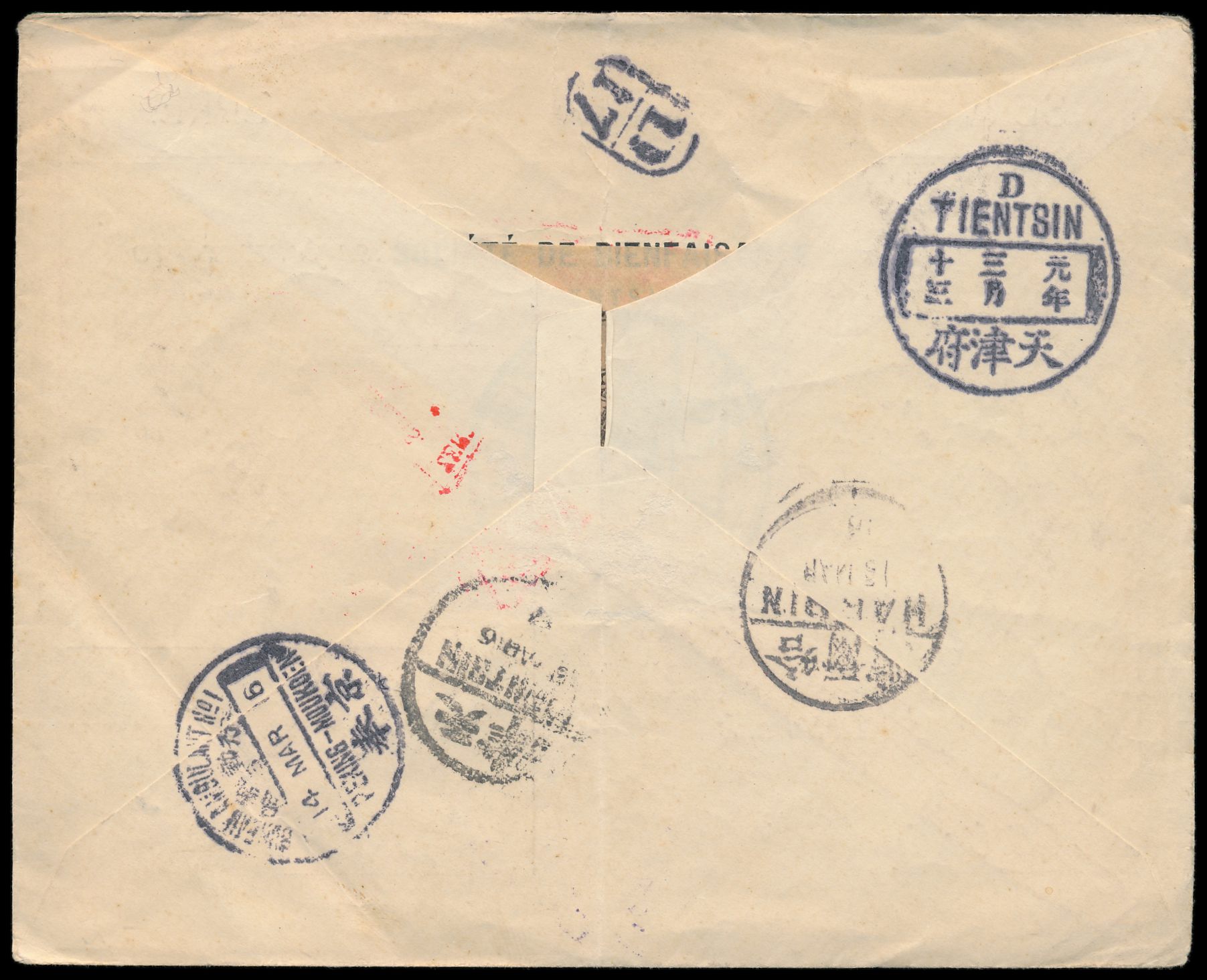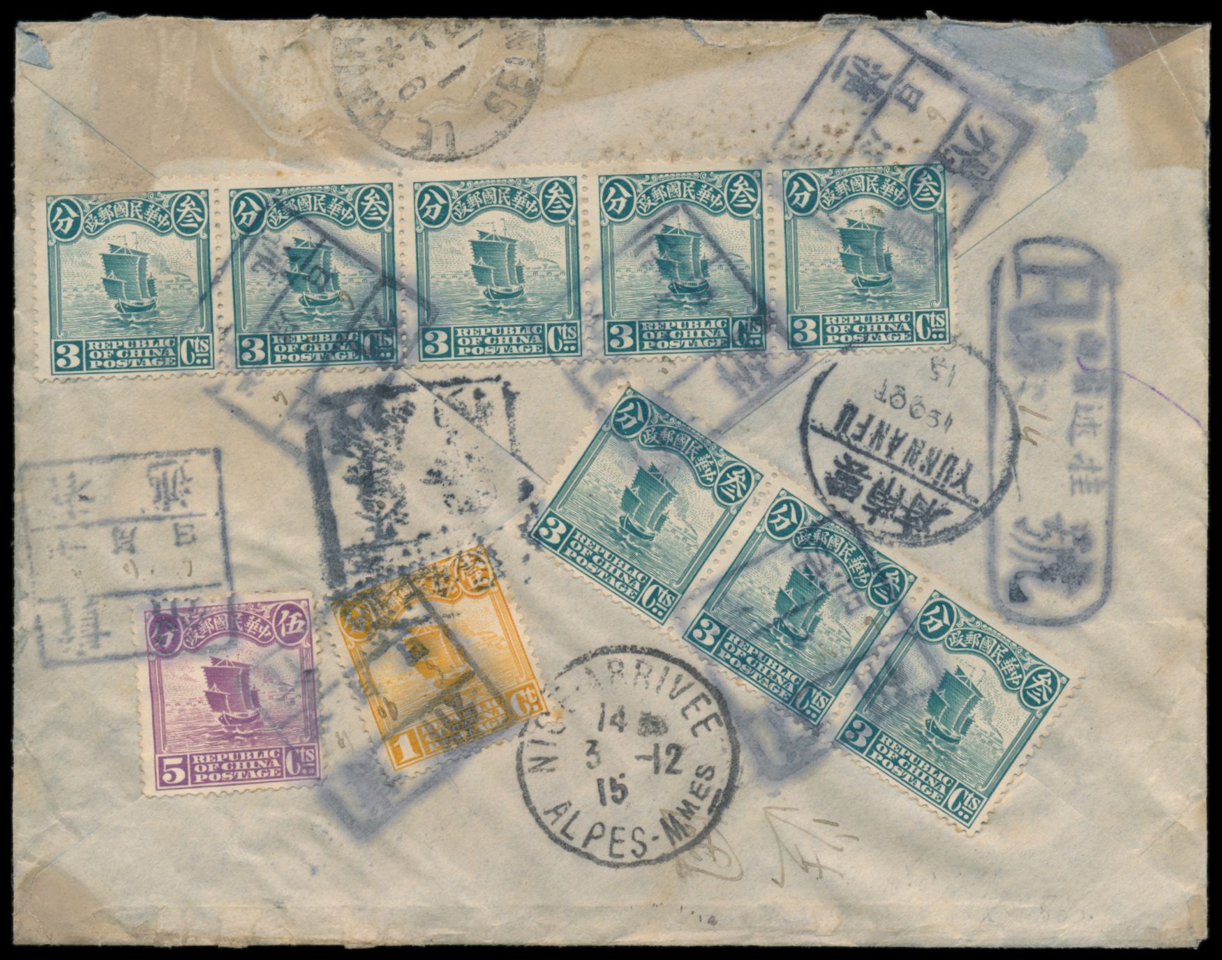 1 C., 8 x 3 C. und 5 C. Dschunke rückseitig auf Einschreibbrief via Französisch-Indochina nach Frankreich, Entwertung durch quadratischen Rahmenstempel ("... Gui Shu", Ort?) , weiterer "Tombstone"-Stempel und Stempel Hingi, Phanting, Yünanfu 19.10.15 und Hokow 23.10.15, Haiphong / Tonkin 25.10.15 als Durchgangsstempel, innerhalb Frankreichs nachgesandt, Ankunftstempel Nice 3.12.15. Vorder- und Rückseite des Umschlages sind ganzflächig verklebt und ist dadurch wellig, Beförderungsspuren, Bedarf